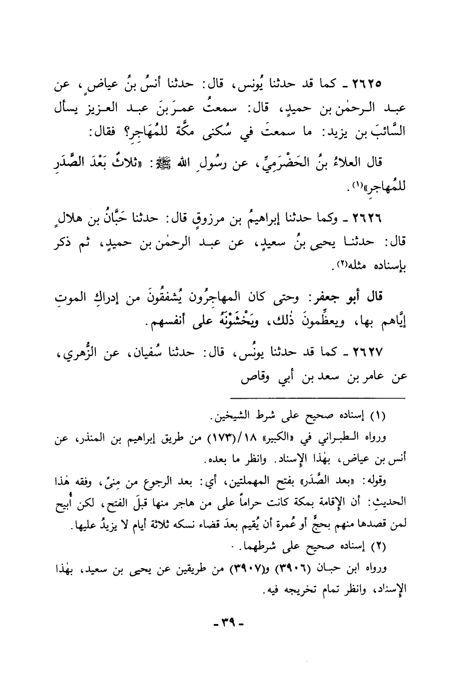 2628 - وَكَمَا حَدَّثَنَا يُونُسُ قَالَ: أَنْبَأَنَا ابْنُ وَهْبٍ أَنَّ مَالِكًا، أَخْبَرَهُ: ح. وَكَمَا حَدَّثَنَا الْمُزَنِيُّ قَالَ: حَدَّثَنَا الشَّافِعِيُّ، عَنْ مَالِكٍ، عَنِ ابْنِ شِهَابٍ، عَنْ عَامِرِ بْنِ سَعْدِ بْنِ أَبِي وَقَّاصٍ، عَنْ سَعْدِ بْنِ أَبِي وَقَّاصٍ قَالَ: جَاءَنِي رَسُولُ اللهِ صَلَّى اللَّهُ عَلَيْهِ وَسَلَّمَ يَعُودُنِي عَامَ حَجَّةِ الْوَدَاعِ مِنْ وَجَعٍ اشْتَدَّ بِي , ثُمَّ ذَكَرَ الْحَدِيثَ. أَفَلَا تَرَى إِلَى مَنْعِ رَسُولِ اللهِ صَلَّى اللَّهُ عَلَيْهِ وَسَلَّمَ بَعْدَ فَتْحِ مَكَّةَ الْمُهَاجِرِينَ إِلَيْهِ قَبْلَ ذَلِكَ إِلَى الْمَدِينَةِ مِنَ الرُّجُوعِ إِلَى مَكَّةَ إِذْ كَانُوا قَدْ هَاجَرُوا مِنْهَا وَتَرَكُوهَا لِلَّهِ عَزَّ وَجَلَّ إِلَى مَدِينَةِ رَسُولِ اللهِ صَلَّى اللَّهُ عَلَيْهِ وَسَلَّمَ رَغْبَةً فِيهَا , وَمِنَ الْمُقَامِ -[41]- بِهَا إِلَّا مَا لَا يَجِدُونَ مِنْهُ بُدًّا بَعْدَ حَجِّهِمْ إِلَيْهَا مِنَ الْمُقَامِ بِهَا لِيَتَأَهَّبُوا لِخُرُوجِهِمْ مِنْهَا , وَرُجُوعِهِمْ إِلَى دَارِ هِجْرَتِهِمْ , وَمِنْ إِطْلَاقِ رَسُولِ اللهِ صَلَّى اللَّهُ عَلَيْهِ وَسَلَّمَ ذَلِكَ لِمَنْ سِوَاهُمْ مِمَّنْ كَانَ إِسْلَامُهُ بَعْدَ فَتْحِ مَكَّةَ فَلَا دَلِيلَ أَدَلَّ عَلَى انْقِطَاعِ الْهِجْرَةِ بِفَتْحِ مَكَّةَ بَعْدَمَا رَوَيْنَاهُ عَنْ رَسُولِ اللهِ صَلَّى اللَّهُ عَلَيْهِ وَسَلَّمَ فِي ذَلِكَ فِي هَذَا الْبَابِ مِنْ هَذَا. وَقَدْ رُوِيَ عَنْ ثَلَاثَةٍ مِنَ الْأَنْصَارِ فِي هَذَا الْبَابِ وَهُمْ أَبُو سَعِيدٍ الْخُدْرِيُّ وَزَيْدُ بْنُ ثَابِتٍ وَرَافِعُ بْنُ خَدِيجٍ عَنْ رَسُولِ اللهِ صَلَّى اللَّهُ عَلَيْهِ وَسَلَّمَ بِتَوْكِيدِ هَذَا الْمَعْنَى يَقُولُونَ كَانَ مِنْ رَسُولِ اللهِ صَلَّى اللَّهُ عَلَيْهِ وَسَلَّمَ فِيهِ بَعْدَ إِنْزَالِ اللهِ عَزَّ وَجَلَّ: إِذَا جَاءَ نَصْرُ اللهِ وَالْفَتْحُ وَبَعْدَ قِرَاءَتِهِ إِيَّاهَا عَلَى النَّاسِ