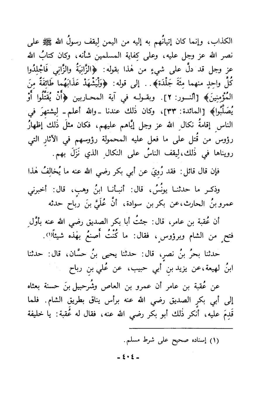 حَدَّثَنَا بَحْرُ بْنُ نَصْرٍ قَالَ: حَدَّثَنَا يَحْيَى بْنُ حَسَّانَ قَالَ: حَدَّثَنَا ابْنُ لَهِيعَةَ عَنْ يَزِيدَ بْنِ أَبِي حَبِيبٍ، عَنْ عَلِيِّ بْنِ رَبَاحٍ، عَنْ عُقْبَةَ بْنِ عَامِرٍ، أَنَّ عَمْرَو بْنَ الْعَاصِ، وَشُرَحْبِيلَ ابْنَ حَسَنَةَ بَعَثَاهُ إِلَى أَبِي بَكْرٍ الصِّدِّيقِ رَضِيَ اللهُ عَنْهُ بِرَأْسِ يَنَّاقِ بِطَرِيقِ الشَّامِ فَلَمَّا قَدِمَ عَلَيْهِ أَنْكَرَ ذَلِكَ أَبُو بَكْرٍ رَضِيَ اللهُ عَنْهُ , فَقَالَ لَهُ عُقْبَةُ يَا خَلِيفَةَ -[405]- رَسُولِ اللهِ صَلَّى اللَّهُ عَلَيْهِ وَسَلَّمَ إِنَّهُمْ يَصْنَعُونَ ذَلِكَ بِنَا , فَقَالَ أَبُو بَكْرٍ رَضِيَ اللهُ عَنْهُ: " أَفَاسْتِنَانٌ بِفَارِسَ وَالرُّومِ، لَا تَحْمِلُوا إِلَيَّ رَأْسًا إِنَّمَا يَكْفِي الْكِتَابُ وَالْخَبَرُ " حَدَّثَنَا أَحْمَدُ بْنُ شُعَيْبٍ قَالَ: حَدَّثَنَا عَمْرُو بْنُ عَلِيٍّ قَالَ: حَدَّثَنَا عَبْدُ الرَّحْمَنِ بْنُ مَهْدِيٍّ قَالَ: حَدَّثَنِي ابْنُ الْمُبَارَكِ، عَنْ سَعِيدِ بْنِ يَزِيدَ، عَنْ يَزِيدَ بْنِ أَبِي حَبِيبٍ , ثُمَّ ذَكَرَ بِإِسْنَادِهِ مِثْلَهُ قَالَ فَهَذَا: أَبُو بَكْرٍ قَدْ أَنْكَرَ حَمْلَ الرُّءُوسِ إِلَيْهِ فَكَانَ جَوَابُنَا لَهُ فِي ذَلِكَ بِتَوْفِيقِ اللهِ عَزَّ وَجَلَّ وَعَوْنِهِ أَنَّ أَبَا بَكْرٍ , وَإِنْ كَانَ قَدْ أَنْكَرَ ذَلِكَ فَقَدْ كَانَ حَامِلُوهُ شُرَحْبِيلُ ابْنُ حَسَنَةَ، وَعَمْرُو بْنُ الْعَاصِ، وَعُقْبَةُ بْنُ عَامِرٍ بِحَضْرَةِ مَنْ كَانَ مَعَهُمْ مِنْ أُمَرَائِهِ عَلَى الْأَجْنَادِ مِنْهُمْ يَزِيدُ بْنُ أَبِي سُفْيَانَ وَمَنْ سِوَاهُ مِمَّنْ كَانَ خَرَجَ لِغَزْوِ الشَّامِ مِنْ أَصْحَابِ رَسُولِ اللهِ صَلَّى اللَّهُ عَلَيْهِ وَسَلَّمَ , فَلَمْ يُنْكِرُوا ذَلِكَ عَلَيْهِمْ , وَلَمْ يُخَالِفُوهُمْ عَلَيْهِ. فَدَلَّ ذَلِكَ عَلَى مُتَابَعَتِهِمْ إِيَّاهُمْ عَلَيْهِ , وَلَمَّا كَانَ ذَلِكَ كَذَلِكَ وَكَانُوا مَأْمُونِينَ عَلَى مَا فَعَلُوا فُقَهَاءَ فِي دِينِ اللهِ عَزَّ وَجَلَّ كَانَ مَا فَعَلُوا مِنْ ذَلِكَ مُبَاحًا لِمَا رَأَوْا فِيهِ مِنْ إِعْزَازِ دِينِ اللهِ وَغَلَبَةِ أَهْلِهِ الْكُفَّارَ بِهِ , وَكَانَ مَا كَانَ مِنْ أَبِي بَكْرٍ فِي ذَلِكَ مِنْ كَرَاهَتِهِ إِيَّاهُ قَدْ يَحْتَمِلُ أَنْ يَكُونَ لِمَعْنًى قَدْ وَقَفَ عَلَيْهِ فِي ذَلِكَ يَعْنِي عَنْ ذَلِكَ الْفِعْلِ وَقَدْ كَانَ رَأْيُهُ رَضِيَ اللهُ عَنْهُ مَعَهُ التَّوْفِيقَ , وَكَانَ مِثْلُ هَذَا مِنْ بَعْدُ يَرْجِعُ فِيهِ إِلَى رَأْيِ الْأَئِمَّةِ الَّذِينَ يَحْدُثُ مِثْلُ هَذَا فِي إِبَّانِهِمْ , فَيَفْعَلُونَ فِي ذَلِكَ مَا يَرَوْنَهُ صَوَابًا , وَمَا يَرَوْنَهُ مِنْ حَاجَةِ الْمُسْلِمِينَ إِلَيْهِ , -[406]- وَمِنَ اسْتِغْنَائِهِمْ عَنْهُ وَقَدْ كَانَ مِنْ عَبْدِ اللهِ بْنِ الزُّبَيْرِ فِي رَأْسِ الْمُخْتَارِ لَمَّا حُمِلَ إِلَيْهِ تَرَكَ النَّكِيرَ فِي ذَلِكَ وَمَعَهُ بَقَايَا مِنْ أَصْحَابِ رَسُولِ اللهِ صَلَّى اللَّهُ عَلَيْهِ وَسَلَّمَ كَانُوا فِي ذَلِكَ عَلَى مِثْلِ مَا كَانُوا عَلَيْهِ