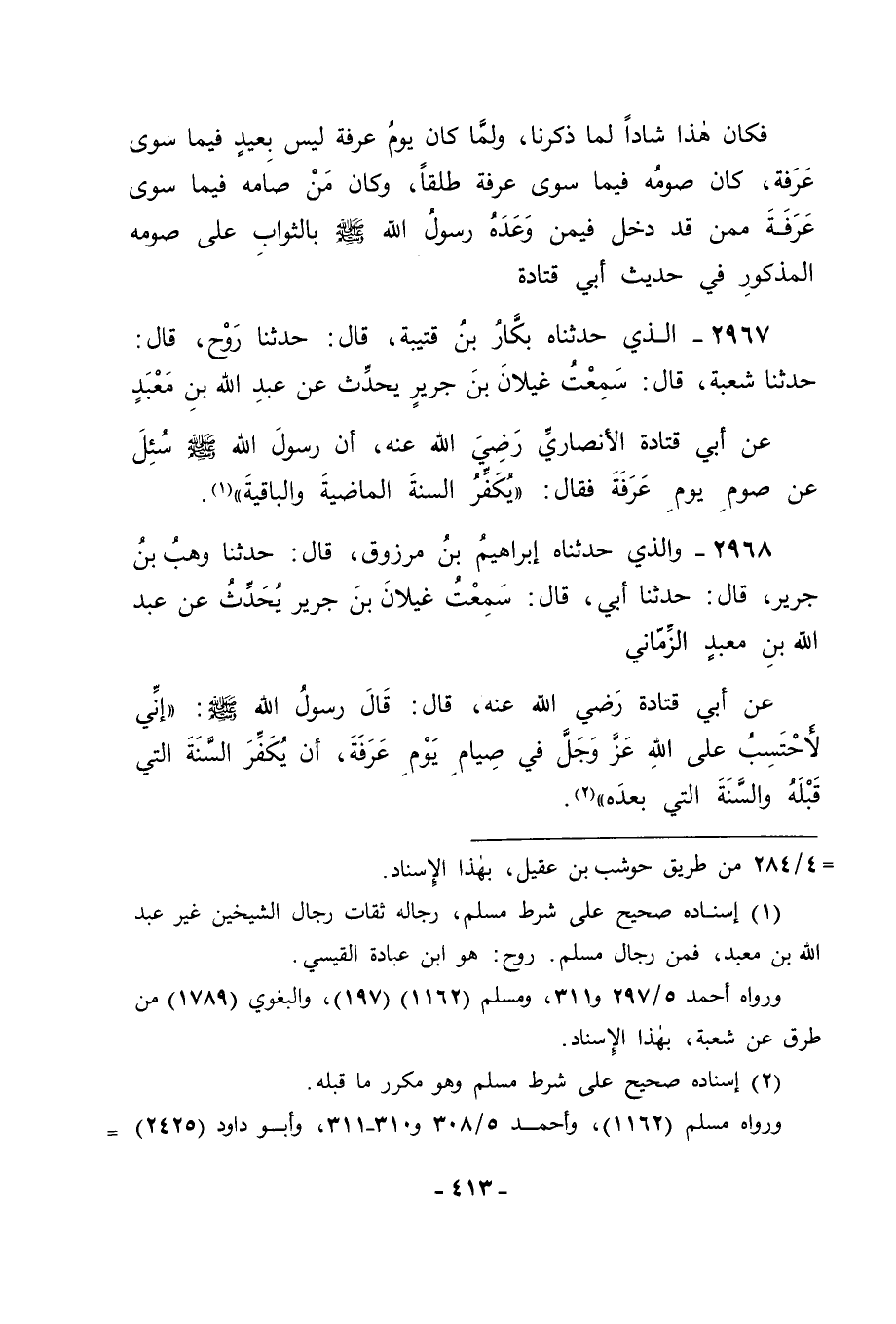 2967 - الَّذِي حَدَّثَنَاهُ بَكَّارُ بْنُ قُتَيْبَةَ قَالَ: حَدَّثَنَا رَوْحٌ قَالَ: حَدَّثَنَا شُعْبَةُ قَالَ: سَمِعْتُ غَيْلَانَ بْنَ جَرِيرٍ يُحَدِّثُ، عَنْ عَبْدِ اللهِ بْنِ مَعْبَدٍ، عَنْ أَبِي قَتَادَةَ الْأَنْصَارِيِّ رَضِيَ اللهُ عَنْهُ أَنَّ رَسُولَ اللهِ صَلَّى اللَّهُ عَلَيْهِ وَسَلَّمَ سُئِلَ عَنْ صَوْمِ يَوْمِ عَرَفَةَ , فَقَالَ: " يُكَفِّرُ السَّنَةَ الْمَاضِيَةَ , وَالْبَاقِيَةَ "