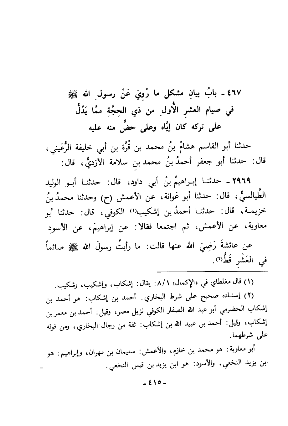 2969 - حَدَّثَنَا إِبْرَاهِيمُ بْنُ أَبِي دَاوُدَ قَالَ: حَدَّثَنَا أَبُو الْوَلِيدِ الطَّيَالِسِيُّ قَالَ: حَدَّثنا أَبُو عَوَانَةَ، عَنِ الْأَعْمَشِ، ح وَحَدَّثَنَا مُحَمَّدُ بْنُ خُزَيْمَةَ قَالَ: حَدَّثَنَا أَحْمَدُ بْنُ إِشْكِيبَ الْكُوفِيُّ قَالَ: حَدَّثَنَا أَبُو مُعَاوِيَةَ، عَنِ الْأَعْمَشِ، ثُمَّ اجْتَمَعَا , فَقَالَا: عَنْ إِبْرَاهِيمَ، عَنِ الْأَسْوَدِ، عَنْ عَائِشَةَ رَضِيَ اللهُ عَنْهَا قَالَتْ: مَا رَأَيْتُ رَسُولَ اللهِ صَلَّى اللَّهُ عَلَيْهِ وَسَلَّمَ صَائِمًا فِي الْعَشْرِ قَطُّ , -[416]- فَقَالَ قَائِلٌ: كَيْفَ تَقْبَلُونَ هَذَا , وَأَنْتُمْ تَرْوُونَ عَنْ رَسُولِ اللهِ صَلَّى اللَّهُ عَلَيْهِ وَسَلَّمَ فِي فَضْلِ الْعَمَلِ فِي هَذِهِ الْأَيَّامِ مَا تَرْوُونَهُ عَنْهُ فِيهِ