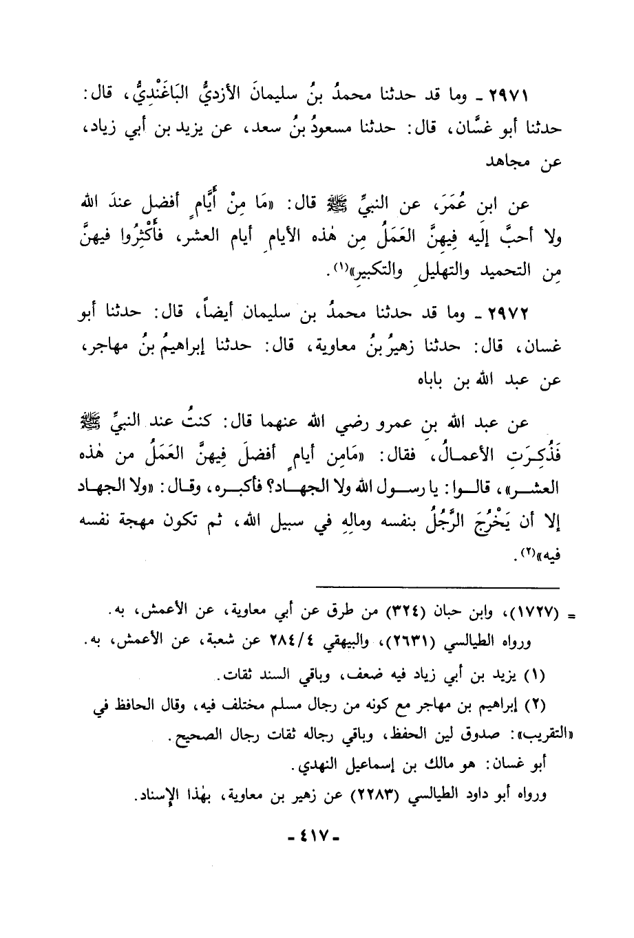 2972 - وَمَا قَدْ حَدَّثَنَا مُحَمَّدُ بْنُ سُلَيْمَانَ أَيْضًا قَالَ: حَدَّثَنَا أَبُو غَسَّانَ قَالَ: حَدَّثَنَا زُهَيْرُ بْنُ مُعَاوِيَةَ قَالَ: حَدَّثَنَا إِبْرَاهِيمُ بْنُ مُهَاجِرٍ، عَنْ عَبْدِ اللهِ بْنِ بَابَاهُ، عَنْ عَبْدِ اللهِ بْنِ عَمْرٍو رَضِيَ اللهُ عَنْهُمَا قَالَ: كُنْتُ عِنْدَ النَّبِيِّ صَلَّى اللَّهُ عَلَيْهِ وَسَلَّمَ فَذَكَرْتُ الْأَعْمَالَ , فَقَالَ: " مَا مِنْ أَيَّامٍ أَفْضَلَ فِيهِنَّ الْعَمَلُ مِنْ هَذِهِ الْعَشْرِ " قَالُوا: يَا رَسُولَ اللهِ , وَلَا الْجِهَادُ؟ فَأَكْبَرَهُ , وَقَالَ: " وَلَا الْجِهَادُ إِلَّا أَنْ يَخْرُجَ الرَّجُلُ بِنَفْسِهِ وَمَالِهِ فِي سَبِيلِ اللهِ , ثُمَّ تَكُونُ مُهْجَةُ نَفْسِهِ فِيهِ "