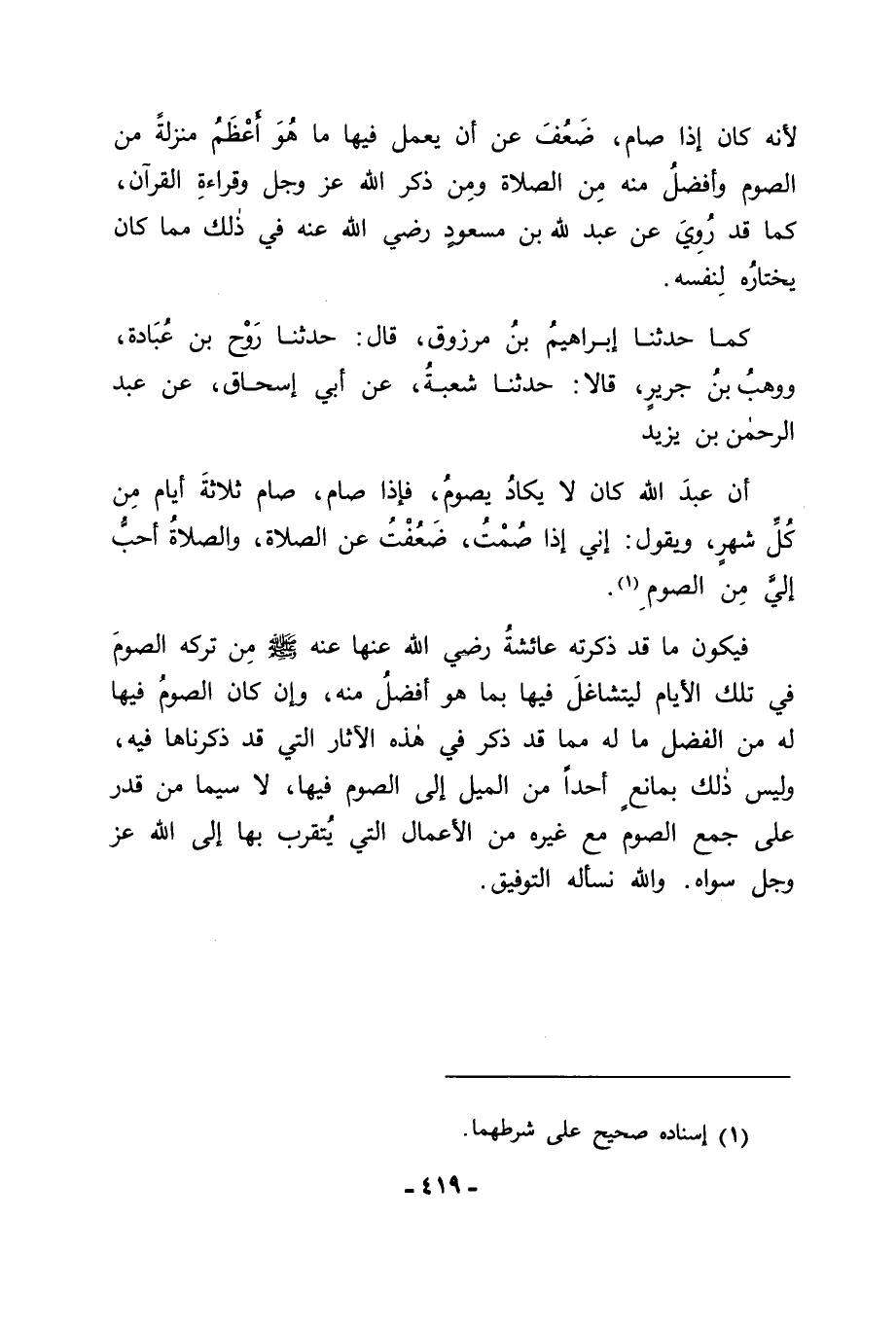 كَمَا حَدَّثَنَا إِبْرَاهِيمُ بْنُ مَرْزُوقٍ قَالَ: حَدَّثَنَا رَوْحُ بْنُ عُبَادَةَ، وَوَهْبُ بْنُ جَرِيرٍ قَالَا: حَدَّثَنَا شُعْبَةُ، عَنْ أَبِي إِسْحَاقَ عَنْ عَبْدِ الرَّحْمَنِ بْنِ يَزِيدَ: أَنَّ عَبْدَ اللهِ كَانَ لَا يَكَادُ يَصُومُ فَإِذَا صَامَ صَامَ ثَلَاثَةَ أَيَّامٍ مِنْ كُلِّ شَهْرٍ وَيَقُولُ: " إِنِّي إِذَا صُمْتُ ضَعُفْتُ عَنِ الصَّلَاةِ وَالصَّلَاةُ أَحَبُّ إِلَيَّ مِنَ الصَّوْمِ " فَيَكُونُ مَا قَدْ ذَكَرَتْهُ عَائِشَةُ رَضِيَ اللهُ عَنْهَا عَنْهُ صَلَّى اللَّهُ عَلَيْهِ وَسَلَّمَ مِنْ تَرْكِهِ الصَّوْمَ فِي تِلْكَ الْأَيَّامِ لِيَتَشَاغَلَ فِيهَا بِمَا هُوَ أَفْضَلُ مِنْهُ , وَإِنْ كَانَ الصَّوْمُ فِيهَا لَهُ مِنَ الْفَضْلِ مَا لَهُ مِمَّا قَدْ ذُكِرَ فِي هَذِهِ الْآثَارِ الَّتِي قَدْ ذَكَرْنَاهَا فِيهِ وَلَيْسَ ذَلِكَ بِمَانِعٍ أَحَدًا مِنَ الْمَيْلِ إِلَى الصَّوْمِ فِيهَا لَا سِيَّمَا مَنْ قَدَرَ عَلَى جَمْعِ الصَّوْمِ مَعَ غَيْرِهِ مِنَ الْأَعْمَالِ الَّتِي يُتَقَرَّبُ بِهَا إِلَى اللهِ عَزَّ وَجَلَّ سِوَاهُ , وَاللهَ نَسْأَلُهُ التَّوْفِيقَ