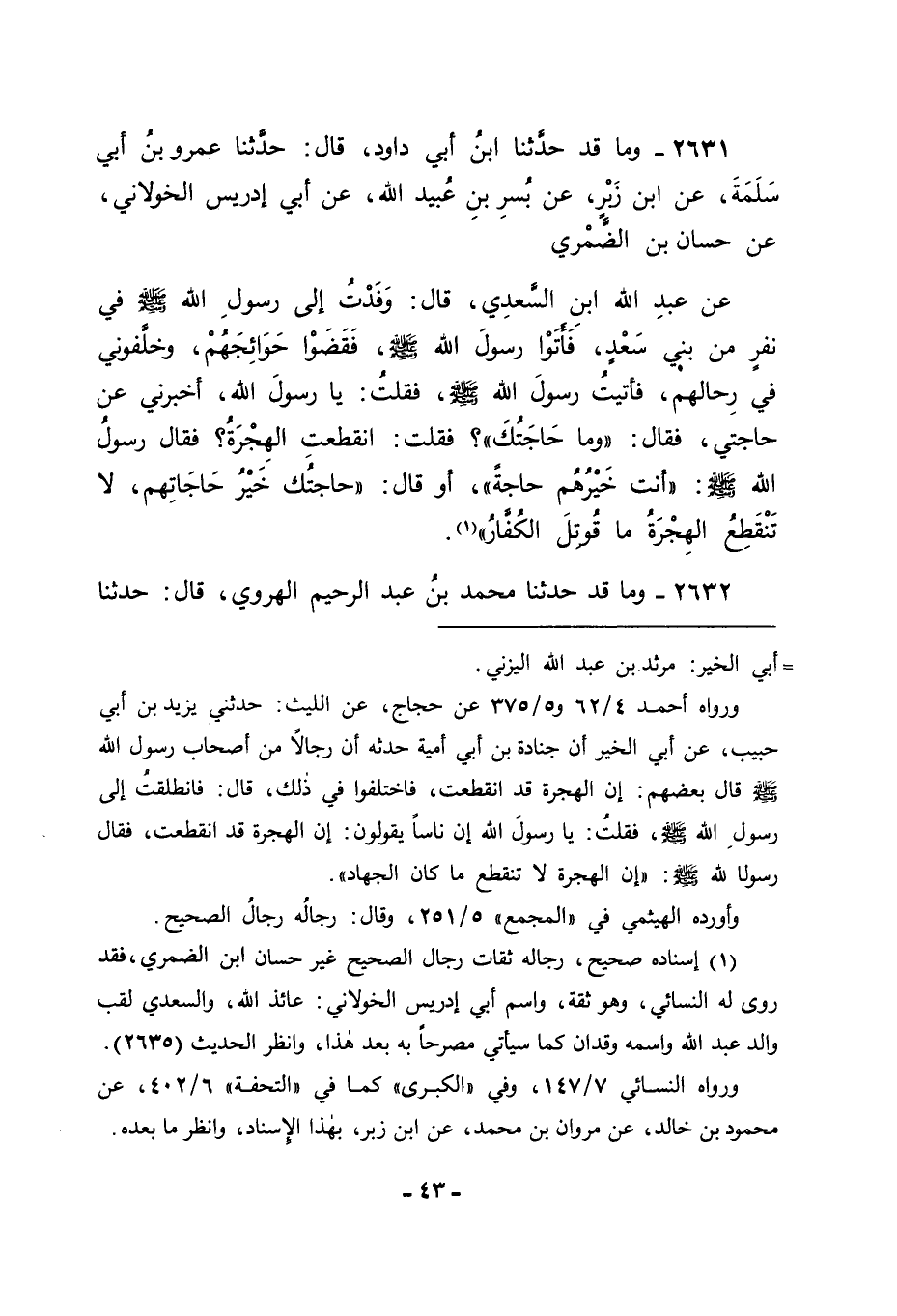 2631 - وَمَا قَدْ حَدَّثَنَا ابْنُ أَبِي دَاوُدَ قَالَ: حَدَّثَنَا عَمْرُو بْنُ أَبِي سَلَمَةَ، عَنِ ابْنِ زِبْرٍ، عَنْ بُسْرِ بْنِ عُبَيْدِ اللهِ، عَنْ أَبِي إِدْرِيسَ الْخَوْلَانِيِّ، عَنْ حَسَّانَ بْنِ الضَّمْرِيِّ، عَنْ عَبْدِ اللهِ بْنِ السَّعْدِيِّ قَالَ: وَفَدْتُ إِلَى رَسُولِ اللهِ صَلَّى اللَّهُ عَلَيْهِ وَسَلَّمَ فِي نَفَرٍ مِنْ بَنِي سَعْدٍ , فَأَتَوْا رَسُولَ اللهِ صَلَّى اللَّهُ عَلَيْهِ وَسَلَّمَ , فَقَضَوْا حَوَائِجَهُمْ , وَخَلَّفُونِي فِي رِحَالِهِمْ , فَأَتَيْتُ رَسُولَ اللهِ صَلَّى اللَّهُ عَلَيْهِ وَسَلَّمَ , فَقُلْتُ: يَا رَسُولَ اللهِ , أَخْبِرْنِي عَنْ حَاجَتِي , فَقَالَ: " وَمَا حَاجَتُكَ؟ " فَقُلْتُ: انْقَطَعَتِ الْهِجْرَةُ؟ فَقَالَ رَسُولُ اللهِ صَلَّى اللَّهُ عَلَيْهِ وَسَلَّمَ: " أَنْتَ خَيْرُهُمْ حَاجَةً " , أَوْ قَالَ: " حَاجَتُكَ خَيْرُ حَاجَاتِهِمْ لَا تَنْقَطِعُ الْهِجْرَةُ مَا قُوتِلَ الْكُفَّارُ "