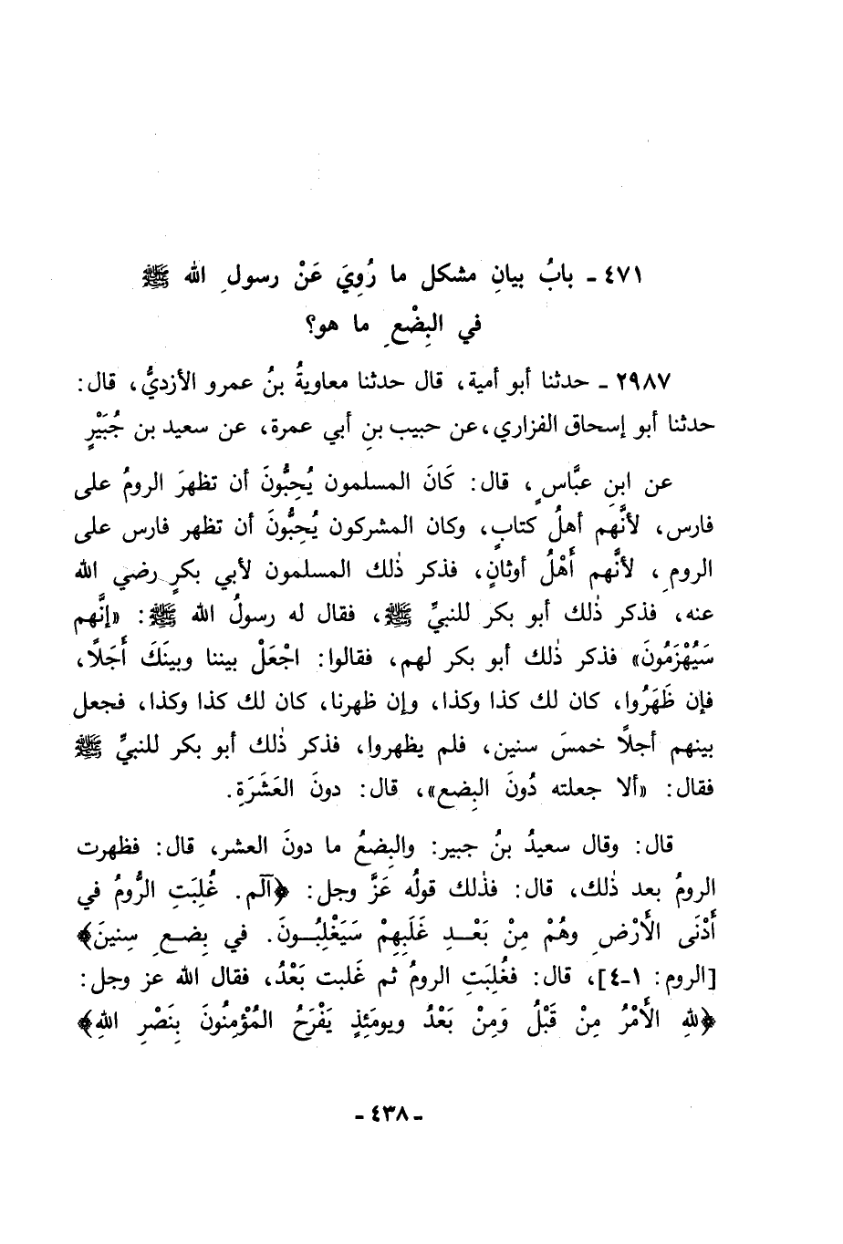 2987 - حَدَّثَنَا أَبُو أُمَيَّةَ قَالَ: حَدَّثَنَا مُعَاوِيَةُ بْنُ عَمْرٍو الْأَزْدِيُّ قَالَ: حَدَّثَنَا أَبُو إِسْحَاقَ الْفَزَارِيُّ، عَنْ حَبِيبِ بْنِ أَبِي عَمْرَةَ، عَنْ سَعِيدِ بْنِ جُبَيْرٍ، عَنِ ابْنِ عَبَّاسٍ قَالَ: كَانَ الْمُسْلِمُونَ يُحِبُّونَ أَنْ تَظْهَرَ الرُّومُ عَلَى فَارِسَ ; لِأَنَّهُمْ أَهْلُ كِتَابٍ وَكَانَ الْمُشْرِكُونَ يُحِبُّونَ أَنْ تَظْهَرَ فَارِسُ عَلَى الرُّومِ ; لِأَنَّهُمْ أَهْلُ أَوْثَانٍ فَذَكَرَ ذَلِكَ الْمُسْلِمُونَ لِأَبِي بَكْرٍ رَضِيَ اللهُ عَنْهُ فَذَكَرَ ذَلِكَ أَبُو بَكْرٍ لِلنَّبِيِّ صَلَّى اللَّهُ عَلَيْهِ وَسَلَّمَ , فَقَالَ لَهُ رَسُولُ اللهِ صَلَّى اللَّهُ عَلَيْهِ وَسَلَّمَ: " إِنَّهُمْ سَيُهْزَمُونَ " فَذَكَرَ ذَلِكَ أَبُو بَكْرٍ لَهُمْ , فَقَالُوا: اجْعَلْ بَيْنَنَا وَبَيْنَكَ أَجَلًا فَإِنْ ظَهَرُوا كَانَ لَكَ كَذَا وَكَذَا , وَإِنْ ظَهَرْنَا , كَانَ لَكَ كَذَا وَكَذَا , فَجَعَلَ بَيْنَهُمْ أَجَلًا خَمْسَ سِنِينَ فَلَمْ يَظْهَرُوا فَذَكَرَ ذَلِكَ أَبُو بَكْرٍ لِلنَّبِيِّ صَلَّى اللَّهُ عَلَيْهِ وَسَلَّمَ , فَقَالَ: " أَلَا جَعَلْتَهُ دُونَ الْبِضْعِ قَالَ: دُونَ الْعَشَرَةِ " قَالَ: وَقَالَ سَعِيدُ بْنُ جُبَيْرٍ وَالْبِضْعُ مَا دُونَ الْعَشْرِ. قَالَ: فَظَهَرَتِ الرُّومُ بَعْدَ ذَلِكَ. قَالَ: فَذَلِكَ قَوْلُهُ عَزَّ وَجَلَّ: {الم غُلِبَتِ الرُّومُ فِي أَدْنَى الْأَرْضِ وَهُمْ مِنْ بَعْدِ غَلَبِهِمْ سَيَغْلِبُونَ فِي بِضْعِ سِنِينَ} [الروم: 2] قَالَ: فَغُلِبَتِ الرُّومُ , ثُمَّ غَلَبَتْ بَعْدُ , فَقَالَ اللهُ عَزَّ وَجَلَّ: {لِلَّهِ الْأَمْرُ مِنْ قَبْلُ وَمِنْ بَعْدُ وَيَوْمَئِذٍ يَفْرَحُ الْمُؤْمِنُونَ بِنَصْرِ اللهِ} [الروم: 4]-[439]- قَالَ: أَبُو إِسْحَاقَ قَالَ: سُفْيَانُ سَمِعْتُ أَنَّهُمْ ظَهَرُوا عَلَيْهِمْ يَوْمَ بَدْرٍ قَالَ أَبُو جَعْفَرٍ: وَفِي إِسْنَادِ هَذَا الْحَدِيثِ إِسْقَاطُ سُفْيَانَ بَيْنَ أَبِي إِسْحَاقَ الْفَزَارِيِّ وَبَيْنَ حَبِيبِ بْنِ أَبِي عَمْرَةَ فَاحْتُمِلَ أَنْ يَكُونَ ذَلِكَ مِنْ أَبِي أُمَيَّةَ وَاحْتُمِلَ أَنْ يَكُونَ مِنِّي غَيْرَ أَنَّ مَا عَقَّبَ بِهِ أَبُو إِسْحَاقَ هَذَا الْحَدِيثَ مِنْ قَوْلِهِ قَالَ: سُفْيَانُ سَمِعْتُ: أَنَّهُمْ ظَهَرُوا عَلَيْهِمْ يَوْمَ بَدْرٍ يَدُلُّ أَنَّ بَيْنَ أَبِي إِسْحَاقَ وَبَيْنَ حَبِيبٍ فِي إِسْنَادِهِ سُفْيَانَ
