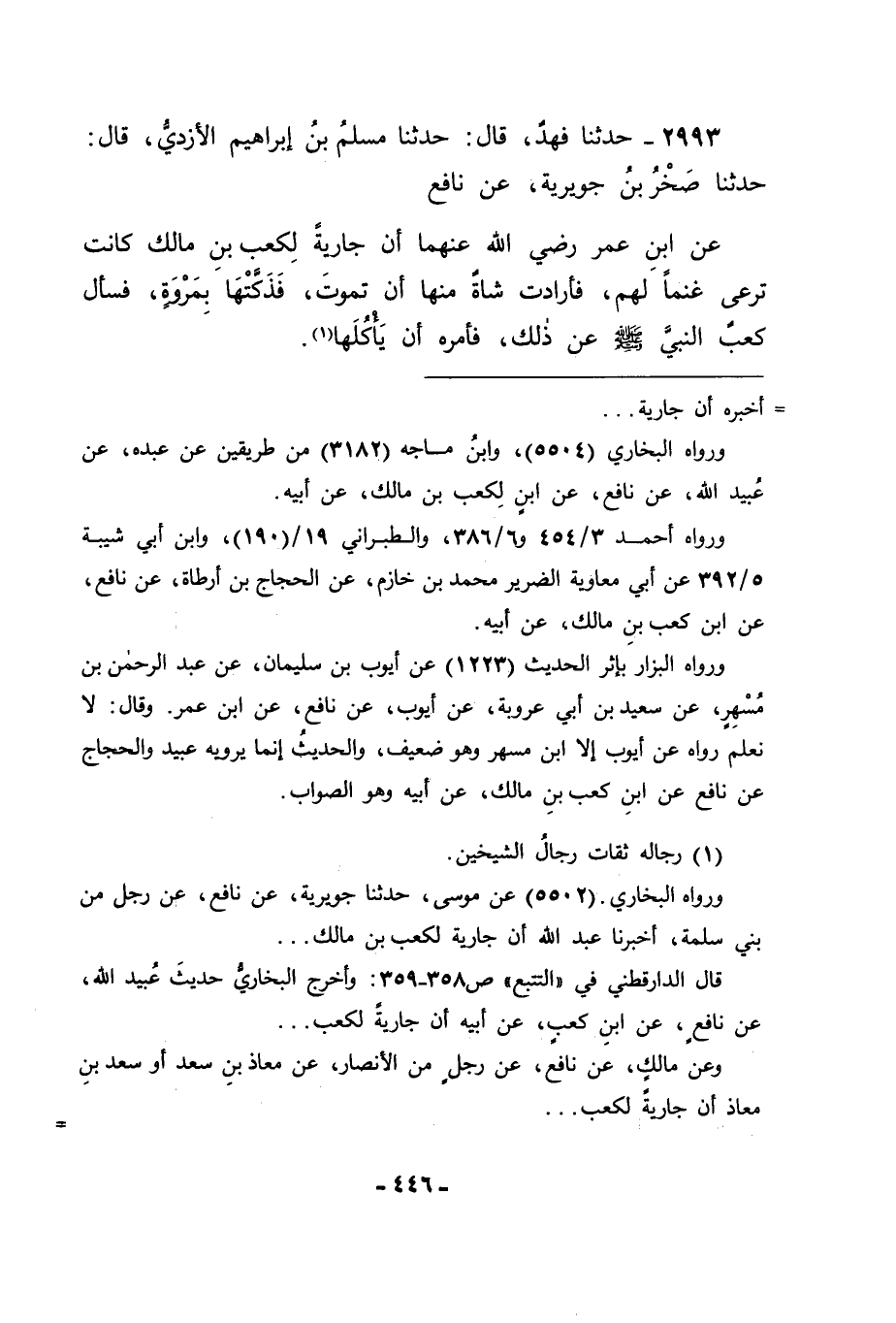 2993 - حَدَّثَنَا فَهْدٌ قَالَ: حَدَّثَنَا مُسْلِمُ بْنُ إِبْرَاهِيمَ الْأَزْدِيُّ قَالَ: حَدَّثَنَا صَخْرُ بْنُ جُوَيْرِيَةَ، عَنْ نَافِعٍ، عَنِ ابْنِ عُمَرَ رَضِيَ اللهُ عَنْهُمَا أَنَّ جَارِيَةً لِكَعْبِ بْنِ مَالِكٍ كَانَتْ تَرْعَى غَنَمًا لَهُمْ فَأَرَادَتْ شَاةٌ مِنْهَا أَنْ تَمُوتَ فَذَكَّتْهَا بِمَرْوَةٍ فَسَأَلَ كَعْبٌ النَّبِيَّ صَلَّى اللَّهُ عَلَيْهِ وَسَلَّمَ عَنْ ذَلِكَ فَأَمَرَهُ أَنْ يَأْكُلَهَا -[447]- قَالَ أَبُو جَعْفَرٍ: فَفِي هَذَا الْحَدِيثِ إِطْلَاقُ رَسُولِ اللهِ صَلَّى اللَّهُ عَلَيْهِ وَسَلَّمَ لِكَعْبِ بْنِ مَالِكٍ أَكْلَ شَاتِهِ الَّتِي ذَبَحَتْهَا جَارِيَةٌ بِغَيْرِ أَمْرِهِ , فَفِي ذَلِكَ مَا قَدْ دَلَّ -[448]- أَنَّ الْحُكْمَ فِيمَا ذَبَحَهُ رَجُلٌ مِنَ الْأَنْعَامِ بِغَيْرِ إِذْنِ مَالِكِهِ أَنَّ ذَلِكَ ذَكَاةً لَهُ , فَقَالَ قَائِلٌ: هَذَا حَدِيثٌ مُضْطَرِبُ الْإِسْنَادِ لَمْ يَرْوِهِ كَمَا ذَكَرْتَ عَنْ نَافِعٍ إِلَّا يَحْيَى بْنُ سَعِيدٍ، وَصَخْرُ بْنُ جُوَيْرِيَةَ فَأَمَّا مَنْ سِوَاهُمَا مِنْ رُوَاةِ نَافِعٍ فَرَوَوْهُ عَنْ نَافِعٍ بِخِلَافِ هَذَا الْإِسْنَادِ مِنَ الْأَسَانِيدِ الَّتِي لَا تَقُومُ الْحُجَّةُ بِأَمْثَالِهَا