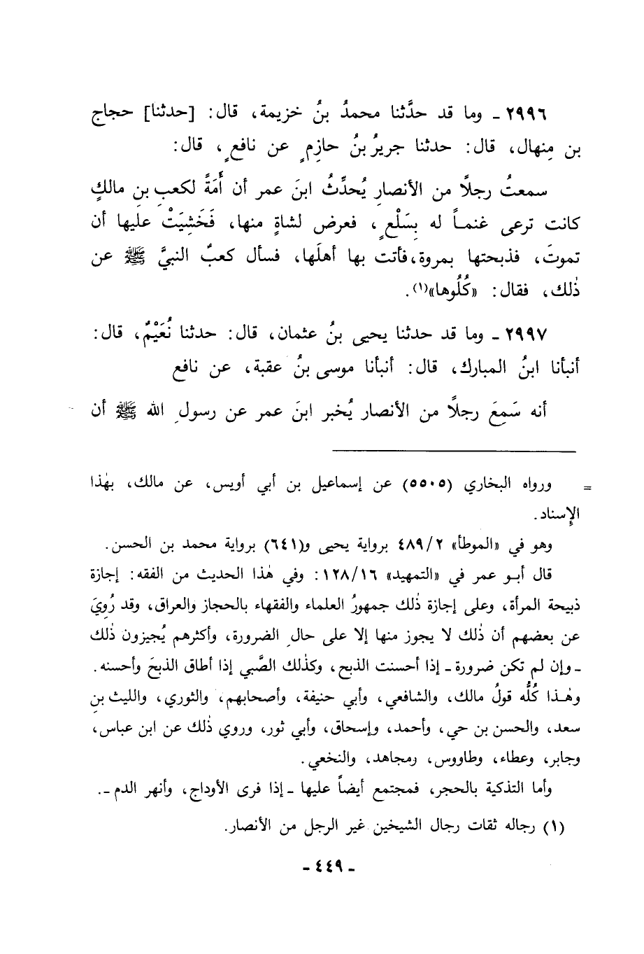 2996 - وَمَا قَدْ حَدَّثَنَا مُحَمَّدُ بْنُ خُزَيْمَةَ قَالَ: حَدَّثَنَا حَجَّاجُ بْنُ مِنْهَالٍ قَالَ: حَدَّثَنَا جَرِيرُ بْنُ حَازِمٍ، عَنْ نَافِعٍ قَالَ: سَمِعْتُ رَجُلًا مِنَ الْأَنْصَارِ يُحَدِّثُ ابْنَ عُمَرَ: أَنَّ أَمَةً لِكَعْبِ بْنِ مَالِكٍ كَانَتْ تَرْعَى غَنَمًا لَهُ بِسَلْعٍ فَعَرَضَ لِشَاةٍ مِنْهَا فَخَشِيَتْ عَلَيْهَا أَنْ تَمُوتَ فَذَبَحَتْهَا بِمَرْوَةِ فَأَتَتْ بِهَا أَهْلَهَا فَسَأَلَ كَعْبٌ النَّبِيَّ صَلَّى اللَّهُ عَلَيْهِ وَسَلَّمَ عَنْ ذَلِكَ , فَقَالَ: " كُلُوهَا "