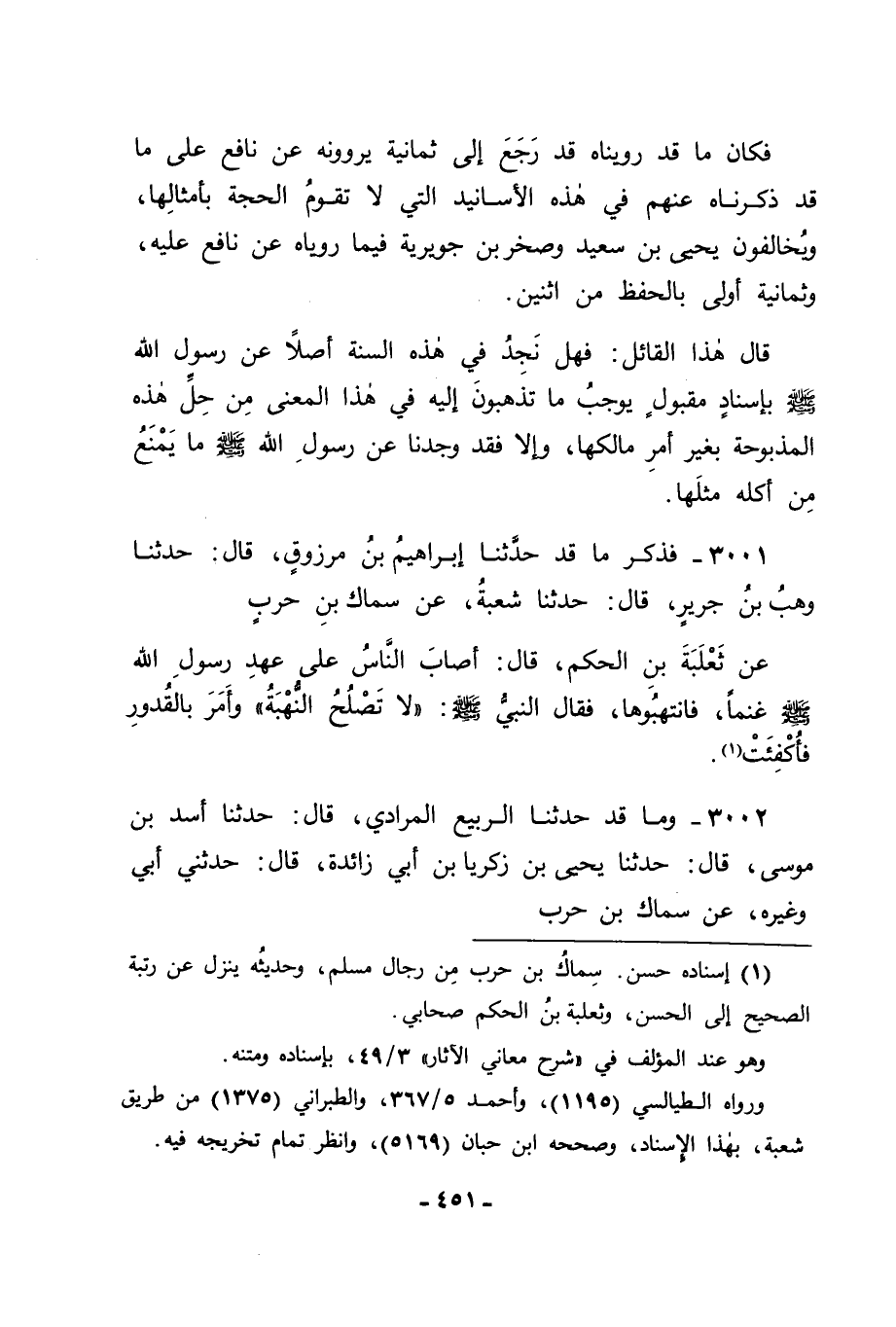 3001 - فَذَكَرَ مَا قَدْ حَدَّثَنَا إِبْرَاهِيمُ بْنُ مَرْزُوقٍ قَالَ: حَدَّثَنَا وَهْبُ بْنُ جَرِيرٍ قَالَ: حَدَّثَنَا شُعْبَةُ، عَنْ سِمَاكِ بْنِ حَرْبٍ، عَنْ ثَعْلَبَةَ بْنِ الْحَكَمِ قَالَ: أَصَابَ النَّاسُ عَلَى عَهْدِ رَسُولِ اللهِ صَلَّى اللَّهُ عَلَيْهِ وَسَلَّمَ غَنَمًا فَانْتَهَبُوهَا , فَقَالَ النَّبِيُّ صَلَّى اللَّهُ عَلَيْهِ وَسَلَّمَ: " لَا تَصْلُحُ النُّهْبَةُ , وَأَمَرَ بِالْقُدُورِ فَأُكْفِئَتْ "