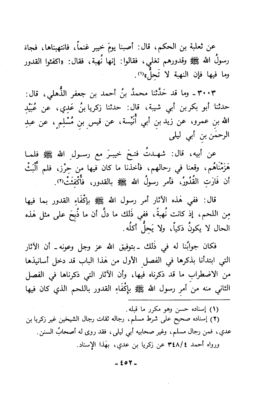 3003 - وَمَا قَدْ حَدَّثَنَا مُحَمَّدُ بْنُ أَحْمَدَ بْنِ جَعْفَرٍ الذُّهْلِيُّ قَالَ: حَدَّثَنَا أَبُو بَكْرِ بْنُ أَبِي شَيْبَةَ قَالَ: حَدَّثَنَا زَكَرِيَّا بْنُ عَدِيٍّ، عَنْ عُبَيْدِ اللهِ بْنِ عَمْرٍو، عَنْ زَيْدِ بْنِ أَبِي أُنَيْسَةَ، عَنْ قَيْسِ بْنِ مُسْلِمٍ، عَنْ عَبْدِ الرَّحْمَنِ بْنِ أَبِي لَيْلَى، عَنْ أَبِيهِ قَالَ: شَهِدْتُ فَتْحَ خَيْبَرَ مَعَ رَسُولِ اللهِ صَلَّى اللَّهُ عَلَيْهِ وَسَلَّمَ , فَلَمَّا هَزَمْنَاهُمْ وَقَعْنَا فِي رِحَالِهِمْ فَأَخَذْنَا مَا كَانَ فِيهَا مِنْ حِرْزٍ , فَلَمْ أَلْبَثْ أَنْ فَارَتِ الْقُدُورُ , فَأَمَرَ رَسُولُ اللهِ صَلَّى اللَّهُ عَلَيْهِ وَسَلَّمَ بِالْقُدُورِ فَأُكْفِئَتْ قَالَ: فَفِي هَذِهِ الْآثَارِ أَمَرَ رَسُولُ اللهِ صَلَّى اللَّهُ عَلَيْهِ وَسَلَّمَ بِإِكْفَاءِ الْقُدُورِ بِمَا فِيهَا مِنَ اللَّحْمِ إِذْ كَانَتْ نُهْبَةً , فَفِي ذَلِكَ مَا دَلَّ أَنَّ مَا ذُبِحَ عَلَى مِثْلِ هَذِهِ الْحَالِ لَا يَكُونُ ذَكِيًّا , وَلَا يَحِلُّ أَكْلُهُ. فَكَانَ جَوَابُنَا لَهُ فِي ذَلِكَ بِتَوْفِيقِ اللهِ عَزَّ وَجَلَّ وَعَوْنِهِ أَنَّ الْآثَارَ الَّتِي ابْتَدَأْنَا بِذِكْرِهَا فِي الْفَصْلِ الْأَوَّلِ مِنْ هَذَا الْبَابِ قَدْ دَخَلَ أَسَانِيدَهَا مِنَ الِاضْطِرَابِ مَا قَدْ ذَكَرْنَاهُ فِيهَا , وَأَنَّ الْآثَارَ الَّتِي ذَكَرْنَاهَا فِي الْفَصْلِ الثَّانِي مِنْهُ مِنْ أَمْرِ رَسُولِ اللهِ صَلَّى اللَّهُ عَلَيْهِ وَسَلَّمَ بِإِكْفَاءِ الْقُدُورِ بِاللَّحْمِ الَّذِي كَانَ فِيهَا -[453]- مِنَ الْغَنَمِ إِذْ كَانَتْ نُهْبَةً فَقَدْ يَحْتَمِلُ أَنْ يَكُونَ ذَلِكَ لَا لِأَنَّهُ كَانَ حَرَامًا بِالنُّهْبَةِ , وَلَكِنْ كَانَ عُقُوبَةً لِلْمُنْتَهِبِينَ ; لِأَنَّ ذَلِكَ كَانَ فِي وَقْتٍ كَانَتِ الْعُقُوبَاتُ عَلَى الذُّنُوبِ تَكُونُ فِي أَمْوَالِ الْمُذْنِبِينَ كَمَا قَدْ رُوِيَ عَنْ رَسُولِ اللهِ صَلَّى اللَّهُ عَلَيْهِ وَسَلَّمَ فِي مَانِعِ الزَّكَاةِ: " مَنْ أَعْطَاهَا مُؤْتَجِرًا كَانَ لَهُ أَجْرُهَا , وَمَنْ لَا؛ فَإِنَّا آخِذُوهَا وَشَطْرَ مَالِهِ عَزْمَةً مِنْ عَزَمَاتِ رَبِّنَا عَزَّ وَجَلَّ لَيْسَ لِآلِ مُحَمَّدٍ صَلَّى اللَّهُ عَلَيْهِ وَسَلَّمَ مِنْهَا شَيْءٌ " وَسَنَذْكُرُ ذَلِكَ فِيمَا بَعْدُ مِنْ كِتَابِنَا هَذَا فِي مَوْضِعٍ هُوَ أَوْلَى مِنْ هَذَا الْمَوْضِعِ إِنْ شَاءَ اللهُ , فَأَمَّا مَا سَأَلْتَ عَنْهُ مِنْ حَدِيثِ كَعْبِ بْنِ مَالِكٍ وَهَلْ جَاءَ مِنْ وَجْهٍ صَحِيحٍ غَيْرِ الْوُجُوهِ الَّتِي ذَكَرْتَهَا فِي هَذَا الْبَابِ , فَإِنَّا قَدْ وَجَدْنَاهُ مِنْ وَجْهٍ غَيْرِ تِلْكَ الْوُجُوهِ مِمَّا لَا مَطْعَنَ فِيهِ