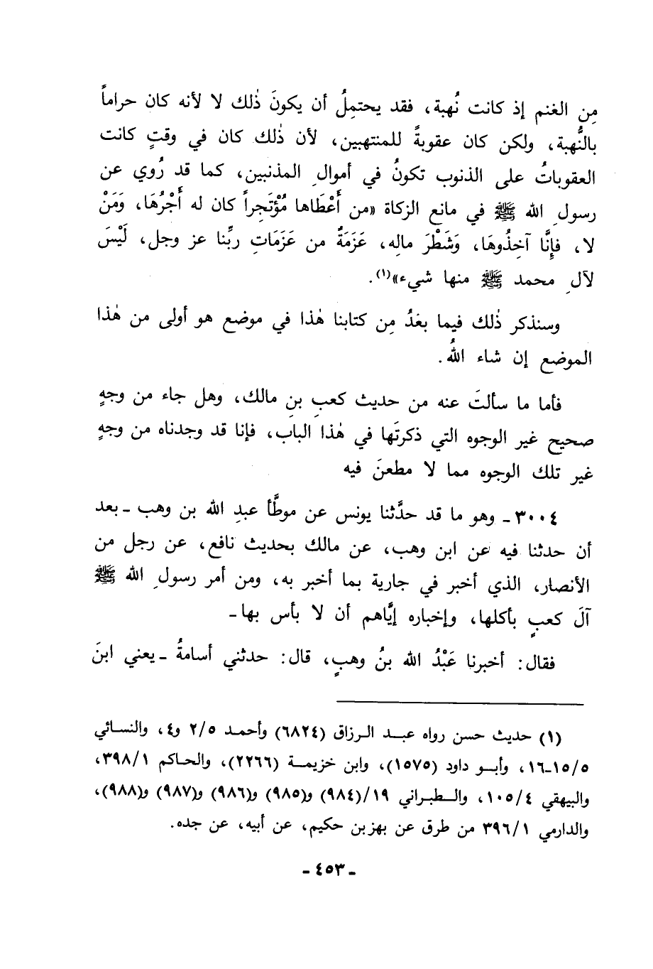 3004 - وَهُوَ مَا قَدْ حَدَّثَنَا يُونُسُ، عَنْ مُوَطَّأِ عَبْدِ اللهِ بْنِ وَهْبٍ بَعْدَ أَنْ حَدَّثَنَا فِيهِ، عَنِ ابْنِ وَهْبٍ، عَنْ مَالِكٍ بِحَدِيثِ نَافِعٍ , عَنْ رَجُلٍ مِنَ الْأَنْصَارِ الَّذِي أَخْبَرَ فِي جَارِيَةٍ بِمَا أَخْبَرَ بِهِ، وَمِنْ أَمْرِ رَسُولِ اللهِ صَلَّى اللَّهُ عَلَيْهِ وَسَلَّمَ آلَ كَعْبٍ بِأَكْلِهَا وَإِخْبَارِهِ إِيَّاهُمْ أَنْ لَا بَأْسَ بِهَا فَقَالَ: أَخْبَرَنَا عَبْدُ اللهِ بْنُ وَهْبٍ قَالَ: حَدَّثَنِي أُسَامَةُ يَعْنِي ابْنَ -[454]- زَيْدٍ اللَّيْثِيَّ، عَنِ ابْنِ شِهَابٍ، عَنْ عَبْدِ الرَّحْمَنِ بْنِ كَعْبِ بْنِ مَالِكٍ، عَنْ أَبِيهِ أَنَّهُ سَأَلَ رَسُولَ اللهِ صَلَّى اللَّهُ عَلَيْهِ وَسَلَّمَ عَنْهَا , فَلَمْ يَرَ بِهَا بَأْسًا قَالَ أَبُو جَعْفَرٍ: فَهَذَا حَدِيثٌ صَحِيحُ الْإِسْنَادِ فِيهِ إِطْلَاقُ رَسُولِ اللهِ صَلَّى اللَّهُ عَلَيْهِ وَسَلَّمَ لِآلِ كَعْبٍ أَكْلَ هَذِهِ الشَّاةِ , وَإِنْ كَانَتْ ذُبِحَتْ بِغَيْرِ أَمْرِهِ. قَالَ أَبُو جَعْفَرٍ: وَفِي الْبَابِ أَيْضًا حَدِيثٌ آخَرُ مِنْ حَدِيثِ عَاصِمِ بْنِ كُلَيْبٍ الْجَرْمِيِّ عَنْ أَبِيهِ عَنْ رَجُلٍ مِنْ أَصْحَابِ النَّبِيِّ صَلَّى اللَّهُ عَلَيْهِ وَسَلَّمَ فِي الشَّاةِ الَّتِي ذُبِحَتْ بِغَيْرِ أَمْرِ مَالِكِهَا وَشُوِيَتْ وَأَمَرَ رَسُولُ اللهِ صَلَّى اللَّهُ عَلَيْهِ وَسَلَّمَ إِطْعَامَهَا الْأُسَارَى وَسَنَذْكُرُ ذَلِكَ فِيمَا بَعْدُ مِنْ كِتَابِنَا هَذَا إِنْ شَاءَ اللهُ. قَالَ أَبُو جَعْفَرٍ: فَفِي هَذَيْنِ الْحَدِيثَيْنِ مَا قَدْ دَلَّ عَلَى إِطْلَاقِ أَكْلِ لَحْمِ مِثْلِ هَذِهِ , وَإِنْ كَانَتْ قَدْ ذُكِّيَتْ بِغَيْرِ أَمْرِ مَالِكِهَا مَعَ قَوْلِ فُقَهَاءِ الْأَمْصَارِ جَمِيعًا بِمَا قَدْ وَافَقَ مَا فِي هَذَيْنِ الْحَدِيثَيْنِ , وَخَالَفَ مَا قَالَهُ هَذَا الْقَائِلُ , وَاللهَ عَزَّ وَجَلَّ نَسْأَلُهُ التَّوْفِيقَ