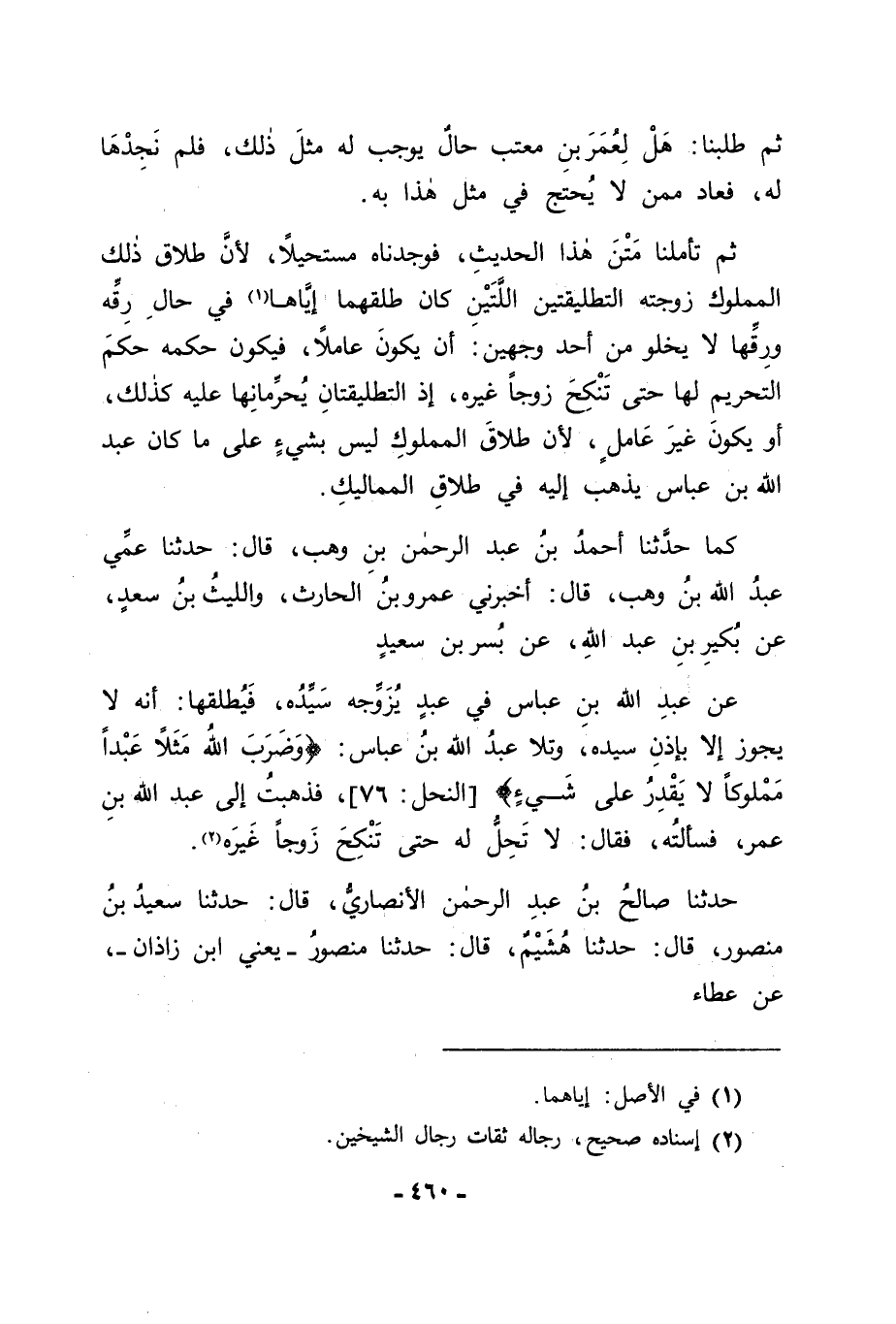 كَمَا حَدَّثَنَا أَحْمَدُ بْنُ عَبْدِ الرَّحْمَنِ بْنِ وَهْبٍ قَالَ: حَدَّثَنَا عَمِّي عَبْدُ اللهِ بْنُ وَهْبٍ قَالَ: أَخْبَرَنِي عَمْرُو بْنُ الْحَارِثِ، وَاللَّيْثُ بْنُ سَعْدٍ، عَنْ بُكَيْرِ بْنِ عَبْدِ اللهِ، عَنْ بُسْرِ بْنِ سَعِيدٍ، عَنْ عَبْدِ اللهِ بْنِ عَبَّاسٍ فِي عَبْدٍ يُزَوِّجُهُ سَيِّدُهُ فَيُطَلِّقُهَا: " أَنَّهُ لَا يَجُوزُ إِلَّا بِإِذْنِ سَيِّدِهِ , وَتَلَا عَبْدُ اللهِ بْنُ عَبَّاسٍ {وَضَرَبَ اللهُ مَثَلًا عَبْدًا مَمْلُوكًا لَا يَقْدِرُ عَلَى شَيْءٍ} " فَذَهَبْتُ إِلَى عَبْدِ اللهِ بْنِ عُمَرَ فَسَأَلْتُهُ , فَقَالَ: " لَا تَحِلُّ لَهُ حَتَّى تَنْكِحَ زَوْجًا غَيْرَهُ "