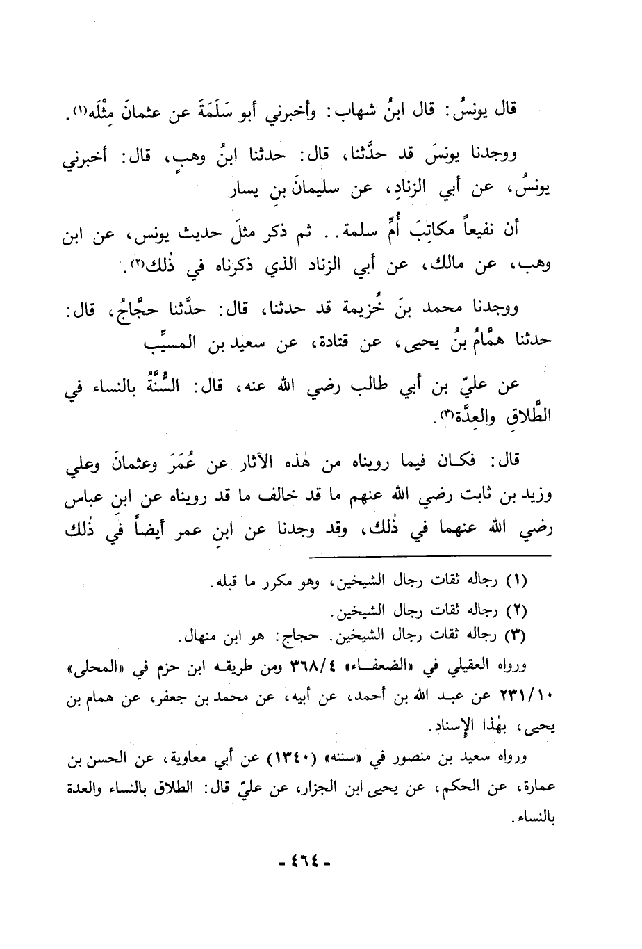 وَوَجَدْنَا مُحَمَّدَ بْنَ خُزَيْمَةَ قَدْ حَدَّثَنَا قَالَ: حَدَّثَنَا حَجَّاجٌ قَالَ: حَدَّثَنَا هَمَّامُ بْنُ يَحْيَى، عَنْ قَتَادَةَ، عَنْ سَعِيدِ بْنِ الْمُسَيِّبِ عَنْ عَلِيِّ بْنِ أَبِي طَالِبٍ رَضِيَ اللهُ عَنْهُ قَالَ: " السُّنَّةُ بِالنِّسَاءِ فِي الطَّلَاقِ وَالْعِدَّةِ " قَالَ: فَكَانَ فِيمَا رَوَيْنَاهُ فِي هَذِهِ الْآثَارِ عَنْ عُمَرَ، وَعُثْمَانَ، وَعَلِيٍّ، وَزَيْدِ بْنِ ثَابِتٍ رَضِيَ اللهُ عَنْهُمْ مَا قَدْ خَالَفَ مَا قَدْ رَوَيْنَاهُ عَنِ ابْنِ عَبَّاسٍ رَضِيَ اللهُ عَنْهُمَا فِي ذَلِكَ , وَقَدْ وَجَدْنَا عَنِ ابْنِ عُمَرَ أَيْضًا فِي ذَلِكَ -[465]- مَا يُخَالِفُ مَا رَوَيْنَاهُ عَنِ ابْنِ عَبَّاسٍ فِي ذَلِكَ