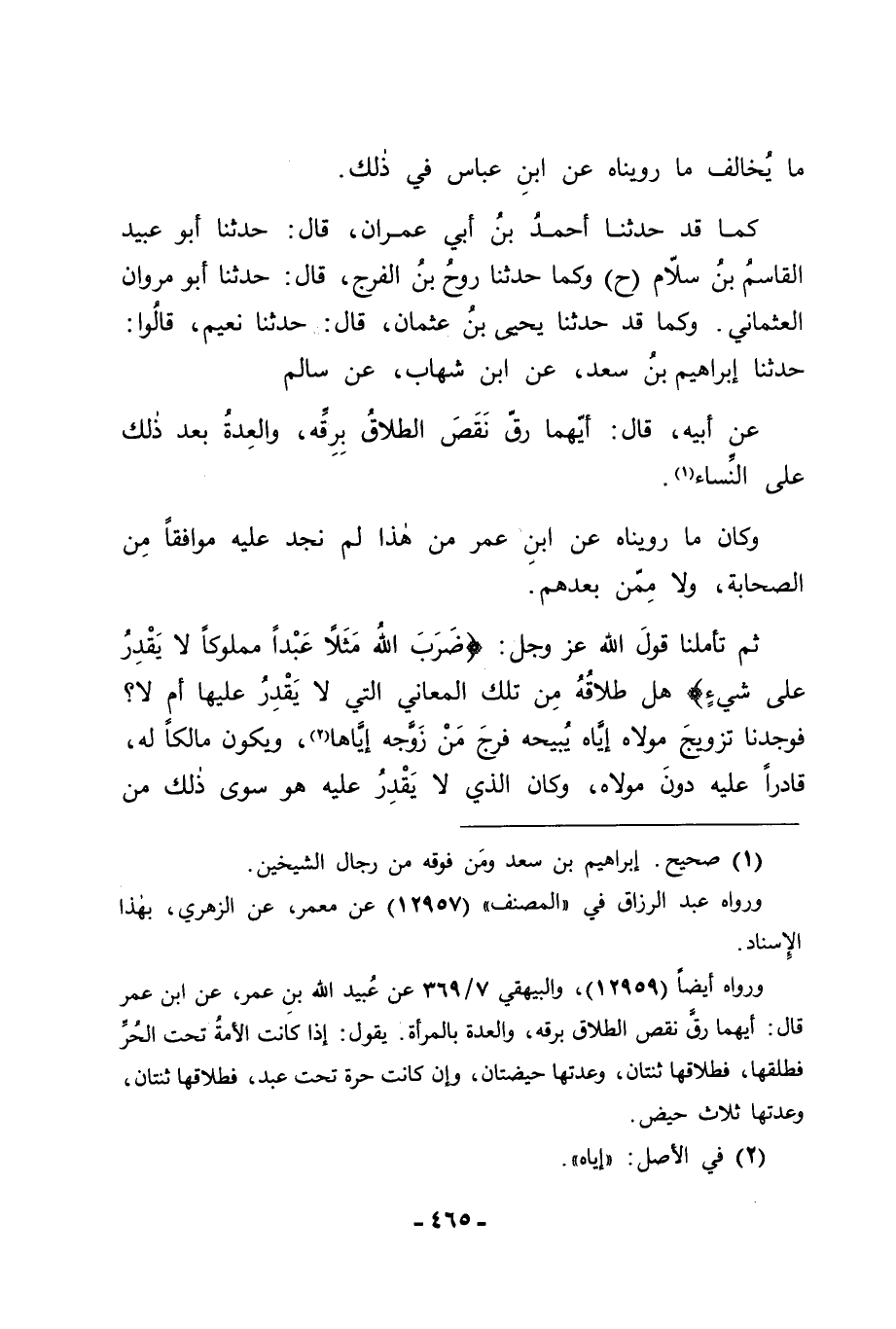 كَمَا قَدْ حَدَّثَنَا أَحْمَدُ بْنُ أَبِي عِمْرَانَ قَالَ: حَدَّثَنَا أَبُو عُبَيْدٍ الْقَاسِمُ بْنُ سَلَّامٍ ح وَكَمَا حَدَّثَنَا رَوْحُ بْنُ الْفَرَجِ قَالَ: حَدَّثَنَا أَبُو مَرْوَانَ الْعُثْمَانِيُّ، وَكَمَا قَدْ حَدَّثَنَا يَحْيَى بْنُ عُثْمَانَ قَالَ: حَدَّثَنَا نُعَيْمٌ قَالُوا: حَدَّثَنَا إِبْرَاهِيمُ بْنُ سَعْدٍ، عَنِ ابْنِ شِهَابٍ، عَنْ سَالِمٍ، عَنْ أَبِيهِ قَالَ: " أَيُّهُمَا رُقَّ نَقَصَ الطَّلَاقُ بِرِقِّهِ، وَالْعِدَّةُ بَعْدَ ذَلِكَ عَلَى النِّسَاءِ " وَكَانَ مَا رَوَيْنَاهُ عَنِ ابْنِ عُمَرَ مِنْ هَذَا لَمْ نَجِدْ عَلَيْهِ مُوَافِقًا مِنَ الصَّحَابَةِ , وَلَا مِمَّنْ بَعْدَهُمْ , ثُمَّ تَأَمَّلْنَا قَوْلَ اللهِ عَزَّ وَجَلَّ: {ضَرَبَ اللهُ مَثَلًا عَبْدًا مَمْلُوكًا لَا يَقْدِرُ عَلَى شَيْءٍ} [النحل: 75] هَلْ طَلَاقُهُ مِنْ تِلْكَ الْمَعَانِي الَّتِي لَا يَقْدِرُ عَلَيْهَا أَمْ لَا؟ فَوَجَدْنَا تَزْوِيجَ مَوْلَاهُ إِيَّاهُ يُبِيحُهُ فَرْجَ مَنْ زَوَّجَهُ إِيَّاهَا , وَيَكُونُ مَالِكًا لَهُ قَادِرًا عَلَيْهِ دُونَ مَوْلَاهُ وَكَانَ الَّذِي لَا يَقْدِرُ عَلَيْهِ هُوَ سِوَى ذَلِكَ مِنِ -[466]- الْأَمْوَالِ الَّتِي خَوَّلَهَا اللهُ الْأَحْرَارَ دُونَ الْمَمَالِيكِ لَا أَبْضَاعِ النِّسَاءِ , فَلَمَّا كَانَ حِلُّ الْبُضْعِ لَهُ لَا لِمَوْلَاهُ كَانَ تَحْرِيمُ الْبُضْعِ أَيْضًا لَهُ دُونَ مَوْلَاهُ. وَقَدْ رَوَيْنَا عَنْ عَلِيِّ بْنِ أَبِي طَالِبٍ رَضِيَ اللهُ عَنْهُ مِنْ نَاحِيَةِ الْمَدَنِيِّينَ فِي ذَلِكَ مَا قَدْ رَوَيْنَاهُ عَنْهُ فِي هَذَا الْبَابِ , وَقَدْ رُوِيَ عَنْهُ فِيهِ أَيْضًا مِنْ نَاحِيَةِ الْكُوفِيِّينَ مَا يُوَافِقُ ذَلِكَ