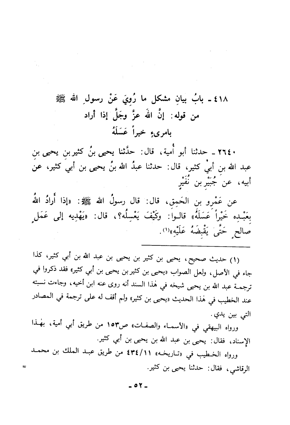 2640 - حَدَّثَنَا أَبُو أُمَيَّةَ قَالَ: حَدَّثَنَا يَحْيَى بْنُ كَثِيرِ بْنِ يَحْيَى بْنِ عَبْدِ اللهِ بْنِ أَبِي كَثِيرٍ قَالَ: حَدَّثَنَا عَبْدُ اللهِ بْنُ يَحْيَى بْنِ أَبِي كَثِيرٍ، عَنْ أَبِيهِ، عَنْ جُبَيْرِ بْنِ نُفَيْرٍ، عَنْ عَمْرِو بْنِ الْحَمِقِ قَالَ: قَالَ رَسُولُ اللهِ صَلَّى اللَّهُ عَلَيْهِ وَسَلَّمَ: " إِذَا أَرَادَ اللهُ بِعَبْدِهِ خَيْرًا عَسَلَهُ " قَالُوا: وَكَيْفَ يَعْسِلُهُ؟ قَالَ: " يَهْدِيهِ إِلَى عَمَلٍ صَالِحٍ حَتَّى يَقْبِضَهُ عَلَيْهِ "