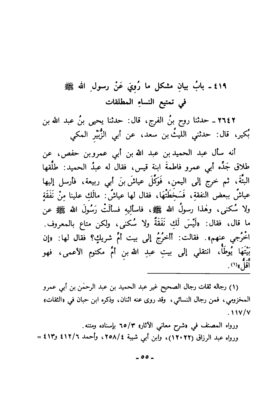 2642 - حَدَّثَنَا رَوْحُ بْنُ الْفَرَجِ قَالَ: حَدَّثَنَا يَحْيَى بْنُ عَبْدِ اللهِ بْنِ بُكَيْرٍ قَالَ: حَدَّثَنِي اللَّيْثُ بْنُ سَعْدٍ، عَنْ أَبِي الزُّبَيْرِ الْمَكِّيِّ أَنَّهُ سَأَلَ عَبْدَ الْحَمِيدِ بْنَ عَبْدِ اللهِ بْنِ أَبِي عَمْرِو بْنِ حَفْصٍ عَنْ طَلَاقِ جَدِّهِ أَبِي عَمْرٍو فَاطِمَةَ ابْنَةَ قَيْسٍ , فَقَالَ لَهُ عَبْدُ الْحَمِيدِ: طَلَّقَهَا الْبَتَّةَ , ثُمَّ خَرَجَ إِلَى الْيَمَنِ فَوَكَّلَ عَيَّاشَ بْنَ أَبِي رَبِيعَةَ فَأَرْسَلَ إِلَيْهَا عَيَّاشٌ بِبَعْضِ النَّفَقَةِ فَسَخِطَتْهَا , فَقَالَ لَهَا عَيَّاشٌ: مَا لَكِ عَلَيْنَا مِنْ نَفَقَةٍ وَلَا سُكْنَى , وَهَذَا رَسُولُ اللهِ صَلَّى اللَّهُ عَلَيْهِ وَسَلَّمَ , فَاسْأَلِيهِ , فَسَأَلَتْ رَسُولَ اللهِ صَلَّى اللَّهُ عَلَيْهِ وَسَلَّمَ عَنْ مَا قَالَ , فَقَالَ: " لَيْسَ لَكِ نَفَقَةٌ , وَلَا سُكْنَى , وَلَكِنْ مَتَاعٌ بِالْمَعْرُوفِ اخْرُجِي عَنْهُمْ " , فَقَالَتْ: أَأَخْرُجُ إِلَى بَيْتِ أُمِّ شَرِيكٍ؟ فَقَالَ لَهَا: " إِنَّ بَيْتَهَا يُوطَأُ انْتَقِلِي إِلَى بَيْتِ عَبْدِ اللهِ بْنِ أُمِّ مَكْتُومٍ الْأَعْمَى فَهُوَ أَقَلُّ " -[56]-