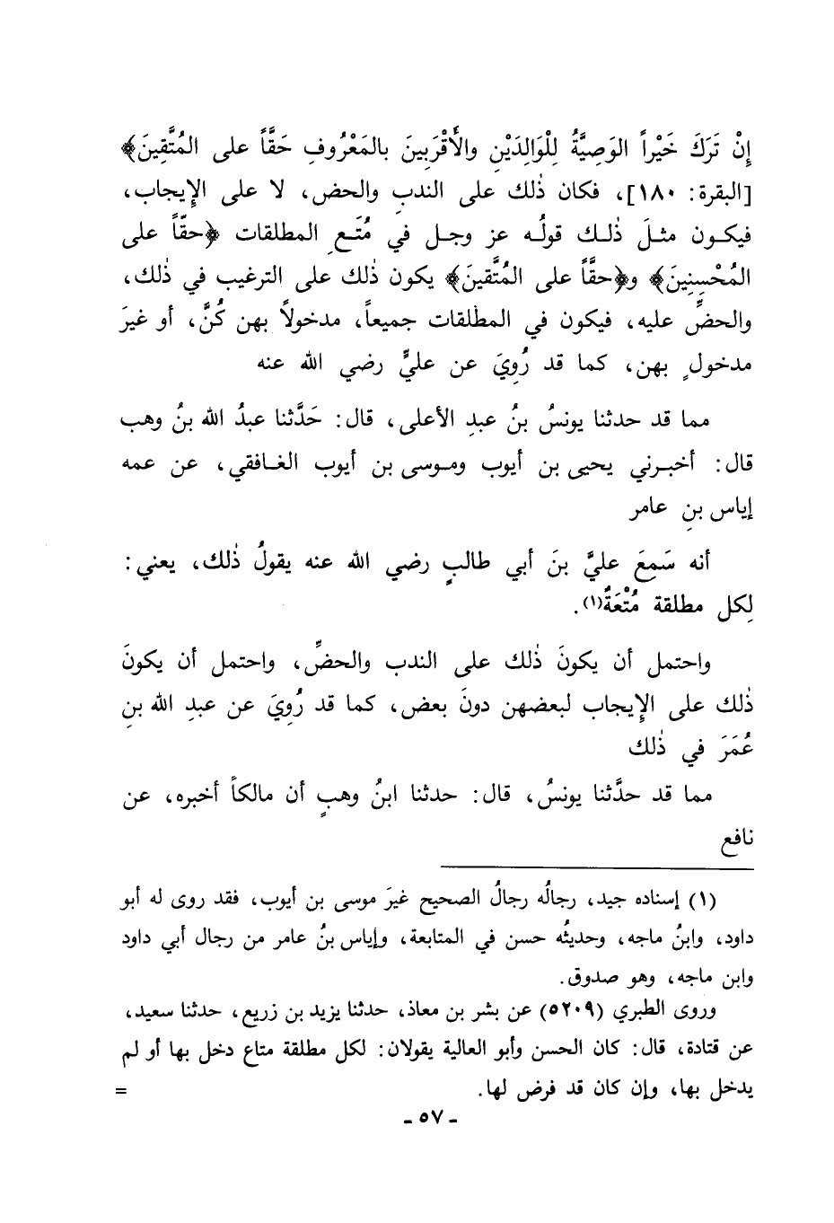مِمَّا قَدْ حَدَّثَنَا يُونُسُ قَالَ حَدَّثَنَا ابْنُ وَهْبٍ، أَنَّ مَالِكًا، أَخْبَرَهُ، عَنْ نَافِعٍ، -[58]- عَنْ عَبْدِ اللهِ بْنِ عُمَرَ أَنَّهُ كَانَ يَقُولُ: لِكُلِّ مُطَلَّقَةٍ مُتْعَةٌ إِلَّا الَّتِي تُطَلَّقُ وَقَدْ فُرِضَ لَهَا صَدَاقٌ فَحَسْبُهَا نِصْفُ مَا فُرِضَ لَهَا " وَمَا قَدْ حَدَّثَنَا إِبْرَاهِيمُ بْنُ مَرْزُوقٍ قَالَ: حَدَّثَنَا أَبُو حُذَيْفَةَ مُوسَى بْنُ مَسْعُودٍ قَالَ: حَدَّثَنَا سُفْيَانُ الثَّوْرِيُّ، عَنْ عُبَيْدِ اللهِ بْنِ عُمَرَ، عَنْ نَافِعٍ، عَنِ ابْنِ عُمَرَ فَذَكَرَ مِثْلَهُ. فَكَانَ فِي هَذَا مِنْ قَوْلِ ابْنِ عُمَرَ إِخْرَاجُ الْمُطَلَّقَاتِ قَبْلَ الدُّخُولِ بِهِنَّ مِنَ الْمُتَعِ اللَّاتِي ذَكَرْنَا , ثُمَّ الْتَمَسْنَا حُكْمَ ذَلِكَ مِنْ طَرِيقِ النَّظَرِ , فَوَجَدْنَا الْوَاجِبَ إِبْدَالًا مِنَ الْإِبْضَاعِ يَجِبُ بِوُقُوعِ التَّزْوِيجَاتِ وَانْعِقَادِهَا لَا بِمَا سِوَى ذَلِكَ , وَلَمَّا كَانَتِ الْمُتَعُ لَا تُوجِبُهَا التَّزْوِيجَاتُ اللَّاتِي لَا طَلَاقَ مَعَهَا كَانَ بِأَنْ لَا يُوجِبَهَا الطَّلَاقُ الَّذِي يَكُونُ بَعْدَهَا أَحْرَى. فَإِنْ قَالَ قَائِلٌ: فَقَدْ رَأَيْنَا الطَّلَاقَ يُوجِبُ النَّفَقَةَ وَالسُّكْنَى فِي الْعِدَّةِ وَلَمْ يَكُونَا وَاجِبَيْنِ قَبْلَ ذَلِكَ. -[59]- فَكَانَ جَوَابُنَا لَهُ فِي ذَلِكَ بِتَوْفِيقِ اللهِ عَزَّ وَجَلَّ وَعَوْنِهِ أَنَّ الْأَمْرَ لَيْسَ كَمَا ذَكَرَ وَلَكِنَّهُمَا قَدْ كَانَا وَاجِبَيْنِ بِالتَّزْوِيجِ وُجُوبًا لَمْ يَرْفَعْهُ الطَّلَاقُ الْوَاقِعُ فِيهِ فَهَذِهِ حُجَّةٌ فِي وُجُوبِ التَّمَتُّعِ لِلْمُطَلَّقَاتِ بَعْدَ الدُّخُولِ , فَأَمَّا الْمُطَلَّقَاتُ قَبْلَ الدُّخُولِ فَقَدِ اخْتَلَفَ أَهْلُ الْعِلْمِ فِيهِنَّ هَلْ لَهُنَّ مُتَعٌ يُحْكَمُ بِهَا عَلَى مُطَلِّقِيهِمُ الَّذِينَ لَمْ يَكُونُوا فَرَضُوا لَهُنَّ صَدَاقًا أَمْ لَا؟ فَقَالَ قَائِلُونَ: لَهُنَّ عَلَيْهِمُ الْمُتَعُ , وَإِنْ كَانُوا قَدِ اخْتَلَفُوا فِي مَقَادِيرِ الْمُتَعِ , فَقَالَ قَائِلُونَ مِنْهُمْ: هِيَ الْمِقْدَارُ الَّذِي يُجْزِئُ فِي الصَّلَاةِ مِنَ اللِّبَاسِ , وَمِمَّنْ قَالَ ذَلِكَ مِنْهُمْ كَثِيرٌ مِنَ الْكُوفِيِّينَ مِنْهُمْ: أَبُو حَنِيفَةَ وَالثَّوْرِيُّ , وَالْقَائِلُونَ بِقَوْلِهِمَا , وَقَالَ آخَرُونَ مِنْهُمْ: مِقْدَارُ الْمُتْعَةِ فِي هَذَا هُوَ نِصْفُ صَدَاقِ مِثْلِهَا مِنْ نِسَائِهَا اللَّاتِي يُرْجَعُ فِي مِثْلِ صَدَاقِهَا إِلَى أَمْثَالِ صَدَقَاتِ أَمْثَالِهِنَّ. وَمِمَّنْ قَالَ ذَلِكَ مِنْهُمْ: حَمَّادُ بْنُ أَبِي سُلَيْمَانَ , وَهَذَا هُوَ الْأَوْلَى مِمَّا قَالُوهُ فِي ذَلِكَ عَلَى أُصُولِهِمُ الَّتِي بَنَوْا هَذَا الْمَعْنَى عَلَيْهَا. وَقَالَ قَائِلُونَ مِنْ أَهْلِ الْعِلْمِ سِوَاهُمْ: إِنَّ الْمُتَعَ فِي هَذَا مَحْضُوضٌ عَلَيْهَا , مَأْمُورٌ بِهَا , غَيْرُ مُجْبَرٍ عَلَيْهَا , وَمِمَّنْ قَالَ ذَلِكَ مِنْهُمْ: مَالِكُ بْنُ أَنَسٍ , وَخَالَفَ الْآخَرِينَ الَّذِينَ ذَكَرْنَاهُمْ فِي ذَلِكَ؛ لِأَنَّ أُولَئِكَ يُوجِبُونَهَا وَيُجْبِرُونَ عَلَيْهَا وَيَحْبِسُونَ فِيهَا , وَكَانَ الْأَوْلَى مِمَّا قَدْ قِيلَ فِي ذَلِكَ عِنْدَنَا وَاللهُ أَعْلَمُ الْإِيجَابَ لَهَا وَالْحَبْسَ فِيهَا؛ لِأَنَّ التَّزْوِيجَ وَقَعَ بِلَا تَسْمِيَةِ صَدَاقٍ أَوْجَبَ لَهَا صَدَاقَ مِثْلِهَا عَلَى زَوْجِهَا كَمَا أَوْجَبَ مِلْكَ بُضْعِهَا لِزَوْجِهَا , فَلَمَّا وَقَعَ الطَّلَاقُ قَبْلَ الدُّخُولِ أُسْقِطَ عَنِ الزَّوْجِ نِصْفُ -[60]- الْوَاجِبِ عَلَيْهِ قَبْلَ الطَّلَاقِ مِمَّا قَدْ كَانَ مَحْبُوسًا فِي جَمِيعِهِ لَوْ لَمْ يُطَلِّقْ , فَإِذَا طَلَّقَ فَسَقَطَ عَنْهُ بِالطَّلَاقِ نِصْفُهُ بَقِيَ النِّصْفُ الْبَاقِي ع