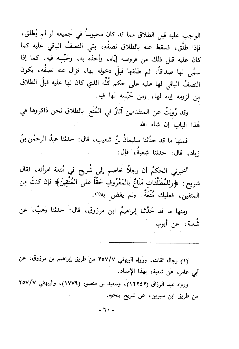 وَمِنْهَا مَا قَدْ حَدَّثَنَا إِبْرَاهِيمُ بْنُ مَرْزُوقٍ قَالَ: حَدَّثَنَا وَهْبٌ، عَنْ شُعْبَةَ، عَنْ أَيُّوبَ، -[61]- عَنْ سَعِيدِ بْنِ جُبَيْرٍ قَالَ: " لِكُلِّ مُطَلَّقَةٍ مُتْعَةٌ ". وَمَا قَدْ حَدَّثَنَا يُوسُفُ بْنُ يَزِيدَ قَالَ: حَدَّثَنَا سَعِيدُ بْنُ مَنْصُورٍ قَالَ: حَدَّثَنَا هُشَيْمٌ قَالَ: أَنْبَأَنَا يُونُسُ , عَنِ الْحَسَنِ , ثُمَّ ذَكَرَ مِثْلَهُ