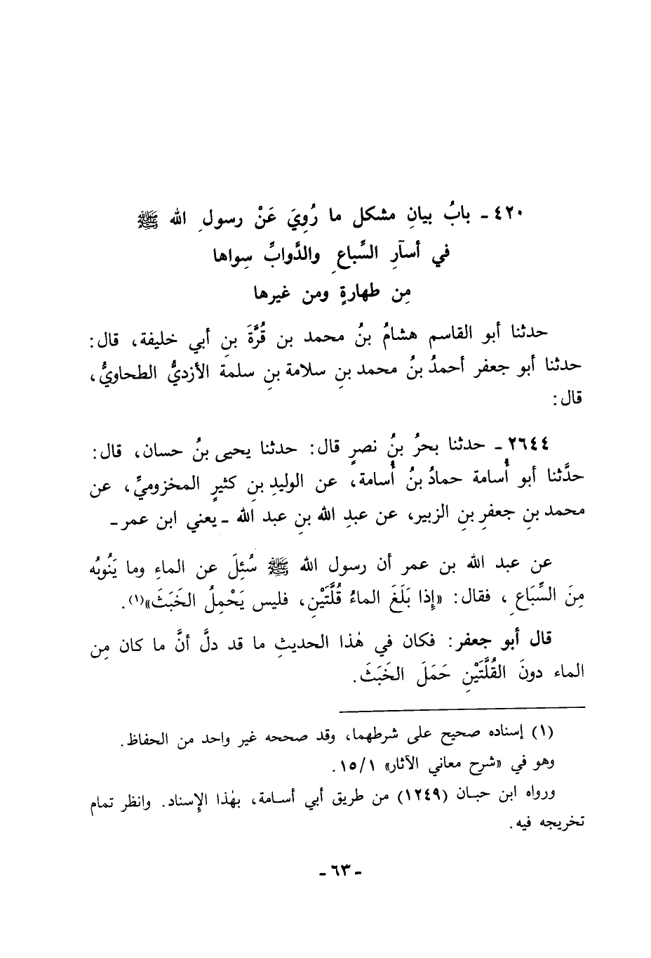 2644 - حَدَّثَنَا بَحْرُ بْنُ نَصْرٍ قَالَ: حَدَّثَنَا يَحْيَى بْنُ حَسَّانَ قَالَ: حَدَّثَنَا أَبُو أُسَامَةَ حَمَّادُ بْنُ أُسَامَةَ، عَنِ الْوَلِيدِ بْنِ كَثِيرٍ الْمَخْزُومِيِّ، عَنْ مُحَمَّدِ بْنِ جَعْفَرِ بْنِ الزُّبَيْرِ، عَنْ عَبْدِ اللهِ بْنِ عَبْدِ اللهِ يَعْنِي ابْنَ عُمَرَ، عَنْ عَبْدِ اللهِ بْنِ عُمَرَ أَنَّ رَسُولَ اللهِ صَلَّى اللَّهُ عَلَيْهِ وَسَلَّمَ سُئِلَ عَنِ الْمَاءِ وَمَا يَنُوبُهُ مِنَ السِّبَاعِ , فَقَالَ: " إِذَا بَلَغَ الْمَاءُ قُلَّتَيْنِ فَلَيْسَ يَحْمِلُ الْخَبَثَ " قَالَ أَبُو جَعْفَرٍ: فَكَانَ فِي هَذَا الْحَدِيثِ مَا قَدْ دَلَّ أَنَّ مَا كَانَ مِنَ الْمَاءِ دُونَ الْقُلَّتَيْنِ حَمَلَ الْخَبَثَ