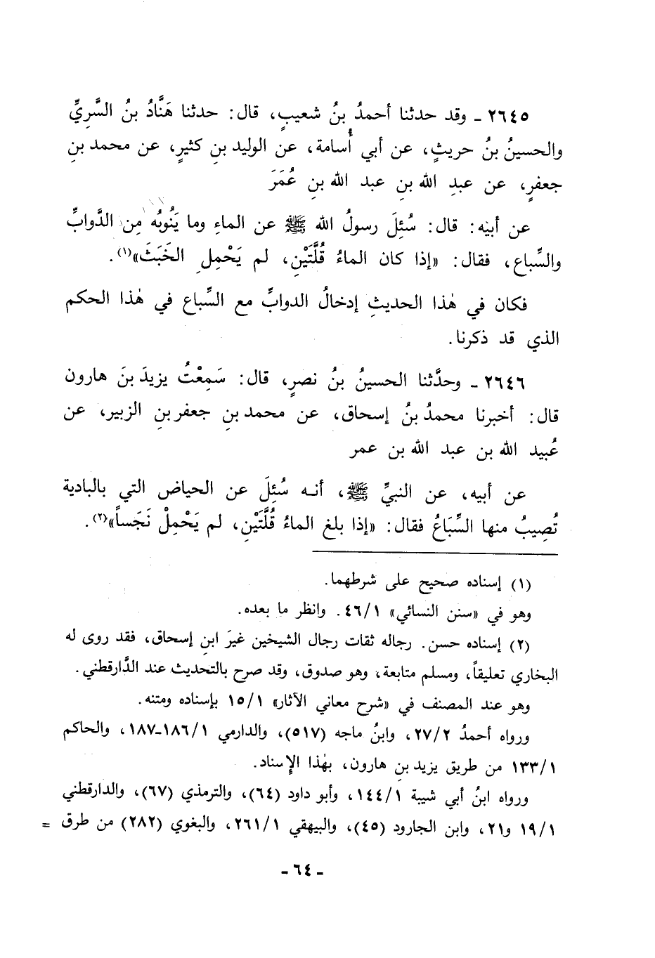 2646 - وَحَدَّثَنَا الْحُسَيْنُ بْنُ نَصْرٍ قَالَ: سَمِعْتُ يَزِيدَ بْنِ هَارُونَ قَالَ: أَخْبَرَنَا مُحَمَّدُ بْنُ إِسْحَاقَ، عَنْ مُحَمَّدِ بْنِ جَعْفَرِ بْنِ الزُّبَيْرِ، عَنْ عُبَيْدِ اللهِ بْنِ عَبْدِ اللهِ بْنِ عُمَرَ، عَنْ أَبِيهِ، عَنِ النَّبِيِّ صَلَّى اللَّهُ عَلَيْهِ وَسَلَّمَ أَنَّهُ سُئِلَ عَنِ الْحِيَاضِ الَّتِي بِالْبَادِيَةِ تُصِيبُ مِنْهَا السِّبَاعُ فَقَالَ: " إِذَا بَلَغَ الْمَاءُ قُلَّتَيْنِ لَمْ يَحْمِلْ نَجَسًا " -[65]- قَالَ أَبُو جَعْفَرٍ: فَفِي هَذَا الْحَدِيثِ مِثْلُ مَا فِي الْحَدِيثِ الَّذِي بَدَأْنَا بِرِوَايَتِنَا إِيَّاهُ فِي هَذَا الْبَابِ , فَقَالَ قَائِلٌ: كَيْفَ تَقْبَلُونَ هَذَا الْحَدِيثَ فِي أَسْآرِ السِّبَاعِ وَالدَّوَابِّ وَأَنْتُمْ تَرْوُونَ عَنْ رَسُولِ اللهِ صَلَّى اللَّهُ عَلَيْهِ وَسَلَّمَ فِيهَا مَا يُخَالِفُ مَا قَدْ رَوَيْتُمُوهُ فِي هَذَا الْبَابِ فِيهَا
