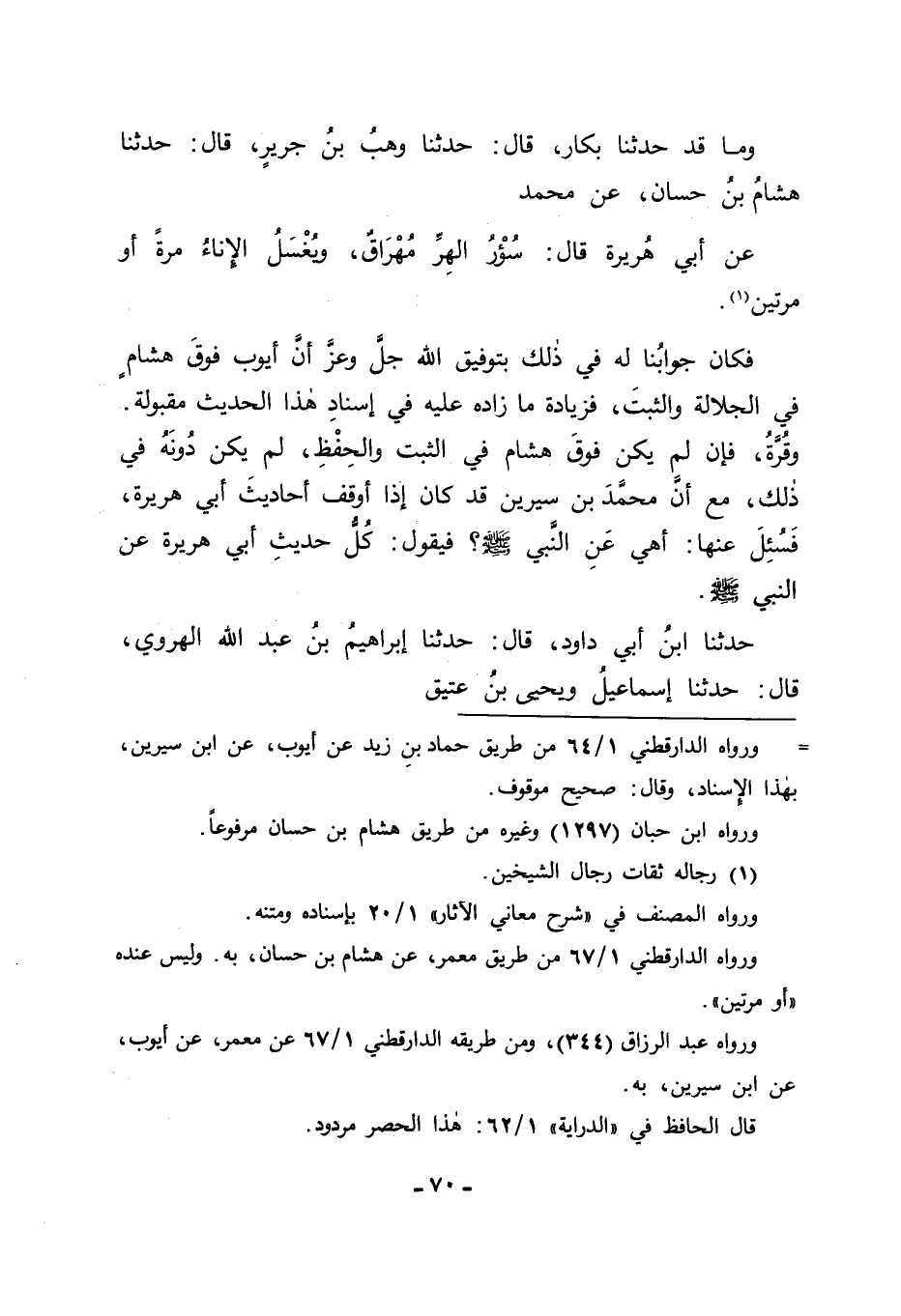 حَدَّثَنَا ابْنُ أَبِي دَاوُدَ قَالَ: حَدَّثَنَا إِبْرَاهِيمُ بْنُ عَبْدِ اللهِ الْهَرَوِيُّ قَالَ: حَدَّثَنَا إِسْمَاعِيلُ، وَيَحْيَى بْنُ عَتِيقٍ، -[71]- عَنْ مُحَمَّدِ بْنِ سِيرِينَ أَنَّهُ: كَانَ إِذَا حَدَّثَ عَنْ أَبِي هُرَيْرَةَ فَقِيلَ لَهُ عَنِ النَّبِيِّ صَلَّى اللَّهُ عَلَيْهِ وَسَلَّمَ؟ قَالَ: " كُلُّ حَدِيثِ أَبِي هُرَيْرَةَ عَنِ النَّبِيِّ صَلَّى اللَّهُ عَلَيْهِ وَسَلَّمَ ". قَالَ فَدَلَّ ذَلِكَ أَنَّ مُحَمَّدًا رَفَعَ هَذَا الْحَدِيثَ مَرَّةً فَأَخَذَهُ عَنْهُ كَذَلِكَ أَيُّوبُ، وَقُرَّةُ وَأَوْقَفَهُ عَلَى أَبِي هُرَيْرَةَ مَرَّةً لَمَّا قَدْ أَعْلَمَ النَّاسَ أَنَّ كُلَّ حَدِيثِ أَبِي هُرَيْرَةَ عَنِ النَّبِيِّ صَلَّى اللَّهُ عَلَيْهِ وَسَلَّمَ فَسَمِعَهُ مِنْهُ هِشَامٌ كَذَلِكَ وَهُوَ فِي الْحَقِيقَةِ عَنِ النَّبِيِّ صَلَّى اللَّهُ عَلَيْهِ وَسَلَّمَ. فَقَالَ قَائِلٌ: فَقَدْ رَوَتْ عَائِشَةُ عَنِ النَّبِيِّ صَلَّى اللَّهُ عَلَيْهِ وَسَلَّمَ فِي سُؤْرِ الْهِرِّ إِثْبَاتَ طَهَارَتِهِ