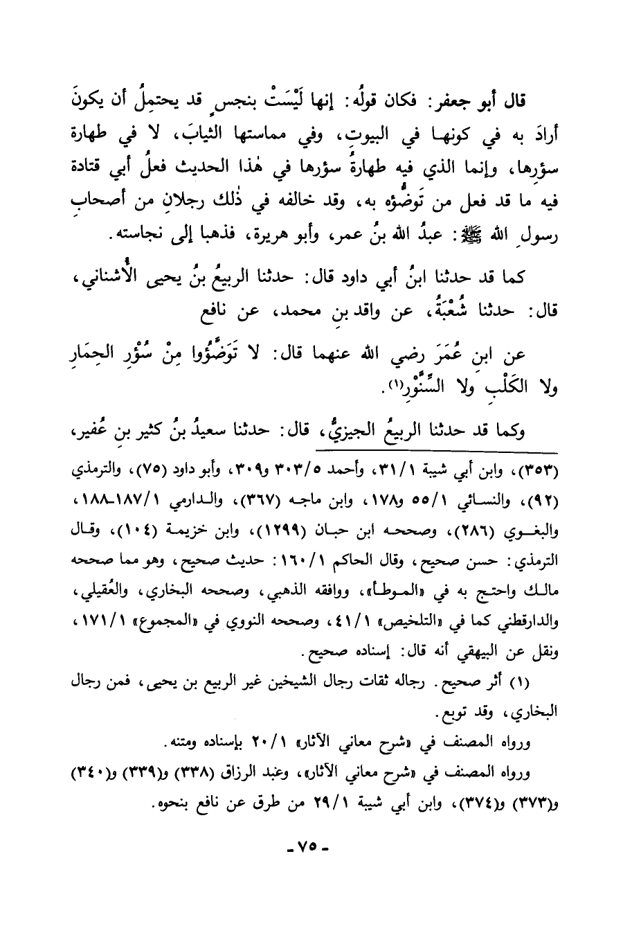 كَمَا قَدْ حَدَّثَنَا ابْنُ أَبِي دَاوُدَ قَالَ: حَدَّثَنَا الرَّبِيعُ بْنُ يَحْيَى الْأُشْنَانِيُّ قَالَ: حَدَّثَنَا شُعْبَةُ، عَنْ وَاقِدِ بْنِ مُحَمَّدٍ، عَنْ نَافِعٍ، عَنِ ابْنِ عُمَرَ رَضِيَ اللهُ عَنْهُمَا قَالَ: " لَا تَوَضَّئُوا مِنْ سُؤْرِ الْحِمَارِ وَلَا الْكَلْبِ وَلَا السِّنَّوْرِ "