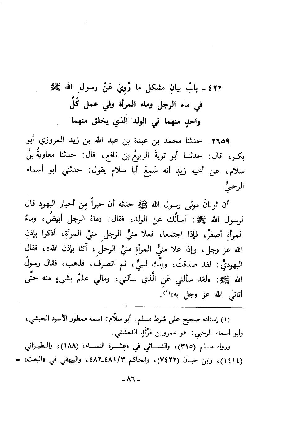 2659 - حَدَّثَنَا مُحَمَّدُ بْنُ عَبْدَةَ بْنِ عَبْدِ اللهِ بْنِ زَيْدٍ الْمَرْوَزِيِّ أَبُو بَكْرٍ قَالَ: حَدَّثَنَا أَبُو تَوْبَةَ الرَّبِيعُ بْنُ نَافِعٍ قَالَ: حَدَّثَنَا مُعَاوِيَةُ بْنُ سَلَّامٍ، عَنْ أَخِيهِ زَيْدٍ أَنَّهُ سَمِعَ أَبَا سَلَّامٍ يَقُولُ: حَدَّثَنِي أَبُو أَسْمَاءَ الرَّحَبِيُّ، أَنَّ ثَوْبَانَ مَوْلَى رَسُولِ اللهِ صَلَّى اللَّهُ عَلَيْهِ وَسَلَّمَ حَدَّثَهُ أَنَّ حَبْرًا مِنْ أَحْبَارِ الْيَهُودِ قَالَ لِرَسُولِ اللهِ صَلَّى اللَّهُ عَلَيْهِ وَسَلَّمَ: أَسْأَلُكَ عَنِ الْوَلَدِ , فَقَالَ: " مَاءُ الرَّجُلِ أَبْيَضُ وَمَاءُ الْمَرْأَةِ أَصْفَرُ، فَإِذَا اجْتَمَعَا فَعَلَا مَنِيُّ الرَّجُلِ مَنِيَّ الْمَرْأَةِ أَذْكَرَا بِإِذْنِ اللهِ عَزَّ وَجَلَّ، وَإِذَا عَلَا مَنِيُّ الْمَرْأَةِ مَنِيَّ الرَّجُلِ آنَثَا بِإِذْنِ اللهِ " , فَقَالَ الْيَهُودِيُّ: لَقَدْ صَدَقْتَ , وَإِنَّكَ لَنَبِيٌّ , ثُمَّ انْصَرَفَ فَذَهَبَ , فَقَالَ رَسُولُ اللهِ صَلَّى اللَّهُ عَلَيْهِ وَسَلَّمَ: " لَقَدْ سَأَلَنِي عَنِ الَّذِي سَأَلَنِي , وَمَا لِي عِلْمٌ بِشَيْءٍ مِنْهُ حَتَّى أَتَانِي اللهُ عَزَّ وَجَلَّ بِهِ " -[87]- قَالَ أَبُو جَعْفَرٍ: فَفِي هَذَا الْحَدِيثِ أَنَّ مَاءَ الرَّجُلِ إِذَا عَلَا أَذْكَرَا بِإِذْنِ اللهِ عَزَّ وَجَلَّ وَأَنَّ مَاءَ الْمَرْأَةِ إِذَا عَلَا آنَثَا بِإِذْنِ اللهِ , فَقَالَ قَائِلٌ: فَقَدْ رَوَيْتُمْ عَنْ رَسُولِ اللهِ صَلَّى اللَّهُ عَلَيْهِ وَسَلَّمَ أَنَّ مَاءَ أَحَدِهِمَا إِذَا عَلَا مَاءَ الْآخَرِ فَعَلَى غَيْرِ هَذَا الْمَعْنَى