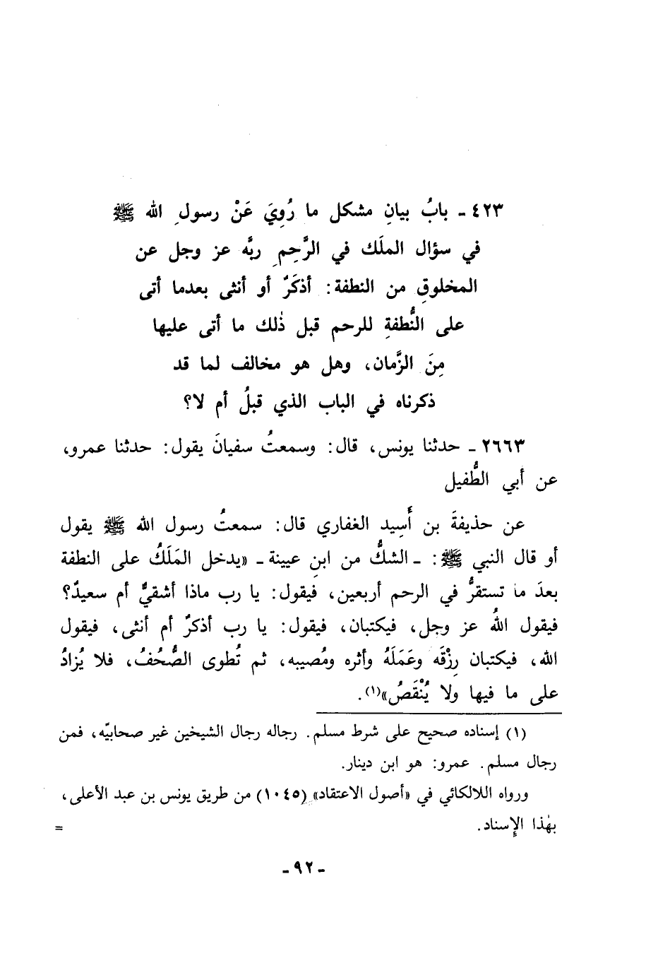 2663 - حَدَّثَنَا يُونُسُ قَالَ: وَسَمِعْتُ سُفْيَانَ يَقُولُ حَدَّثَنَا عَمْرٌو، عَنْ أَبِي الطُّفَيْلِ، عَنْ حُذَيْفَةَ بْنِ أَسِيدٍ الْغِفَارِيِّ قَالَ: سَمِعْتُ رَسُولَ اللهِ صَلَّى اللَّهُ عَلَيْهِ وَسَلَّمَ يَقُولُ أَوْ قَالَ النَّبِيُّ صَلَّى اللَّهُ عَلَيْهِ وَسَلَّمَ - الشَّكُّ مِنَ ابْنِ عُيَيْنَةَ -: " يَدْخُلُ الْمَلَكُ عَلَى النُّطْفَةِ بَعْدَمَا تَسْتَقِرُّ فِي الرَّحِمِ أَرْبَعِينَ , فَيَقُولُ: يَا رَبِّ , مَاذَا أَشَقِيٌّ أَمْ سَعِيدٌ؟ فَيَقُولُ اللهُ عَزَّ وَجَلَّ، فَيَكْتُبَانِ , فَيَقُولُ: يَا رَبِّ , أَذَكَرٌ أَمْ أُنْثَى؟ فَيَقُولُ اللهُ , فَيَكْتُبَانِ رِزْقَهُ، وَعَمَلَهُ، وَأَثَرَهُ، وَمُصِيبَهُ، ثُمَّ تُطْوَى الصُّحُفُ , فَلَا يُزَادُ عَلَى مَا فِيهَا وَلَا يُنْقَصُ "