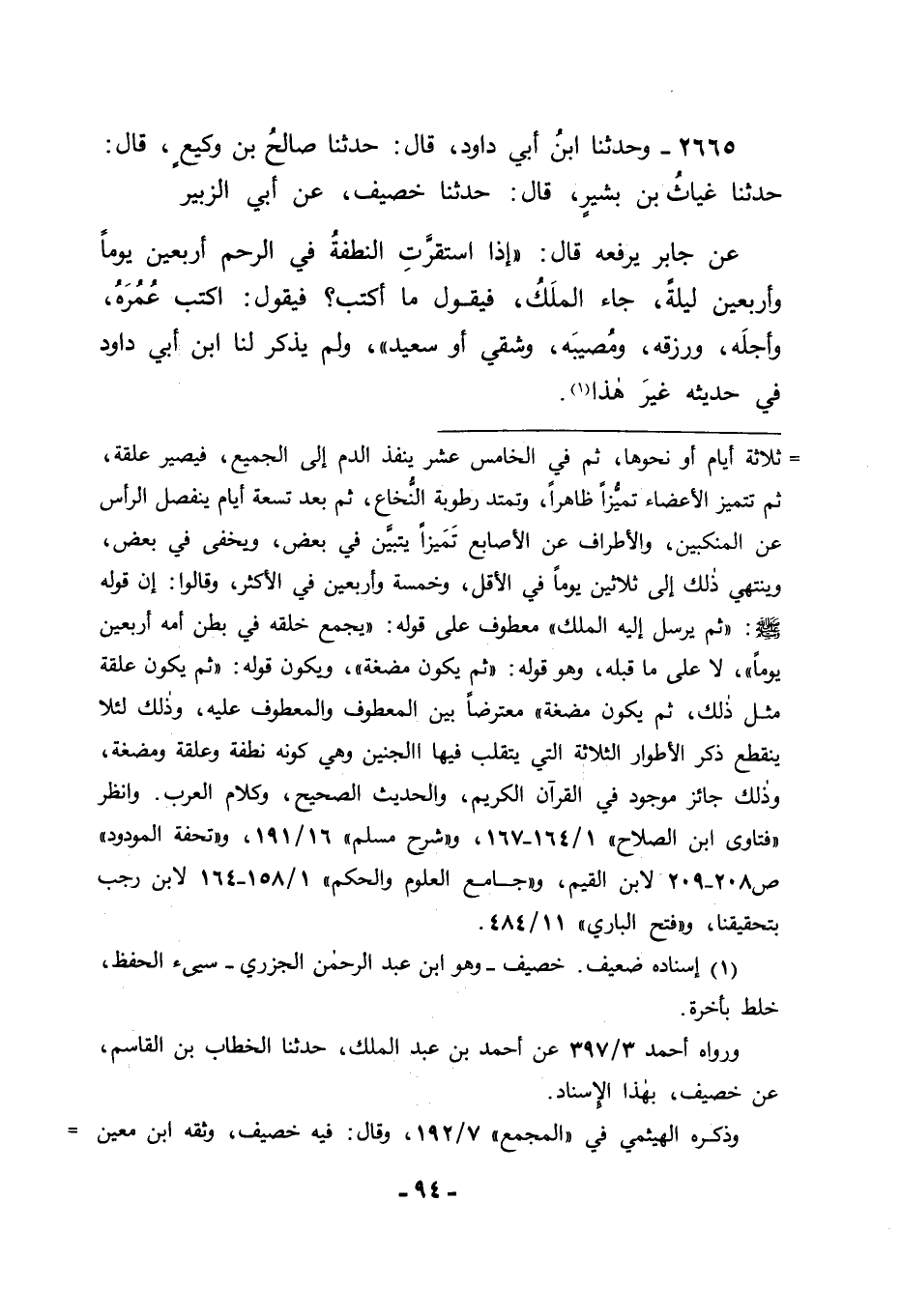 2665 - وَحَدَّثَنَا ابْنُ أَبِي دَاوُدَ قَالَ: حَدَّثَنَا صَالِحُ بْنُ وَكِيعٍ قَالَ: حَدَّثَنَا غِيَاثُ بْنُ بَشِيرٍ قَالَ: حَدَّثَنَا خُصَيْفٌ، عَنْ أَبِي الزُّبَيْرِ، عَنْ جَابِرٍ يَرْفَعُهُ قَالَ: " إِذَا اسْتَقَرَّتِ النُّطْفَةُ فِي الرَّحِمِ أَرْبَعِينَ يَوْمًا وَأَرْبَعِينَ لَيْلَةً جَاءَ الْمَلَكُ , فَيَقُولُ: مَا أَكْتُبُ؟ فَيَقُولُ: اكْتُبْ عُمَرَهُ، وَأَجَلَهُ، وَرِزْقَهُ، وَمُصِيبَهُ، وَشَقِيُّ أَوْ سَعِيدٌ " وَلَمْ يَذْكُرْ لَنَا ابْنُ أَبِي دَاوُدَ فِي حَدِيثِهِ غَيْرَ هَذَا