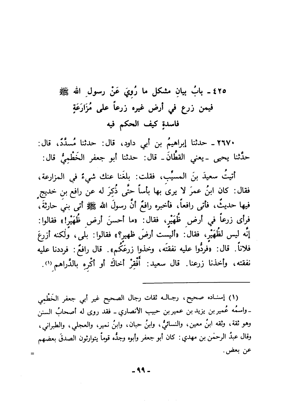 2670 - حَدَّثَنَا إِبْرَاهِيمُ بْنُ أَبِي دَاوُدَ قَالَ: حَدَّثَنَا مُسَدَّدٌ قَالَ: حَدَّثَنَا يَحْيَى يَعْنِي الْقَطَّانَ قَالَ: حَدَّثَنَا أَبُو جَعْفَرٍ الْخِطْمِيُّ قَالَ: أَتَيْتُ سَعِيدَ بْنَ الْمُسَيِّبِ , فَقُلْتُ: بَلَغَنَا عَنْكَ شَيْءٌ فِي الْمُزَارَعَةِ , فَقَالَ: كَانَ ابْنُ عُمَرَ لَا يَرَى بِهَا بَأْسًا حَتَّى ذُكِرَ لَهُ عَنْ رَافِعِ بْنِ خَدِيجٍ فِيهَا حَدِيثٌ , فَأَتَى رَافِعًا فَأَخْبَرَهُ رَافِعٌ أَنَّ رَسُولَ اللهِ صَلَّى اللَّهُ عَلَيْهِ وَسَلَّمَ: أَتَى بَنِي حَارِثَةَ فَرَأَى زَرْعًا فِي أَرْضِ ظُهَيْرٍ , فَقَالَ: " مَا أَحْسَنَ أَرْضَ ظُهَيْرٍ "، فَقَالُوا: إِنَّهُ لَيْسَ لِظُهَيْرٍ , فَقَالَ: " أَلَيْسَتْ أَرْضَ ظُهَيْرٍ؟ " , فَقَالُوا: بَلَى , وَلَكِنَّهُ أَزْرَعَ فُلَانًا. قَالَ: " فَرُدُّوا عَلَيْهِ نَفَقَتَهُ وَخُذُوا زَرْعَكُمْ " قَالَ: رَافِعٌ: " فَرَدَدْنَا عَلَيْهِ نَفَقَتَهُ وَأَخَذْنَا زَرْعَنَا ". قَالَ: سَعِيدٌ: أَفْقِرْ أَخَاكَ أَوْ أَكْرِهِ بِالدَّرَاهِمِ. -[100]-
