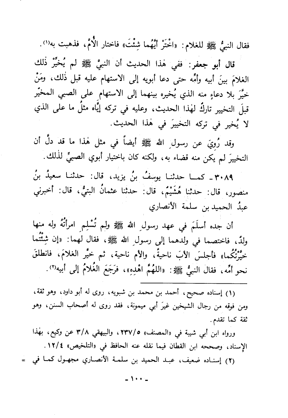 3089 - كَمَا حَدَّثَنَا يُوسُفُ بْنُ يَزِيدَ قَالَ: حَدَّثَنَا سَعِيدُ بْنُ مَنْصُورٍ قَالَ: حَدَّثَنَا هُشَيْمٌ قَالَ: حَدَّثَنَا عُثْمَانُ الْبَتِّيُّ قَالَ: أَخْبَرَنِي عَبْدُ الْحَمِيدِ بْنُ سَلَمَةَ الْأَنْصَارِيُّ: أَنَّ جَدَّهُ أَسْلَمَ فِي عَهْدِ رَسُولِ اللهِ صَلَّى اللَّهُ عَلَيْهِ وَسَلَّمَ وَلَمْ تُسْلِمِ امْرَأَتُهُ، وَلَهُ مِنْهَا وَلَدٌ، فَاخْتَصَمَا فِي وَلَدِهِمَا إلَى رَسُولِ اللهِ صَلَّى اللَّهُ عَلَيْهِ وَسَلَّمَ، فَقَالَ لَهُمَا: " إنْ شِئْتُمَا خَيَّرْتُكُمَا "، فَأَجْلَسَ الْأَبَ نَاحِيَةً، وَالْأُمَّ نَاحِيَةً، ثُمَّ خَيَّرَ الْغُلَامَ، فَانْطَلَقَ نَحْوَ أُمِّهِ، فَقَالَ النَّبِيُّ صَلَّى اللَّهُ عَلَيْهِ وَسَلَّمَ: " اللهُمَّ اهْدِهِ "، فَرَجَعَ الْغُلَامُ إلَى أَبِيهِ. -[101]- هَكَذَا رَوَى هُشَيْمٌ هَذَا الْحَدِيثَ عَنْ عَبْدِ الْحَمِيدِ، وَقَدْ خَالَفَهُ غَيْرُهُ فِي إسْنَادِهِ، فَرَوَاهُ زَائِدًا عَلَى مَا رَوَاهُ عَلَيْهِ هُشَيْمٌ.