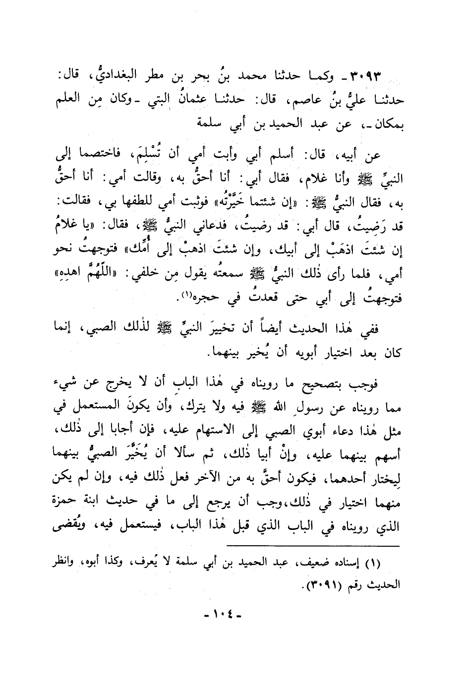 3093 - وَكَمَا حَدَّثَنَا مُحَمَّدُ بْنُ بَحْرِ بْنِ مَطَرٍ الْبَغْدَادِيُّ قَالَ حَدَّثَنَا عَلِيُّ بْنُ عَاصِمٍ قَالَ: حَدَّثَنَا عُثْمَانُ الْبَتِّيُّ وَكَانَ مِنَ الْعِلْمِ بِمَكَانٍ، عَنْ عَبْدِ الْحَمِيدِ بْنِ أَبِي سَلَمَةَ، عَنْ أَبِيهِ قَالَ: " أَسْلَمَ أَبِي وَأَبَتْ أُمِّي أَنْ تُسْلِمَ، فَاخْتَصَمَا إلَى النَّبِيِّ صَلَّى اللَّهُ عَلَيْهِ وَسَلَّمَ وَأَنَا غُلَامٌ، فَقَالَ أَبِي: أَنَا أَحَقُّ بِهِ، وَقَالَتْ أُمِّي: أَنَا أَحَقُّ بِهِ، فَقَالَ النَّبِيُّ صَلَّى اللَّهُ عَلَيْهِ وَسَلَّمَ: " إنْ شِئْتُمَا خَيَّرْتُهُ "، فَوَثَبَتْ أُمِّي لِلُطْفِهَا بِي فَقَالَتْ: قَدْ رَضِيتُ، قَالَ أَبِي: قَدْ رَضِيتُ، فَدَعَانِي النَّبِيُّ صَلَّى اللَّهُ عَلَيْهِ وَسَلَّمَ فَقَالَ: " يَا غُلَامُ، إنْ شِئْتَ اذْهَبْ إلَى أَبِيكَ , وَإِنْ شِئْتَ اذْهَبْ إلَى أُمِّكَ "، فَتَوَجَّهْتُ نَحْوَ أُمِّي، فَلَمَّا رَأَى ذَلِكَ النَّبِيُّ صَلَّى اللَّهُ عَلَيْهِ وَسَلَّمَ سَمِعْتُهُ يَقُولُ مِنْ خَلْفِي: " اللهُمَّ اهْدِهِ "، فَتَوَجَّهْتُ إلَى أَبِي حَتَّى قَعَدْتُ فِي حِجْرِهِ ". فَفِي هَذَا الْحَدِيثِ أَيْضًا أَنَّ تَخْيِيرَ النَّبِيِّ صَلَّى اللَّهُ عَلَيْهِ وَسَلَّمَ لِذَلِكَ الصَّبِيِّ إنَّمَا كَانَ بَعْدَ اخْتِيَارِ أَبَوَيْهِ أَنْ يُخَيَّرَ بَيْنَهُمَا، فَوَجَبَ بِتَصْحِيحِ مَا رُوِّينَاهُ فِي هَذَا الْبَابِ أَنْ لَا يَخْرُجَ عَنْ شَيْءٍ مِمَّا رُوِّينَاهُ عَنْ رَسُولِ اللهِ صَلَّى اللَّهُ عَلَيْهِ وَسَلَّمَ فِيهِ وَلَا يُتْرَكَ , وَأَنْ يَكُونَ الْمُسْتَعْمَلُ فِي مِثْلِ هَذَا دُعَاءَ أَبَوَيِ الصَّبِيِّ إلَى الِاسْتِهَامِ عَلَيْهِ، فَإِنْ أَجَابَا إلَى ذَلِكَ أُسْهِمَ بَيْنَهُمَا عَلَيْهِ , وَإِنْ أَبَيَا ذَلِكَ ثُمَّ سَأَلَا أَنْ يُخَيَّرَ الصَّبِيُّ بَيْنَهُمَا لِيَخْتَارَ أَحَدَهُمَا فَيَكُونَ أَحَقَّ بِهِ مِنَ الْآخَرِ فَعَلَ ذَلِكَ فِيهِ , وَإِنْ لَمْ يَكُنْ مِنْهُمَا اخْتِيَارٌ فِي ذَلِكَ وَجَبَ أَنْ يُرْجَعَ إلَى مَا فِي حَدِيثِ ابْنَةِ حَمْزَةَ الَّذِي رُوِّينَاهُ فِي الْبَابِ الَّذِي قَبْلَ هَذَا الْبَابِ، فَيُسْتَعْمَلُ فِيهِ وَيُقْضَى -[105]- بِهِ لِمَنْ يَرَاهُ الْحَاكِمُ فِيهِ أَوْلَى بِهِ مِنَ الْمُخْتَصِمِينَ إلَيْهِ فِيهِ وَعَبْدُ الْحَمِيدِ صَاحِبُ هَذَا الْحَدِيثِ قَدْ بَيَّنَهُ لَنَا عِيسَى بْنُ يُونُسَ فِي رِوَايَتِهِ إيَّاهُ عَنْهُ، وَأَنَّهُ عَبْدُ الْحَمِيدِ بْنُ جَعْفَرٍ، وَكَانَ مَا نَسَبَهُ إلَيْهِ غَيْرُهُ مِمَّنْ رَوَاهُ عَنْهُ مِمَّنْ ذَكَرْنَاهُ فِي هَذَا الْبَابِ. فَقَالَ هُشَيْمٌ: فِيهِ ابْنُ سَلَمَةَ، وَوَافَقَهُ عَلَى ذَلِكَ حَمَّادُ بْنُ سَلَمَةَ، وَقَالَ فِيهِ عَلِيُّ بْنُ عَاصِمٍ: عَبْدُ الْحَمِيدِ بْنُ أَبِي سَلَمَةَ، فَكُلُّ مَنْ نَسَبَهُ إلَى غَيْرِ جَعْفَرٍ فَإِنَّمَا نَسَبَهُ إلَى كُنْيَةِ أَبِيهِ، أَوْ إلَى أَبٍ مِنْ آبَائِهِ يُسَمَّى بِذَلِكَ الِاسْمِ الَّذِي ذَكَرَهُ بِهِ. وَقَدْ حَدَّثَنِي أَحْمَدُ بْنُ مُحَمَّدٍ الْبَغْدَادِيُّ قَالَ: حَدَّثَنَا أَبُو حَفْصٍ عَمْرُو بْنُ عَلِيٍّ قَالَ: سَمِعْتُ أَبَا عَاصِمٍ يَقُولُ: سَمِعْتُ عَبْدَ الْحَمِيدِ بْنَ جَعْفَرٍ يَقُولُ: أَنَا حَدَّثْتُ الْبَتِّيَّ بِحَدِيثِ التَّخْيِيرِ بِالْأَهْوَازِ. فَبَانَ بِذَلِكَ أَنَّ عَبْدَ الْحَمِيدِ هَذَا الْمَذْكُورَ فِي هَذِهِ الْآثَارِ هُوَ عَبْدُ الْحَمِيدِ بْنُ جَعْفَرٍ كَمَا قَالَ عِيسَى بْنُ يُونُسَ فِي الْحَدِيثِ الَّذِي رُوِّينَاهُ عَنْهُ فِي هَذَا الْبَابِ. وَقَدْ رُوِيَ عَنْ أَبِي بَكْرٍ الصِّدِّيقِ رَضِيَ اللهُ عَنْهُ أَنَّهُ قَضَى فِي مِثْلِ هَذَا بَيْنَ عُمَرَ بْنِ الْخَطَّابِ رَضِيَ اللهُ عَنْهُ وَبَيْنَ أُمِّ عَاصِمٍ ابْنِهِ الَّتِي كَانَ 