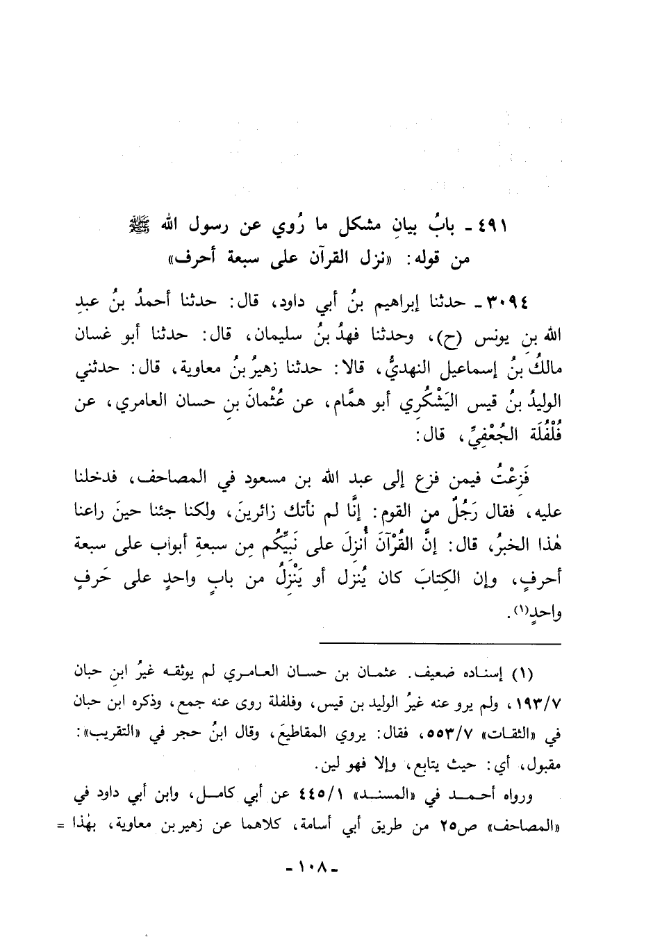 3094 - حَدَّثَنَا إبْرَاهِيمُ بْنُ أَبِي دَاوُدَ قَالَ: حَدَّثَنَا أَحْمَدُ بْنُ عَبْدِ اللهِ بْنِ يُونُسَ ح وَحَدَّثَنَا فَهْدُ بْنُ سُلَيْمَانَ قَالَ: حَدَّثَنَا أَبُو غَسَّانَ مَالِكُ بْنُ إسْمَاعِيلَ النَّهْدِيُّ قَالَا: حَدَّثَنَا زُهَيْرُ بْنُ مُعَاوِيَةَ قَالَ: حَدَّثَنِي الْوَلِيدُ بْنُ قَيْسٍ الْيَشْكَرِيُّ أَبُو هَمَّامٍ، عَنْ عُثْمَانَ بْنِ حَسَّانَ الْعَامِرِيِّ، عَنْ فُلْفُلَةَ الْجُعْفِيِّ قَالَ: " فَزِعْتُ فِيمَنْ فَزِعَ إلَى عَبْدِ اللهِ بْنِ مَسْعُودٍ فِي الْمَصَاحِفِ، فَدَخَلْنَا عَلَيْهِ، فَقَالَ رَجُلٌ مِنَ الْقَوْمِ: إنَّا لَمْ نَأْتِكَ زَائِرِينَ؛ وَلَكِنَّا جِئْنَا حِينَ رَاعَنَا هَذَا الْخَبَرُ، قَالَ: " إنَّ الْقُرْآنَ أُنْزِلَ عَلَى نَبِيِّكُمْ مِنْ سَبْعَةِ أَبْوَابٍ عَلَى سَبْعَةِ أَحْرُفٍ، وَإِنَّ الْكِتَابَ كَانَ يَنْزِلُ أَوْ يُنْزَلُ مِنْ بَابٍ وَاحِدٍ عَلَى حَرْفٍ وَاحِدٍ "
