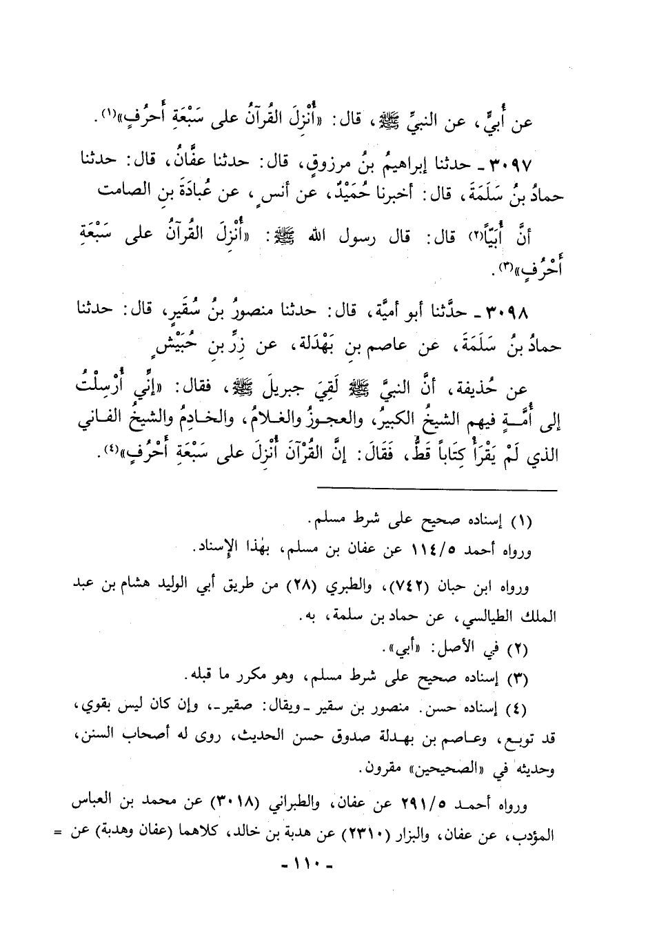 3097 - حَدَّثَنَا إبْرَاهِيمُ بْنُ مَرْزُوقٍ قَالَ: ثنا عَفَّانُ قَالَ: ثنا حَمَّادُ بْنُ سَلَمَةَ قَالَ: أَنَا حُمَيْدٌ، عَنْ أَنَسٍ، عَنْ عُبَادَةَ بْنِ الصَّامِتِ، أَنَّ أُبَيًّا قَالَ: قَالَ رَسُولُ اللهِ صَلَّى اللَّهُ عَلَيْهِ وَسَلَّمَ: " أُنْزِلَ الْقُرْآنُ عَلَى سَبْعَةِ أَحْرُفٍ "
