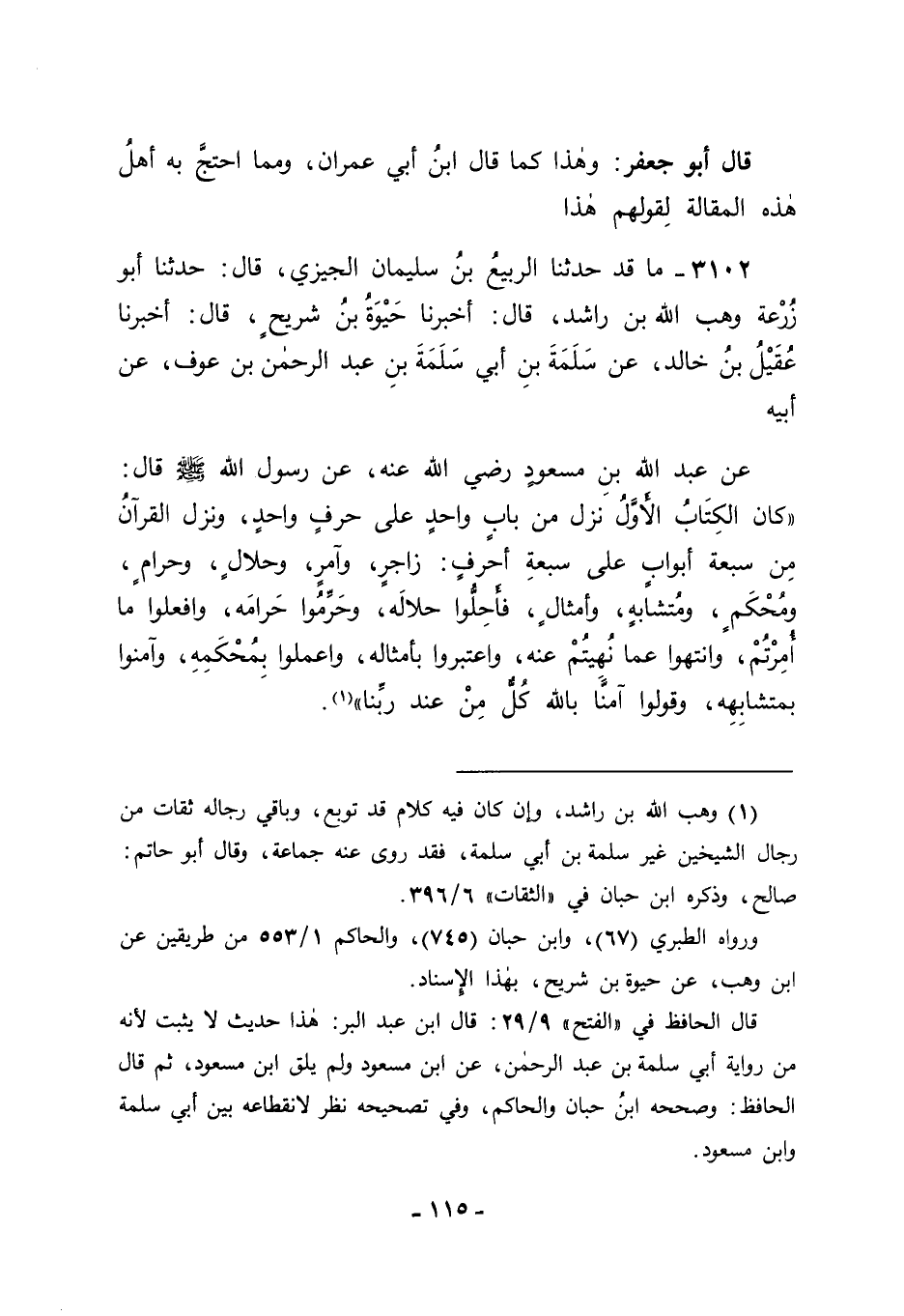 3102 - مَا قَدْ حَدَّثَنَا الرَّبِيعُ بْنُ سُلَيْمَانَ الْجِيزِيُّ قَالَ: حَدَّثَنَا أَبُو زُرْعَةَ وَهْبُ اللهِ بْنُ رَاشِدٍ قَالَ: أَخْبَرَنَا حَيْوَةُ بْنُ شُرَيْحٍ قَالَ: أَخْبَرَنَا عُقَيْلُ بْنُ خَالِدٍ، عَنْ سَلَمَةَ بْنِ أَبِي سَلَمَةَ بْنِ عَبْدِ الرَّحْمَنِ بْنِ عَوْفٍ، عَنْ أَبِيهِ، عَنْ عَبْدِ اللهِ بْنِ مَسْعُودٍ رَضِيَ اللهُ عَنْهُ، عَنْ رَسُولِ اللهِ صَلَّى اللَّهُ عَلَيْهِ وَسَلَّمَ قَالَ:: " كَانَ الْكِتَابُ الْأَوَّلُ نَزَلَ مِنْ بَابٍ وَاحِدٍ، عَلَى حَرْفٍ وَاحِدٍ، وَنَزَلَ الْقُرْآنُ مِنْ سَبْعَةِ أَبْوَابٍ، عَلَى سَبْعَةِ أَحْرُفٍ: زَاجِرٍ، وَآمِرٍ، وَحَلَالٍ، وَحَرَامٍ، وَمُحْكَمٍ، وَمُتَشَابِهٍ، وَأَمْثَالٍ، فَأَحِلُّوا حَلَالَهُ , وَحَرِّمُوا حَرَامَهُ , وَافْعَلُوا مَا أُمِرْتُمْ، وَانْتَهُوا عَمَّا نُهِيتُمْ عَنْهُ , وَاعْتَبِرُوا بِأَمْثَالِهِ , وَاعْمَلُوا بِمُحْكَمِهِ , وَآمِنُوا بِمُتَشَابِهِهِ , وَقُولُوا: آمَنَّا بِاللهِ، كُلٌّ مِنْ عِنْدِ رَبِّنَا ". -[116]-