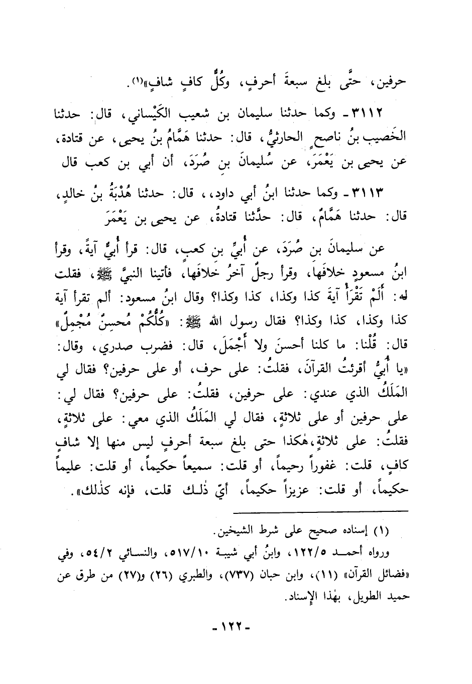 3113 - وَكَمَا حَدَّثَنَا ابْنُ أَبِي دَاوُدَ قَالَ: حَدَّثَنَا هُدْبَةُ بْنُ خَالِدٍ قَالَ: حَدَّثَنَا هَمَّامٌ قَالَ: حَدَّثَنَا قَتَادَةُ، عَنْ يَحْيَى بْنِ يَعْمُرَ، عَنْ سُلَيْمَانَ بْنِ صُرَدٍ، عَنْ أُبَيِّ بْنِ كَعْبٍ قَالَ: " قَرَأَ أُبَيٌّ آيَةً، وَقَرَأَ ابْنُ مَسْعُودٍ خِلَافَهَا، وَقَرَأَ رَجُلٌ آخَرُ خِلَافَهَا، فَأَتَيْنَا النَّبِيَّ صَلَّى اللَّهُ عَلَيْهِ وَسَلَّمَ، فَقُلْتُ لَهُ: أَلَمْ تَقْرَأْ آيَةَ كَذَا وَكَذَا , كَذَا وَكَذَا؟ وَقَالَ ابْنُ مَسْعُودٍ: أَلَمْ تَقْرَأْ آيَةَ كَذَا وَكَذَا , كَذَا وَكَذَا؟ فَقَالَ رَسُولُ اللهِ صَلَّى اللَّهُ عَلَيْهِ وَسَلَّمَ: " كُلُّكُمْ مُحْسِنٌ مُجْمِلٌ "، قَالَ: قُلْنَا: مَا كُلُّنَا أَحْسَنَ وَلَا أَجْمَلَ، قَالَ: فَضَرَبَ صَدْرِي وَقَالَ: " يَا أُبَيُّ، أُقْرِأْتُ الْقُرْآنَ، فَقُلْتُ: عَلَى حَرْفٍ أَوْ عَلَى حَرْفَيْنِ؟ فَقَالَ لِيَ الْمَلَكُ الَّذِي عِنْدِي: عَلَى حَرْفَيْنِ , فَقُلْتُ: عَلَى حَرْفَيْنِ؟ فَقَالَ لِي: عَلَى حَرْفَيْنِ أَوْ عَلَى ثَلَاثَةٍ , فَقَالَ لِيَ الْمَلَكُ الَّذِي مَعِي: عَلَى ثَلَاثَةٍ، فَقُلْتُ: عَلَى ثَلَاثَةٍ، هَكَذَا حَتَّى بَلَغَ سَبْعَةَ أَحْرُفٍ، لَيْسَ مِنْهَا إِلَّا شَافٍ كَافٍ قُلْتَ: غَفُورًا رَحِيمًا، أَوْ قُلْتَ: سَمِيعًا حَكِيمًا، أَوْ قُلْتَ: عَلِيمًا حَكِيمًا، أَوْ قُلْتَ عَزِيزًا حَكِيمًا، أَيَّ ذَلِكَ قُلْتَ فَإِنَّهُ كَذَلِكَ ". -[123]- وَزَادَ سُلَيْمَانُ فِي حَدِيثِهِ " مَا لَمْ يُخْتَمْ عَذَابٌ بِرَحْمَةٍ، أَوْ رَحْمَةٌ بِعَذَابٍ "