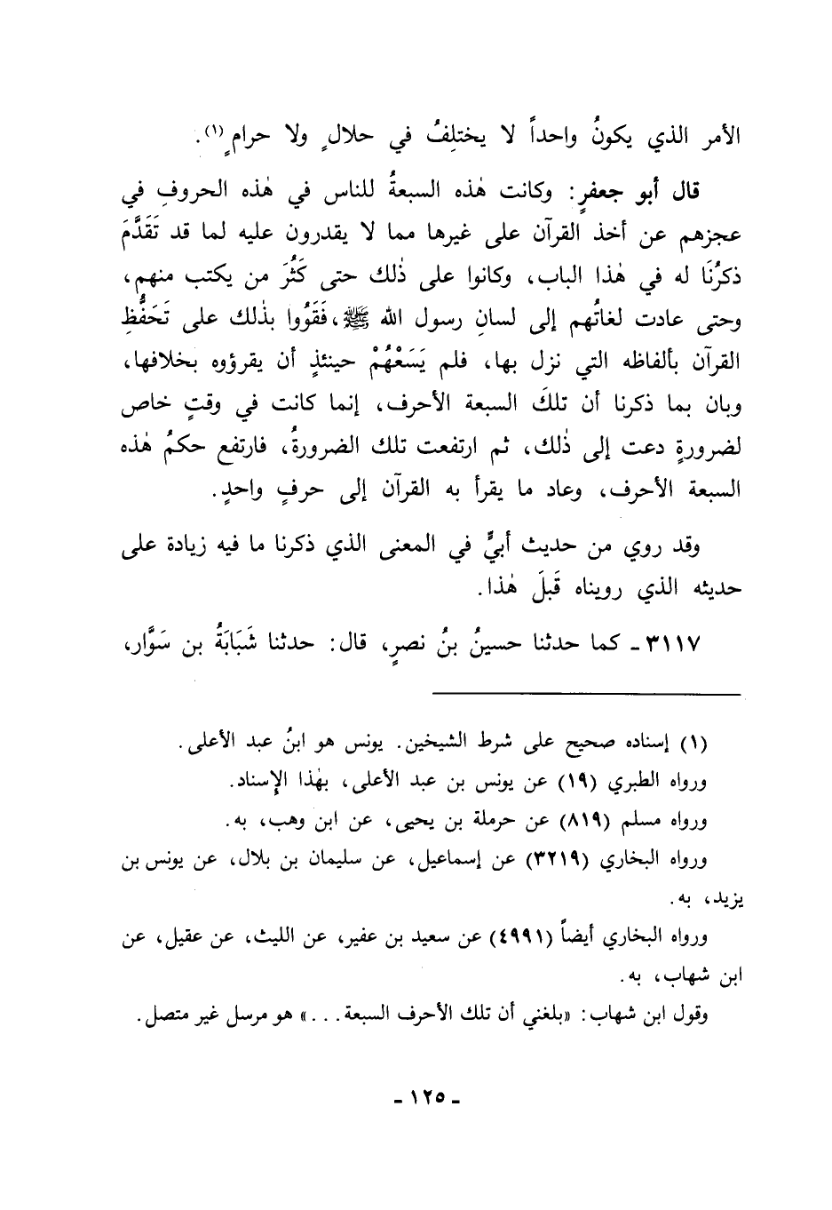 3117 - كَمَا حَدَّثَنَا حُسَيْنُ بْنُ نَصْرٍ قَالَ: حَدَّثَنَا شَبَابَةُ بْنُ سَوَّارٍ، -[126]- وَعَبْدُ الرَّحْمَنِ بْنُ زِيَادٍ قَالَا: حَدَّثَنَا شُعْبَةُ، عَنِ الْحَكَمِ، عَنْ مُجَاهِدٍ، عَنِ ابْنِ أَبِي لَيْلَى، عَنْ أُبَيِّ بْنِ كَعْبٍ أَنَّ النَّبِيَّ صَلَّى اللَّهُ عَلَيْهِ وَسَلَّمَ كَانَ عَلَى أَضَاةِ بَنِي غِفَارٍ، فَأَتَاهُ جِبْرِيلُ فَقَالَ: " إنَّ اللهَ يَأْمُرُكَ أَنْ تَقْرَأَ أَنْتَ وَأُمَّتُكَ عَلَى حَرْفٍ "، فَقَالَ رَسُولُ اللهِ صَلَّى اللَّهُ عَلَيْهِ وَسَلَّمَ: " أَسْأَلُ اللهَ مُعَافَاتَهُ وَمَغْفِرَتَهُ، إنَّ أُمَّتِي لَا تَسْتَطِيعُ ذَلِكَ "، ثُمَّ رَجَعَ إلَيْهِ الثَّانِيَةَ فَقَالَ: " إنَّ اللهَ يَأْمُرُكَ أَنْ تَقْرَأَ الْقُرْآنَ عَلَى حَرْفَيْنِ " , فَقَالَ: " أَسْأَلُ اللهَ مُعَافَاتَهُ وَمَغْفِرَتَهُ , إنَّ أُمَّتِي لَا تُطِيقُ ذَلِكَ " , ثُمَّ أَتَاهُ الثَّالِثَةَ , فَقَالَ لَهُ مِثْلَ ذَلِكَ، فَقَالَ لَهُ النَّبِيُّ صَلَّى اللَّهُ عَلَيْهِ وَسَلَّمَ مِثْلَ ذَلِكَ ثُمَّ أَتَاهُ الرَّابِعَةَ فَقَالَ: " إنَّ اللهَ يَأْمُرُكَ وَأُمَّتَكَ أَنْ تَقْرَءُوا الْقُرْآنَ، عَلَى سَبْعَةِ أَحْرُفٍ، كُلَّمَا قَرَءُوا بِهَا أَصَابُوا ". وَرُوِيَ عَنْ أَبِي بَكْرَةَ فِي هَذَا الْمَعْنَى أَيْضًا.