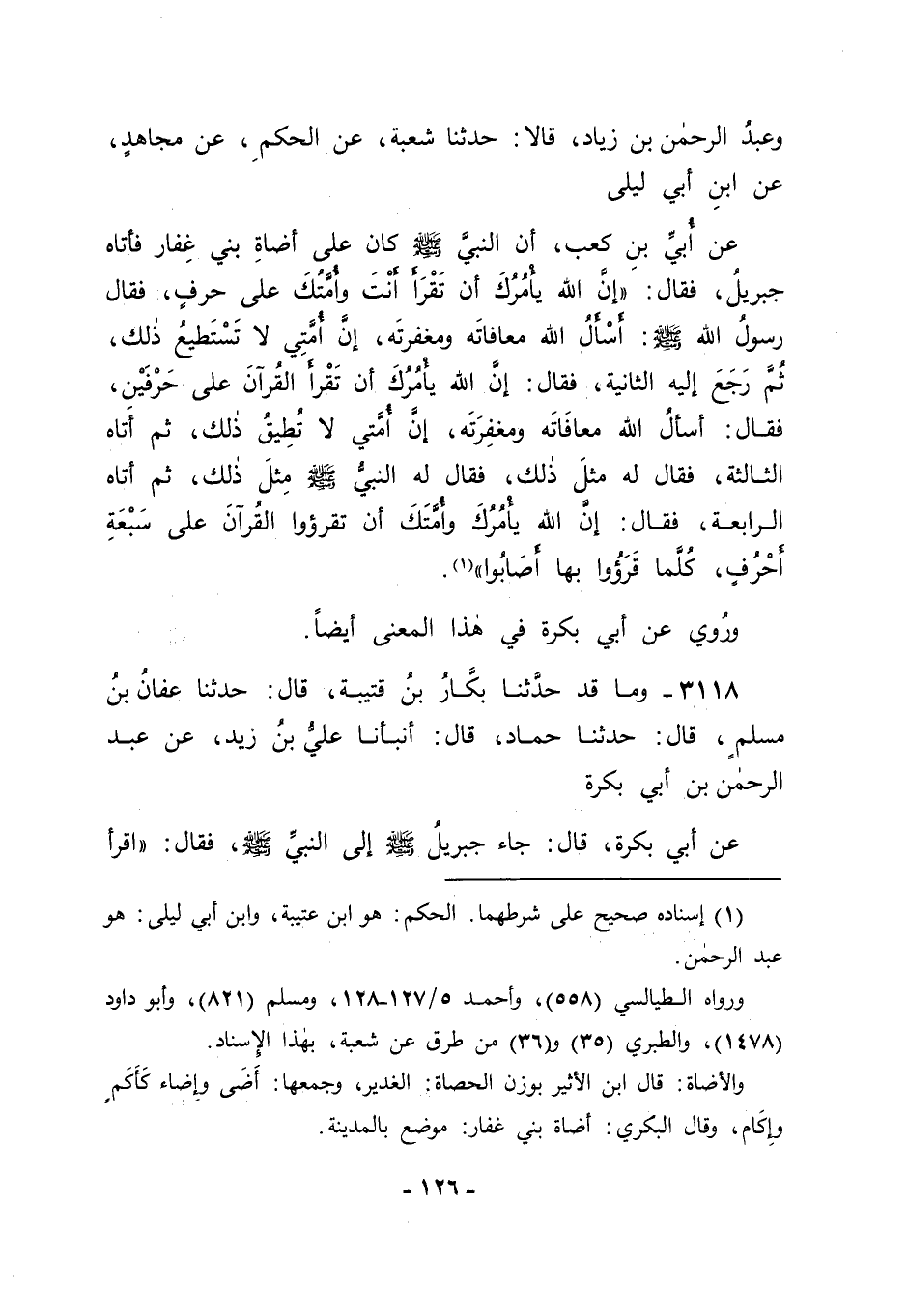 3118 - وَمَا قَدْ حَدَّثَنَا بَكَّارُ بْنُ قُتَيْبَةَ قَالَ: حَدَّثَنَا عَفَّانَ بْنُ مُسْلِمٍ قَالَ: حَدَّثَنَا حَمَّادٌ قَالَ: أَنْبَأَنَا عَلِيُّ بْنُ زَيْدٍ، عَنْ عَبْدِ الرَّحْمَنِ بْنِ أَبِي بَكْرَةَ، عَنْ أَبِي بَكْرَةَ قَالَ: جَاءَ جِبْرِيلُ صَلَّى اللَّهُ عَلَيْهِ وَسَلَّمَ إلَى النَّبِيِّ صَلَّى اللَّهُ عَلَيْهِ وَسَلَّمَ فَقَالَ: " اقْرَأْ -[127]- عَلَى حَرْفٍ "، قَالَ: فَقَالَ مِيكَائِيلُ: " اسْتَزِدْهُ "، فَقَالَ: " اقْرَأْ عَلَى حَرْفَيْنِ " , فَقَالَ مِيكَائِيلُ: " اسْتَزِدْهُ "، حَتَّى بَلَغَ إلَى سَبْعَةِ أَحْرُفٍ، فَقَالَ: " اقْرَأْهُ، فَكُلٌّ كَافٍ شَافٍ، إِلَّا أَنْ تَخْلِطَ آيَةَ رَحْمَةٍ بِآيَةِ عَذَابٍ، أَوْ آيَةَ عَذَابٍ بِآيَةِ رَحْمَةٍ، عَلَى نَحْوِ: هَلُمَّ وَتَعَالَ، وَأَقْبِلْ وَاذْهَبْ، وَأَسْرِعْ وَعَجِّلْ ". فَدَلَّ مَا فِي هَذَيْنِ الْحَدِيثَيْنِ أَيْضًا عَلَى مَا قَدْ ذَكَرْنَاهُ مِمَّا حَمَلْنَا وُجُوهَ هَذِهِ الْآثَارِ عَلَيْهِ، وَمِمَّا يَدُلُّ عَلَى عَوْدِ التِّلَاوَةِ إلَى حَرْفٍ قَبْلَهُمَا وَاحِدٍ بَعْدَمَا كَانَتْ قَبْلَ ذَلِكَ عَلَى الْأَحْرُفِ السَّبْعَةِ الَّتِي ذَكَرْنَا مَا قَدْ كَانَ مِنْ أَبِي بَكْرٍ الصِّدِّيقِ رَضِيَ اللهُ عَنْهُ مِنْ جَمْعِهِ الْقُرْآنَ وَاكْتِتَابِهِ فِيمَا كَانَ اكْتَتَبَهُ فِيهِ.