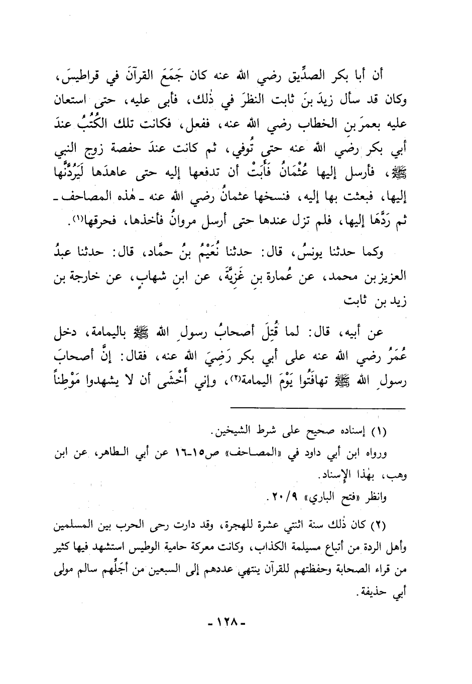 وَكَمَا حَدَّثَنَا يُونُسُ قَالَ: حَدَّثَنَا نُعَيْمُ بْنُ حَمَّادٍ قَالَ: حَدَّثَنَا عَبْدُ الْعَزِيزِ بْنُ مُحَمَّدٍ، عَنْ عُمَارَةَ بْنِ غَزِيَّةَ، عَنِ ابْنِ شِهَابٍ، عَنْ خَارِجَةَ بْنِ زَيْدِ بْنِ ثَابِتٍ، عَنْ أَبِيهِ قَالَ: لَمَّا قُتِلَ أَصْحَابُ رَسُولِ اللهِ صَلَّى اللَّهُ عَلَيْهِ وَسَلَّمَ بِالْيَمَامَةِ دَخَلَ عُمَرُ رَضِيَ اللهُ عَنْهُ عَلَى أَبِي بَكْرٍ رَضِيَ اللهُ عَنْهُ، فَقَالَ: إنَّ أَصْحَابَ رَسُولِ اللهِ صَلَّى اللَّهُ عَلَيْهِ وَسَلَّمَ تَهَافَتُوا يَوْمَ الْيَمَامَةِ , وَإِنِّي أَخْشَى أَنْ لَا يَشْهَدُوا مَوْطِنًا -[129]- إِلَّا فَعَلُوا ذَلِكَ فِيهِ حَتَّى يُقْتَلُوا وَهُمْ حَمَلَةُ الْقُرْآنِ فَيَضِيعَ الْقُرْآنُ وَيُنْسَى، فَلَوْ جَمَعْتَهُ وَكَتَبْتَهُ، فَنَفَرَ مِنْهَا أَبُو بَكْرٍ رَضِيَ اللهُ عَنْهُ وَقَالَ: " أَفْعَلُ مَا لَمْ يَفْعَلْ رَسُولُ اللهِ صَلَّى اللَّهُ عَلَيْهِ وَسَلَّمَ " ثُمَّ أَرْسَلَ أَبُو بَكْرٍ رَضِيَ اللهُ عَنْهُ إلَى زَيْدِ بْنِ ثَابِتٍ وَعُمَرُ مُحْزَئِلٌّ، يَعْنِي شِبْهَ الْمُتَّكِئِ، فَقَالَ أَبُو بَكْرٍ: " إنَّ هَذَا دَعَانِي إلَى أَمْرٍ فَأَبَيْتُ عَلَيْهِ، وَأَنْتَ كَاتِبُ الْوَحْيِ، فَإِنْ تَكُنْ مَعَهُ اتَّبَعْتُكُمَا , وَإِنْ تُوَافِقْنِي لَمْ أَفْعَلْ مَا قَالَ "، فَاقْتَصَّ أَبُو بَكْرٍ قَوْلَ عُمَرَ فَنَفَرْتُ مِنْ ذَلِكَ وَقُلْتُ: " نَفْعَلُ مَا لَمْ يَفْعَلْ رَسُولُ اللهِ صَلَّى اللَّهُ عَلَيْهِ وَسَلَّمَ "، إلَى أَنْ قَالَ: عُمَرُ رَضِيَ اللهُ عَنْهُ كَلِمَةً، قَالَ: " وَمَا عَلَيْكُمَا لَوْ فَعَلْتُمَا "، فَأَمَرَنِي أَبُو بَكْرٍ رَضِيَ اللهُ عَنْهُ فَكَتَبْتُهُ فِي قِطَعِ الْأَدَمِ وَكِسَرِ الْأَكْتَافِ وَالْعُسُبِ، قَالَ الشَّيْخُ: يَعْنِي الْجَرِيدَ، فَلَمَّا هَلَكَ أَبُو بَكْرٍ وَكَانَ عُمَرُ قَدْ كَتَبَ ذَلِكَ كُلَّهُ فِي صَحِيفَةٍ وَاحِدَةٍ فَكَانَتْ عِنْدَهُ فَلَمَّا هَلَكَ كَانَتْ عِنْدَ حَفْصَةَ، -[130]- ثُمَّ إنَّ حُذَيْفَةَ بْنَ الْيَمَانِ قَدِمَ مِنْ غَزْوَةٍ غَزَاهَا فَرْجِ أَرْمِينِيَةَ، فَلَمْ يَدْخُلْ بَيْتَهُ حَتَّى أَتَى عُثْمَانَ، فَقَالَ: " يَا أَمِيرَ الْمُؤْمِنِينَ، أَدْرِكِ النَّاسَ "، فَقَالَ عُثْمَانُ: " وَمَا ذَاكَ؟ "، فَقَالَ: " غَزَوْتُ أَرْمِينِيَةَ فَحَضَرَهَا أَهْلُ الْعِرَاقِ وَأَهْلُ الشَّامِ وَإِذَا أَهْلُ الشَّامِ يَقْرَءُونَ بِقِرَاءَةِ أُبَيٍّ، فَيَأْتُونَ بِمَا لَمْ يَسْمَعْ أَهْلُ الْعِرَاقِ، فَيُكَفِّرُهُمْ أَهْلُ الْعِرَاقِ , وَإِذَا أَهْلُ الْعِرَاقِ يَقْرَءُونَ بِقِرَاءَةِ عَبْدِ اللهِ بْنِ مَسْعُودٍ فَيَأْتُونَ بِمَا لَمْ يَسْمَعْ أَهْلُ الشَّامِ فَيُكَفِّرُهُمْ أَهْلُ الشَّامِ " قَالَ: زَيْدٌ: " فَأَمَرَنِي عُثْمَانُ أَنْ أَكْتُبَ لَهُ مُصْحَفًا، وَقَالَ: " إنِّي جَاعِلٌ مَعَكَ رَجُلًا لَبِيبًا فَصِيحًا، فَمَا اجْتَمَعْتُمَا فِيهِ فَاكْتُبَاهُ , وَمَا اخْتَلَفْتُمَا فِيهِ فَارْفَعَاهُ إلَيَّ "، فَجَعَلَ مَعَهُ أَبَانَ بْنَ سَعِيدِ بْنِ الْعَاصِ فَلَمَّا بَلَغَ: {إنَّ آيَةَ مُلْكِهِ أَنْ يَأْتِيَكُمُ التَّابُوتُ} [البقرة: 248] قَالَ زَيْدٌ: " فَقُلْتُ أَنَا التَّابُوهُ وَقَالَ أَبَانُ: {التَّابُوتُ} [البقرة: 248] ، فَرَفَعْنَا ذَلِكَ إلَى عُثْمَانَ فَكَتَبَ: التَّابُوتَ، ثُمَّ عَرَضْتُهُ، يَعْنِي الْمُصْحَفَ، عَرْضَةً أُخْرَى فَلَمْ أَجِدْ فِيهِ شَيْئًا، وَأَرْسَلَ عُثْمَانُ إلَى حَفْصَةَ أَنْ تُعْطِيَهُ الصَّحِيفَةَ وَحَلَفَ لَهَا لَيَرُدَّنَّهَا إلَيْهَا، فَأَعْطَتْهُ، فَعَرَضْتُ الْمُصْحَفَ عَلَيْهَا فَلَمْ يَخْتَلِفَا فِي شَيْءٍ، فَرَدَّهَا عَلَيْهَا وَطَابَتْ نَفْسُهُ، وَأَمَرَ النَّاسَ أَنْ يَكْتُبُوا الْمَصَاحِفَ ". -[131]- قَالَ أَبُو جَعْفَرٍ: فَوَقَفْنَا بِذَلِكَ