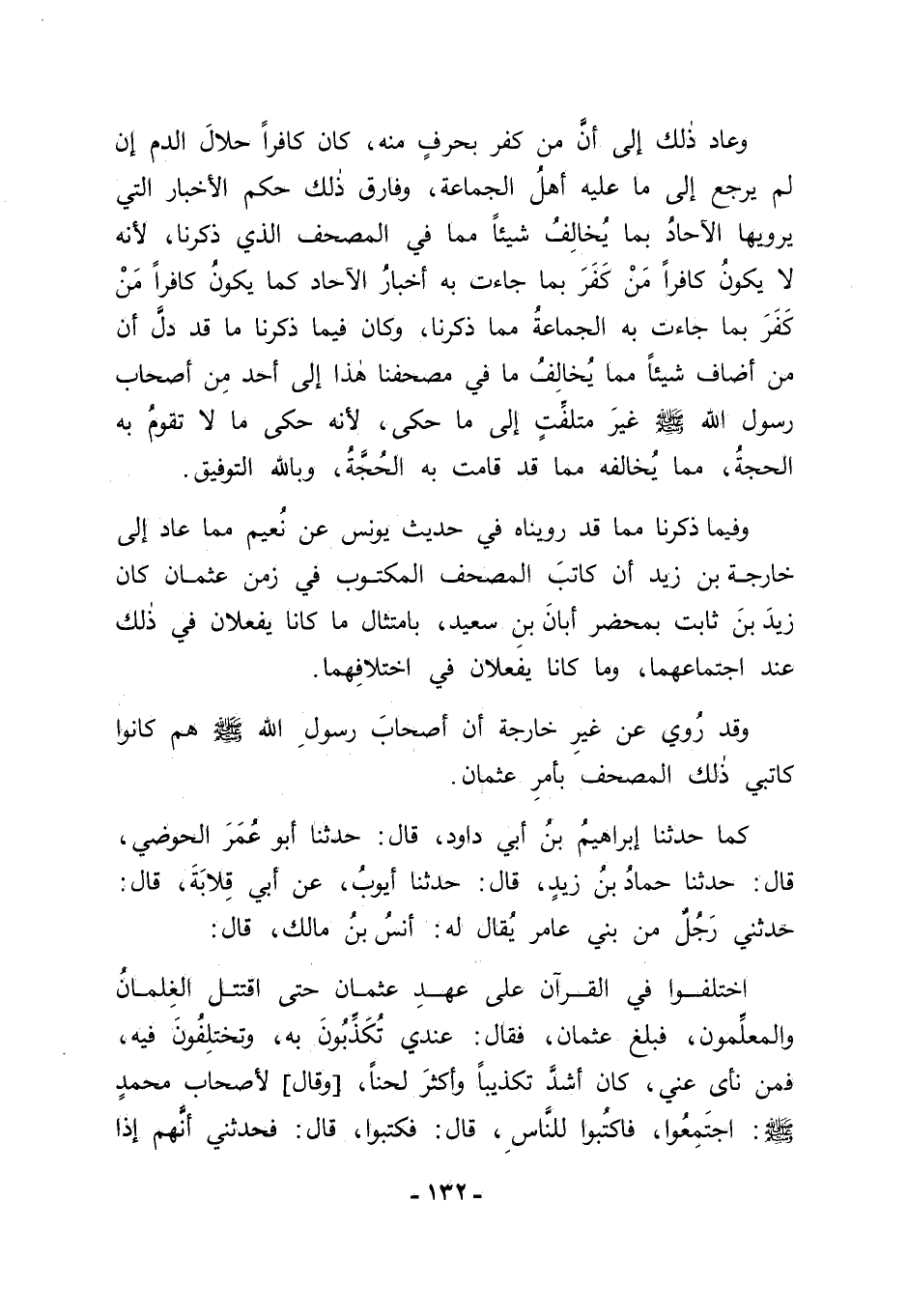 كَمَا حَدَّثَنَا إبْرَاهِيمُ بْنُ أَبِي دَاوُدَ قَالَ: حَدَّثَنَا أَبُو عُمَرَ الْحَوْضِيُّ قَالَ: حَدَّثَنَا حَمَّادُ بْنُ زَيْدٍ قَالَ: حَدَّثَنَا أَيُّوبُ، عَنْ أَبِي قِلَابَةَ قَالَ: حَدَّثَنِي رَجُلٌ مِنْ بَنِي عَامِرٍ يُقَالُ لَهُ أَنَسُ بْنُ مَالِكٍ قَالَ: " اخْتَلَفُوا فِي الْقُرْآنِ عَلَى عَهْدِ عُثْمَانَ حَتَّى اقْتَتَلَ الْغِلْمَانُ وَالْمُعَلِّمُونَ، فَبَلَغَ عُثْمَانَ فَقَالَ: " عِنْدِي تَكْذِبُونَ بِهِ وَتَخْتَلِفُونَ فِيهِ فَمَنْ نَأَى عَنِّي كَانَ أَشَدَّ تَكْذِيبًا , وَأَكْثَرَ لَحْنًا "، وَقَالَ لِأَصْحَابِ مُحَمَّدٍ صَلَّى اللَّهُ عَلَيْهِ وَسَلَّمَ: " اجْتَمِعُوا فَاكْتُبُوا لِلنَّاسِ "، قَالَ: فَكَتَبُوا، قَالَ: فَحَدَّثَنِي أَنَّهُمْ إذَا -[133]- تَدَارَءُوا فِي آيَةٍ قَالُوا: " هَذِهِ أَقْرَأَهَا رَسُولُ اللهِ صَلَّى اللَّهُ عَلَيْهِ وَسَلَّمَ فُلَانًا، فَيُرْسِلُ إلَيْهِ وَهُوَ عَلَى رَأْسِ ثَلَاثٍ مِنَ الْمَدِينَةِ، فَيُقَالَ: " كَيْفَ أَقْرَأَكَ رَسُولُ اللهِ صَلَّى اللَّهُ عَلَيْهِ وَسَلَّمَ كَذَا وَكَذَا؟، فَيَقُولُ " كَذَا وَكَذَا "، فَيَكْتُبُونَهَا، وَقَدْ تَرَكُوا لَهَا مَكَانًا ". -[134]- فَهَذَا فِي التَّوْكِيدِ فَوْقَ مَا فِي حَدِيثِ خَارِجَةَ، وَاللهَ نَسْأَلُهُ التَّوْفِيقَ.