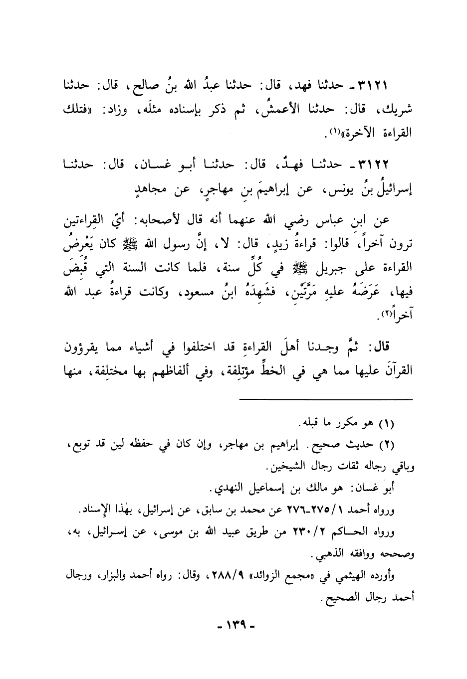 3122 - حَدَّثَنَا فَهْدٌ قَالَ: حَدَّثَنَا أَبُو غَسَّانَ قَالَ: حَدَّثَنَا إسْرَائِيلُ بْنُ يُونُسَ، عَنْ إبْرَاهِيمَ بْنِ مُهَاجِرٍ، عَنْ مُجَاهِدٍ، عَنِ ابْنِ عَبَّاسٍ رَضِيَ اللهُ عَنْهُمَا أَنَّهُ قَالَ لِأَصْحَابِهِ: " أَيَّ الْقِرَاءَتَيْنِ تَرَوْنَ آخِرًا؟ " قَالُوا: قِرَاءَةَ زَيْدٍ، قَالَ: " لَا، إنَّ رَسُولَ اللهِ صَلَّى اللَّهُ عَلَيْهِ وَسَلَّمَ كَانَ يَعْرِضُ الْقِرَاءَةَ عَلَى جِبْرِِيلَ صَلَّى اللَّهُ عَلَيْهِ وَسَلَّمَ فِي كُلِّ سَنَةٍ، فَلَمَّا كَانَتِ السَّنَةُ الَّتِي قُبِضَ فِيهَا عَرَضَهُ عَلَيْهِ مَرَّتَيْنِ، فَشَهِدَهُ ابْنُ مَسْعُودٍ، وَكَانَتْ قِرَاءَةُ عَبْدِ اللهِ آخِرًا ". قَالَ: ثُمَّ وَجَدْنَا أَهْلَ الْقِرَاءَةِ قَدِ اخْتَلَفُوا فِي أَشْيَاءَ مِمَّا يَقْرَءُونَ الْقُرْآنَ عَلَيْهَا مِمَّا هِيَ فِي الْخَطِّ مُؤْتَلِفَةٌ , وَفِي أَلْفَاظِهِمْ بِهَا مُخْتَلِفَةٌ، مِنْهَا -[140]- قَوْلُهُ عَزَّ وَجَلَّ: {إذَا ضَرَبْتُمْ فِي سَبِيلِ اللهِ فَتَبَيَّنُوا} [النساء: 94] . وَفِي قِرَاءَةِ غَيْرِهِ مِنْهُمْ: (فَتَثَبَّتُوا) ، وَمِنْهَا قَوْلَهُ عَزَّ وَجَلَّ: {يَا أَيُّهَا الَّذِينَ آمَنُوا إنْ جَاءَكُمْ فَاسِقٌ بِنَبَأٍ فَتَبَيَّنُوا} [الحجرات: 6] فِي قِرَاءَةِ بَعْضِهِمْ , وَفِي قِرَاءَةِ غَيْرِهِ: (فَتَثَبَّتُوا) . وَمِنْهَا قَوْلُهُ تَعَالَى: {وَالَّذِينَ آمَنُوا وَعَمِلُوا الصَّالِحَاتِ لِنُبَوِّئَنَّهُمْ مِنَ الْجَنَّةِ غُرَفًا} [العنكبوت: 58] فِي قِرَاءَةِ بَعْضِهِمْ، وَفِي قِرَاءَةِ غَيْرِهِ مِنْهُمْ: (لَنُثْوِيَنَّهُمْ مِنَ الْجَنَّةِ غُرَفًا) . وَمِنْهَا قَوْلُهُ تَعَالَى: (وَانْظُرْ إلَى الْعِظَامِ كَيْفَ نُنْشِرُهَا) فِي قِرَاءَةِ بَعْضِهِمْ، وَفِي قِرَاءَةِ غَيْرِهِ مِنْهُمْ: {نُنْشِزُهَا} [البقرة: 259] . -[141]- وَمِنْهَا أَمْثَالُ ذَلِكَ فِي الْقُرْآنِ كَمَا قَدْ قَرَأَهَا أَهْلُ الْقِرَاءَاتِ فَاخْتَلَفُوا فِيهَا , وَلَمْ يُعَنِّفْ بَعْضُهُمْ بَعْضًا فِي خِلَافِهِ إيَّاهُ فِي ذَلِكَ، وَكَانَ ذَلِكَ مِنْهُمْ بَعْدَ وُقُوفِهِمْ عَلَى مَا كُتِبَتْ عَلَيْهِ الْمَصَاحِفُ الَّتِي تَوَلَّى اكْتِتَابَهَا مَنْ قَدْ ذَكَرْنَا فِيمَا تَقَدَّمَ مِنَّا فِي كِتَابِنَا هَذَا بِأَمْرِ مَنْ كَانَ أَمَرَ بِذَلِكَ مِنَ الْخُلَفَاءِ الرَّاشِدِينَ الْمَهْدِيِّينَ، وَمِنْ حُضُورِ مَنْ سِوَاهُمْ مِنْ أَصْحَابِ رَسُولِ اللهِ صَلَّى اللَّهُ عَلَيْهِ وَسَلَّمَ الَّذِينَ نَقَلُوا إلَيْنَا عَنْهُ الْإِسْلَامَ وَشَرَائِعَهُ وَأَحْكَامَهُ الَّتِي قَدْ قَامَتِ الْحُجَّةُ عَلَيْنَا بِهَا , وَكَانَ مَنْ خَرَجَ عَنْ شَيْءٍ مِنْهَا إلَى خِلَافِهِ مَارِقًا , وَمَنْ جَحَدَ شَيْئًا مِنْهَا كَانَ بِهِ كَافِرًا، وَكَانَ عَلَيْنَا اسْتِتَابَتُهُ وَإِنْ رَجَعَ إلَى الْإِسْلَامِ , وَإِلَى الْإِقْرَارِ بِمَا كَانَ جَحَدَهُ , وَإِلَى لُزُومِ مَا قَدْ كَانَ عَلَيْهِ لُزُومُهُ قَبِلْنَا ذَلِكَ مِنْهُ , وَإِنْ تَمَادَى عَلَى مَا صَارَ إلَيْهِ وَلَمْ يَرْجِعْ إلَى مَا دَعَوْنَاهُ إلَيْهِ قَتَلْنَاهُ كَمَا نَقْتُلُ سَائِرَ الْمُرْتَدِّينَ. وَكَانَتِ الْحُرُوفُ الَّتِي ذَكَرْنَا اخْتِلَافَهُمْ فِي قِرَاءَتِهِمْ إيَّاهَا إنَّمَا تُوَصِّلُ إلَى حَقَائِقِهَا لَوْ كَانَتِ الْمَصَاحِفُ الْمُكْتَتَبُ ذَلِكَ فِيهَا قَدِ اسْتُعْمِلَ فِيهَا نَقْطُهَا أَوْ شَكْلُهَا حَتَّى يُبَيِّنَ كُلَّ حَرْفٍ مِنْهَا عَنْ غَيْرِهِ مِمَّا هُوَ مِثْلُهُ فِي الْخَطِّ وَخِلَافُهُ فِي اللَّفْظِ , وَلَكِنَّ الَّذِينَ كَتَبُوهَا رِضْوَانُ اللهِ عَلَيْهِمْ تَرَكُوا ذَلِكَ كَرَاهَةً مِنْهُمْ أَنْ يَخْلِطُوا بِكِتَابِ اللهِ عَزَّ وَجَلَّ غَيْرَهُ، حَتَّى كَرِهَ كَثِيرٌ مِنْهُمْ كِتَابَ فَوَاتِحِ السُّوَرِ، وَالتَّعْشِيرَ، وَالتَ