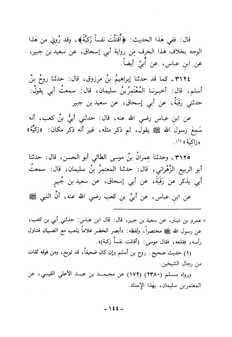 3125 - وَحَدَّثَنَا عِمْرَانُ بْنُ مُوسَى الطَّائِيُّ أَبُو الْحَسَنِ قَالَ: حَدَّثَنَا أَبُو الرَّبِيعِ الزَّهْرَانِيُّ قَالَ: حَدَّثَنَا الْمُعْتَمِرُ بْنُ سُلَيْمَانَ قَالَ: سَمِعْتُ أَبِي يَذْكُرُ عَنْ رَقَبَةَ، عَنْ أَبِي إِسْحَاقَ، عَنْ سَعِيدِ بْنِ جُبَيْرٍ، عَنِ ابْنِ عَبَّاسٍ، عَنْ أُبَيِّ بْنِ كَعْبٍ رَضِيَ اللهُ عَنْهُ أَنَّ النَّبِيَّ صَلَّى اللَّهُ عَلَيْهِ وَسَلَّمَ -[145]- قَالَ: " الْغُلَامُ الَّذِي قَتَلَهُ الْخَضِرُ طُبِعَ كَافِرًا، وَلَوْ أَدْرَكَ لَأَرْهَقَ أَبَوَاهُ طُغْيَانًا وَكُفْرًا ". قَالَ أَبُو جَعْفَرٍ: وَقَدِ اخْتُلِفَ عَلَى أَبِي إِسْحَاقَ فِي هَذَا الْحَدِيثِ فِي " زَكِيَّةٍ " وَفِي " زَاكِيَةٍ " عَلَى مَا ذَكَرْنَا عَنْهُ فِي كُلِّ وَاحِدَةٍ مِنْ هَاتَيْنِ الرِّوَايَتَيْنِ. وَقَدْ رُوِيَ هَذَا الْحَدِيثُ أَيْضًا عَنْ عَمْرِو بْنِ دِينَارٍ، عَنْ سَعِيدِ بْنِ جُبَيْرٍ، عَنِ ابْنِ عَبَّاسٍ، عَنْ أُبَيٍّ، عَنِ النَّبِيِّ صَلَّى اللَّهُ عَلَيْهِ وَسَلَّمَ بِ " زَاكِيَةً " لَا، بِ " زَكِيَّةً ".