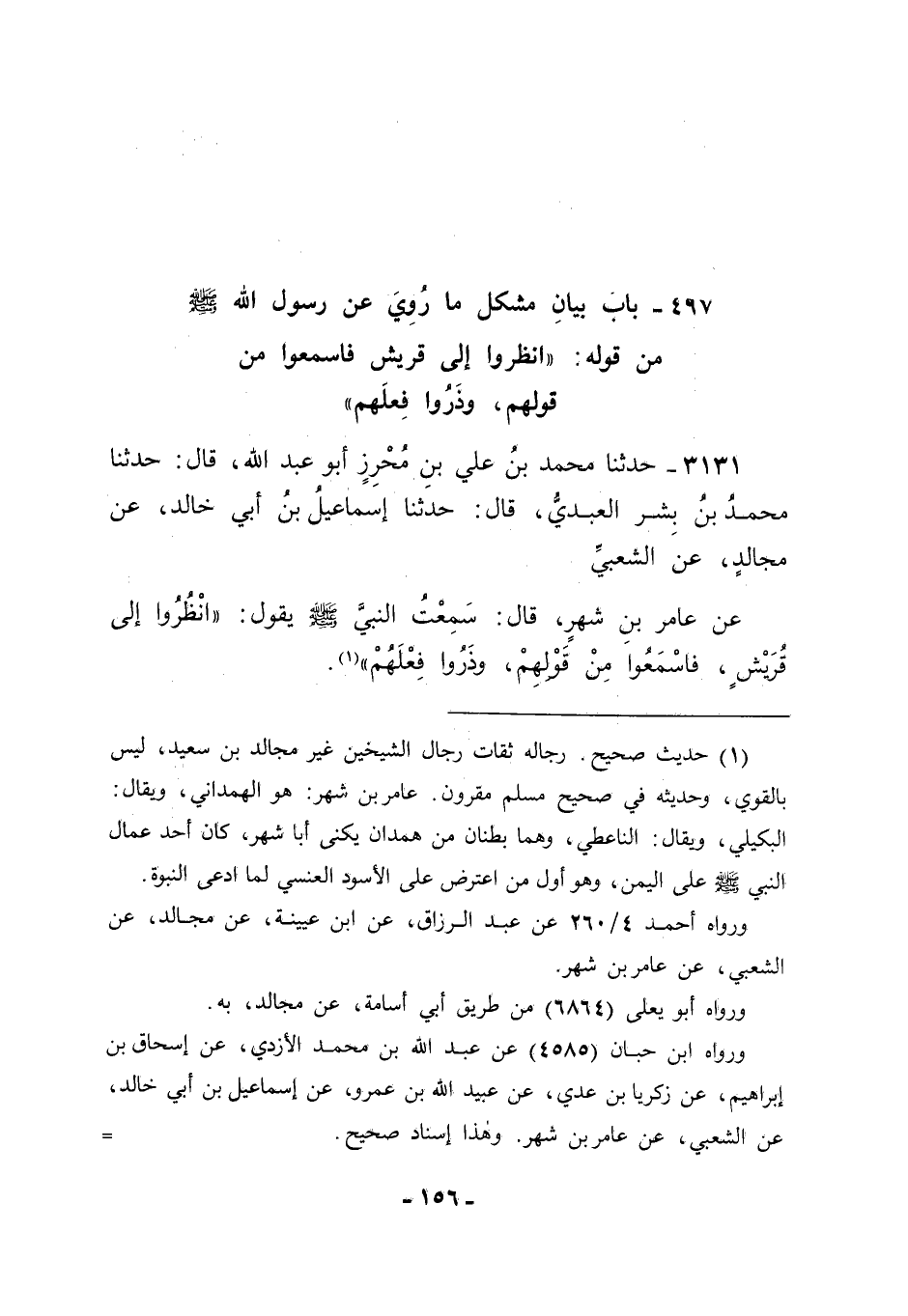 3131 - حَدَّثَنَا مُحَمَّدُ بْنُ عَلِيِّ بْنِ مُحْرِزٍ أَبُو عَبْدِ اللهِ قَالَ: حَدَّثَنَا مُحَمَّدُ بْنُ بِشْرٍ الْعَبْدِيُّ قَالَ: حَدَّثَنَا إسْمَاعِيلُ بْنُ أَبِي خَالِدٍ، عَنْ مُجَالِدٍ، عَنِ الشَّعْبِيِّ، عَنْ عَامِرِ بْنِ شَهْرٍ قَالَ: سَمِعْتُ النَّبِيَّ صَلَّى اللَّهُ عَلَيْهِ وَسَلَّمَ يَقُولُ: " انْظُرُوا إلَى قُرَيْشٍ فَاسْمَعُوا مِنْ قَوْلِهِمْ، وَذَرُوا فِعْلَهُمْ ". -[157]- قَالَ أَبُو جَعْفَرٍ: فَتَأَمَّلْنَا هَذَا الْحَدِيثَ فَكَانَ مَعْنَاهُ عِنْدَنَا، وَاللهُ أَعْلَمُ، أَنَّ الْمُرَادِينَ مِنْ قُرَيْشٍ الْمَأْمُورَ بِالِاسْتِمَاعِ مِنْ قَوْلِهِمْ هُمْ ذَوُو الْقَوْلِ الَّذِي يَجِبُ أَنْ يُسْتَمَعَ لَا مَنْ سِوَاهُمْ مِمَّنْ لَيْسَ مِنْ ذَوِي الْقَوْلِ الَّذِي يَجِبُ أَنْ يُسْتَمَعَ. وَكَذَلِكَ قَوْلُهُ: " وَذَرُوا فِعْلَهُمْ " هُوَ أَيْضًا عَلَى مَنْ كَانَ مِنْهُمْ مِنْ ذَوِي الْفِعْلِ الْمَذْمُومِ، لَا مَنْ سِوَاهُمْ مِنْ ذَوِي الْفِعْلِ الْمَحْمُودِ , وَاللهَ عَزَّ وَجَلَّ نَسْأَلُهُ التَّوْفِيقَ.