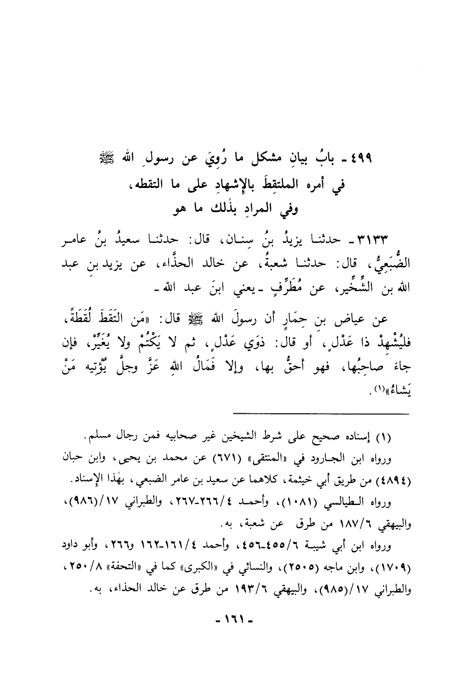 3133 - حَدَّثَنَا يَزِيدُ بْنُ سِنَانٍ قَالَ: حَدَّثَنَا سَعِيدُ بْنُ عَامِرٍ الضُّبَعِيُّ قَالَ: حَدَّثَنَا شُعْبَةُ، عَنْ خَالِدٍ الْحَذَّاءِ، عَنْ يَزِيدَ بْنِ عَبْدِ اللهِ بْنِ الشِّخِّيرِ، عَنْ مُطَرِّفٍ يَعْنِي ابْنَ عَبْدِ اللهِ، عَنْ عِيَاضِ بْنِ حِمَارٍ أَنَّ رَسُولَ اللهِ صَلَّى اللَّهُ عَلَيْهِ وَسَلَّمَ قَالَ: " مَنِ الْتَقَطَ لُقَطَةً فَلْيُشْهِدْ ذَا عَدْلٍ، أَوْ قَالَ: ذَوَيْ عَدْلٍ، ثُمَّ لَا يَكْتُمْ وَلَا يُغَيِّرْ، فَإِنْ جَاءَ صَاحِبُهَا فَهُوَ أَحَقُّ بِهَا , وَإِلَّا فَمَالُ اللهِ عَزَّ وَجَلَّ يُؤْتِيهِ مَنْ يَشَاءُ ". -[162]- قَالَ أَبُو جَعْفَرٍ: وَقَدْ رُوِيَ هَذَا الْحَدِيثُ مِنْ غَيْرِ هَذِهِ الْجِهَةِ عَلَى مَا ذَكَرْنَا , وَهُوَ عَلَى الشَّكِّ مِنْ بَعْضِ رُوَاتِهِ فِيمَا أُمِرَ بِهِ الْمُلْتَقِطُ فِيهِ مِنْ إشْهَادِ ذِي عَدْلٍ أَوْ ذَوَيْ عَدْلٍ، لَا عَلَى التَّخْيِيرِ مِنْ رَسُولِ اللهِ صَلَّى اللَّهُ عَلَيْهِ وَسَلَّمَ إيَّاهُ أَنْ يُشْهِدَ عَلَى ذَلِكَ أَيَّ ذَيْنِكَ الصِّنْفَيْنِ شَاءَ، وَهُوَ حَدِيثٌ يَدُورُ عَلَى خَالِدٍ الْحَذَّاءِ، وَقَدِ اخْتَلَفَ رُوَاتُهُ لَهُ عَنْهُ فِيهِ، فَرَوَاهُ شُعْبَةُ عَنْهُ عَلَى مَا ذَكَرْنَا، وَرَوَاهُ حَمَّادُ بْنُ سَلَمَةَ عَلَيْهِ بِخِلَافِ ذَلِكَ