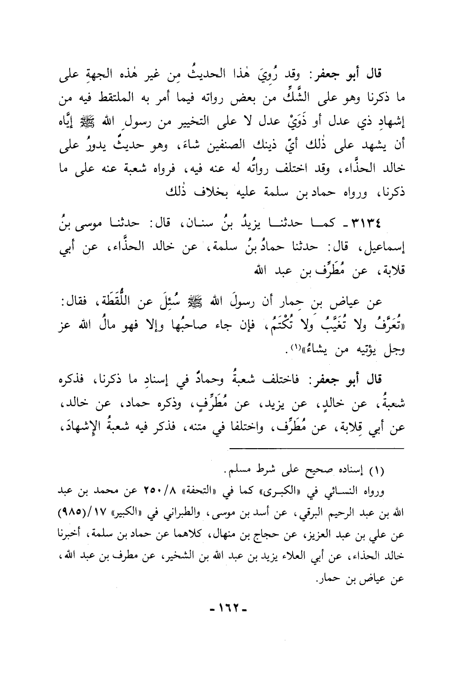 3134 - كَمَا حَدَّثَنَا يَزِيدُ بْنُ سِنَانٍ قَالَ: حَدَّثَنَا مُوسَى بْنُ إسْمَاعِيلَ، قَالَ: حَدَّثَنَا حَمَّادُ بْنُ سَلَمَةَ، عَنْ خَالِدٍ الْحَذَّاءِ، عَنْ أَبِي قِلَابَةَ، عَنْ مُطَرِّفِ بْنِ عَبْدِ اللهِ، عَنْ عِيَاضِ بْنِ حِمَارٍ أَنَّ رَسُولَ اللهِ صَلَّى اللَّهُ عَلَيْهِ وَسَلَّمَ سُئِلَ عَنِ اللُّقَطَةِ فَقَالَ: " تُعَرَّفُ وَلَا تُغَيَّبُ وَلَا تُكْتَمُ، فَإِنْ جَاءَ صَاحِبُهَا , وَإِلَّا فَهُوَ مَالُ اللهِ عَزَّ وَجَلَّ يُؤْتِيهِ مَنْ يَشَاءُ ". قَالَ أَبُو جَعْفَرٍ: فَاخْتَلَفَ شُعْبَةُ وَحَمَّادٌ فِي إسْنَادِ مَا ذَكَرْنَا، فَذَكَرَهُ شُعْبَةُ عَنْ خَالِدٍ عَنْ يَزِيدَ بْنِ مُطَرِّفٍ، وَذَكَرَهُ حَمَّادٌ، عَنْ خَالِدٍ، عَنْ أَبِي قِلَابَةَ، عَنْ مُطَرِّفٍ، وَاخْتَلَفَا فِي مَتْنِهِ، فَذَكَرَ فِيهِ شُعْبَةُ الْإِشْهَادَ، -[163]- وَلَمْ يَذْكُرْهُ حَمَّادٌ. وَقَدْ رَوَاهُ حَمَّادٌ أَيْضًا مِنْ طَرِيقٍ غَيْرِ هَذَا الطَّرِيقِ يَرْجِعُ إلَى مُطَرِّفٍ عَنْ أَبِي هُرَيْرَةَ عَنِ النَّبِيِّ صَلَّى اللَّهُ عَلَيْهِ وَسَلَّمَ.