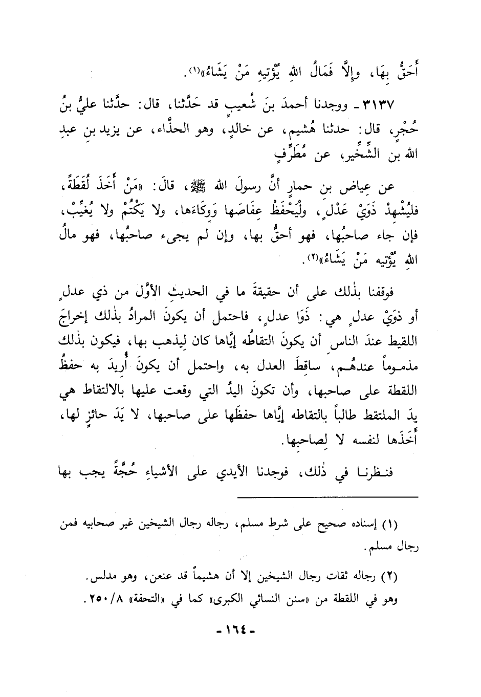 3137 - وَوَجَدْنَا أَحْمَدَ بْنَ شُعَيْبٍ قَدْ: حَدَّثَنَا قَالَ: حَدَّثَنَا عَلِيُّ بْنُ حُجْرٍ قَالَ: حَدَّثَنَا هُشَيْمٌ، عَنْ خَالِدٍ، وَهُوَ الْحَذَّاءُ عَنْ يَزِيدَ بْنِ عَبْدِ اللهِ بْنِ الشِّخِّيرِ، عَنْ مُطَرِّفٍ، عَنْ عِيَاضِ بْنِ حِمَارٍ أَنَّ رَسُولَ اللهِ صَلَّى اللَّهُ عَلَيْهِ وَسَلَّمَ قَالَ: " مَنْ أَخَذَ لُقَطَةً فَلْيُشْهِدْ ذَوَيْ عَدْلٍ، وَلْيَحْفَظْ عِفَاصَهَا وَوِكَاءَهَا، وَلَا يَكْتُمْ وَلَا يُغَيِّبْ، فَإِنْ جَاءَ صَاحِبُهَا فَهُوَ أَحَقُّ بِهَا , وَإِنْ لَمْ يَجِئْ صَاحِبُهَا فَهُوَ مَالُ اللهِ يُؤْتِيهِ مَنْ يَشَاءُ ". فَوَقَفْنَا بِذَلِكَ عَلَى أَنَّ حَقِيقَةَ مَا فِي الْحَدِيثِ الْأَوَّلِ مِنْ ذِي عَدْلٍ أَوْ ذَوَيْ عَدْلٍ هِيَ: ذَوَا عَدْلٍ، فَاحْتَمَلَ أَنْ يَكُونَ الْمُرَادُ بِذَلِكَ إخْرَاجَ اللَّقِيطِ عِنْدَ النَّاسِ أَنْ يَكُونَ الْتِقَاطُهُ إيَّاهَا كَانَ لِيَذْهَبَ بِهَا فَيَكُونَ بِذَلِكَ مَذْمُومًا عِنْدَهُمْ سَاقِطَ الْعَدْلِ بِهِ. وَاحْتَمَلَ أَنْ يَكُونَ أُرِيدَ بِهِ حِفْظُ اللُّقَطَةِ عَلَى صَاحِبِهَا، وَأَنْ تَكُونَ الْيَدُ الَّتِي وَقَعَتْ عَلَيْهَا بِالِالْتِقَاطِ هِيَ يَدُ الْمُلْتَقِطِ طَالِبًا بِالْتِقَاطِهِ إيَّاهَا حِفْظَهَا عَلَى صَاحِبِهَا، لَا يَدَ حَائِزٍ لَهَا، أَخَذَهَا لِنَفْسِهِ لَا لِصَاحِبِهَا. فَنَظَرْنَا فِي ذَلِكَ فَوَجَدْنَا الْأَيْدِيَ عَلَى الْأَشْيَاءِ حُجَّةً يَجِبُ بِهَا -[165]- صَرْفُ الْأَشْيَاءِ إلَى مَا تُصْرَفُ إلَيْهِ مَا تَمْلِكُهُ دُونَ مُلْكِ الْأَيْدِي مِنْ قَبُولِ أَقْوَالِهِمْ فِيهَا , وَمِنْ صَرْفِهَا بَعْدَ وَفَاتِهِمْ فِي قَضَاءِ دُيُونِهِمْ، وَفِي مَوَارِيثِهِمْ، وَفِي وَصَايَاهُمْ، فَكَانَ حَقًّا عَلَى ذَوِي الْأَيْدِي فِيمَا وَقَعَ فِي أَيْدِيهِمْ عَلَى السَّبِيلِ الَّتِي ذَكَرْنَا أَنْ يُقِيمُوا الْحُجَّةَ عَلَى أَنْفُسِهِمْ لِمَالِكِي مَا صَارَ فِي أَيْدِيهِمْ مِنْ ذَلِكَ بِالْإِقْرَارِ بِهِ وَالْإِشْهَادِ عَلَيْهِ ; لِتَقُومَ الْحُجَّةُ أَنَّهُ فِي أَيْدِيهِمْ عَلَى سَبِيلِ مَا يَكُونُ اللَّقْطُ عَلَيْهِ مِنَ امْتِثَالِ الْوَاجِبِ فِيهَا، وَمِنْ مَنْعِ الْمَوَارِيثِ مِنْهَا، وَصَرْفِهَا فِيمَا يُصْرَفُ فِيهِ مَا سِوَاهَا , وَحَتَّى تَكُونَ مَحْفُوظَةً كَذَلِكَ , وَحَتَّى يَكُونَ كُلُّ مَنْ وَقَعَتْ يَدُهُ عَلَيْهَا سِوَى مُلْتَقِطِهَا يَتَمَثَّلُ فِيهَا الْوَاجِبَ حَتَّى تَصِيرَ إلَى يَدِ رَبِّهَا، أَوْ إلَى مَا سِوَاهَا مِمَّا يَجِبُ أَنْ تَصِيرَ إلَيْهِ مِنَ الْأَحْكَامِ الَّتِي أَمَرَ اللهُ تَعَالَى بِهَا فِيهَا عَلَى لِسَانِ نَبِيِّهِ صَلَّى اللَّهُ عَلَيْهِ وَسَلَّمَ، وَاللهَ عَزَّ وَجَلَّ نَسْأَلُهُ التَّوْفِيقَ.