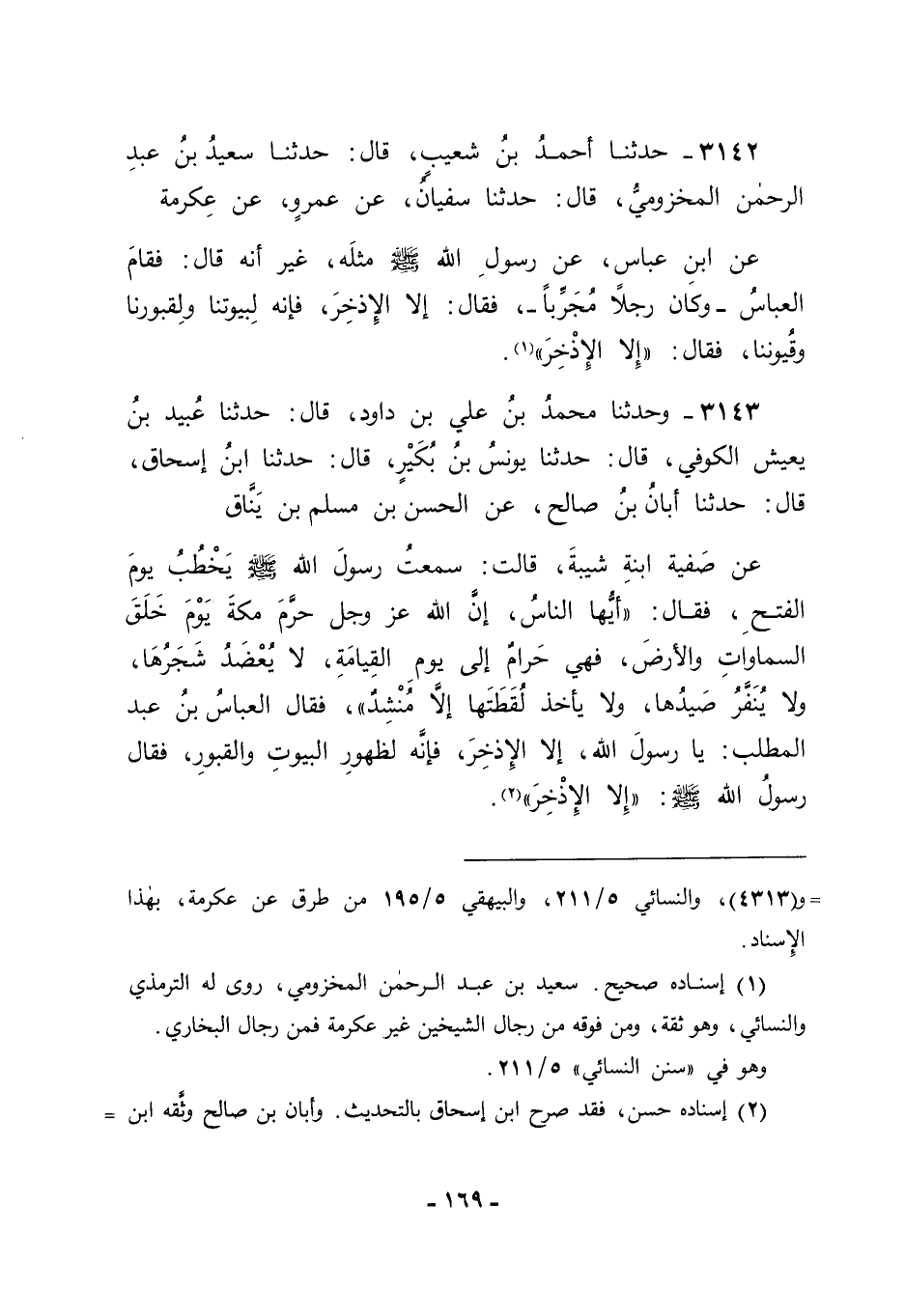 3143 - وَحَدَّثَنَا مُحَمَّدُ بْنُ عَلِيِّ بْنِ دَاوُدَ قَالَ: حَدَّثَنَا عُبَيْدُ بْنُ يَعِيشَ الْكُوفِيُّ قَالَ: حَدَّثَنَا يُونُسُ بْنُ بُكَيْرٍ قَالَ: حَدَّثَنَا ابْنُ إِسْحَاقَ قَالَ: حَدَّثَنَا أَبَانُ بْنُ صَالِحٍ، عَنِ الْحَسَنِ بْنِ مُسْلِمِ بْنِ يَنَّاقَ، عَنْ صَفِيَّةَ ابْنَةِ شَيْبَةَ قَالَتْ: سَمِعْتُ رَسُولَ اللهِ صَلَّى اللَّهُ عَلَيْهِ وَسَلَّمَ يَخْطُبُ يَوْمَ الْفَتْحِ فَقَالَ: " أَيُّهَا النَّاسُ، إنَّ اللهَ عَزَّ وَجَلَّ حَرَّمَ مَكَّةَ يَوْمَ خَلَقَ السَّمَوَاتِ وَالْأَرْضَ، فَهِيَ حَرَامٌ إلَى يَوْمِ الْقِيَامَةِ، لَا يُعْضَدُ شَجَرُهَا، وَلَا يُنَفَّرُ صَيْدُهَا، وَلَا يَأْخُذُ لُقَطَتَهَا إِلَّا مُنْشِدٌ "، فَقَالَ الْعَبَّاسُ بْنُ عَبْدِ الْمُطَّلِبِ: يَا رَسُولَ اللهِ، إِلَّا الْإِذْخِرَ؛ فَإِنَّهُ لِظُهُورِ الْبُيُوتِ وَالْقُبُورِ، فَقَالَ رَسُولُ اللهِ صَلَّى اللَّهُ عَلَيْهِ وَسَلَّمَ: " إِلَّا الْإِذْخِرَ "