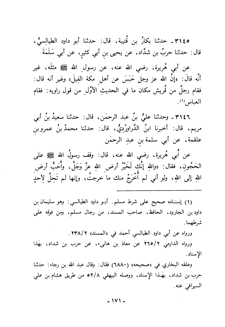 3146 - وَحَدَّثَنَا عَلِيُّ بْنُ عَبْدِ الرَّحْمَنِ قَالَ: حَدَّثَنَا سَعِيدُ بْنُ أَبِي مَرْيَمَ قَالَ: حَدَّثَنَا ابْنُ الدَّرَاوَرْدِيِّ قَالَ: حَدَّثَنَا مُحَمَّدُ بْنُ عَمْرِو بْنِ عَلْقَمَةَ، عَنْ أَبِي سَلَمَةَ بْنِ عَبْدِ الرَّحْمَنِ، عَنْ أَبِي هُرَيْرَةَ رَضِيَ اللهُ عَنْهُ قَالَ: وَقَفَ رَسُولُ اللهِ صَلَّى اللَّهُ عَلَيْهِ وَسَلَّمَ عَلَى الْحَجُونِ فَقَالَ: " وَاللهِ، إِنَّكِ لَخَيْرُ أَرْضِ اللهِ عَزَّ وَجَلَّ، وَأَحَبُّ أَرْضِ اللهِ إلَى اللهِ، وَلَوْ أَنِّي لَمْ أُخْرَجْ مِنْكِ مَا خَرَجْتُ، وَإِنَّهَا لَمْ تَحِلَّ لِأَحَدٍ -[172]- كَانَ قَبْلِي "، ثُمَّ ذَكَرَ مِثْلَهُ غَيْرَ أَنَّهُ قَالَ فِيهِ: " وَلَا تُلْتَقَطُ ضَالَّتُهَا إِلَّا لِمُنْشِدٍ "، فَقَالَ رَجُلٌ يُقَالَ لَهُ شَاهٍ: يَا رَسُولَ اللهِ، إِلَّا الْإِذْخِرَ، ثُمَّ ذَكَرَ بَقِيَّةَ الْحَدِيثِ. فَسَأَلَ سَائِلٌ عَمَّا أُضِيفَ فِي هَذِهِ الْأَحَادِيثِ إلَى الْعَبَّاسِ أَوْ إلَى مَنْ ذُكِرَ سِوَاهُ، مِنْ قَوْلِهِ لِرَسُولِ اللهِ صَلَّى اللَّهُ عَلَيْهِ وَسَلَّمَ لَمَّا ذَكَرَ حُرْمَةَ شَجَرِ مَكَّةَ وَحُرْمَةَ خَلَاهَا: إِلَّا الْإِذْخِرَ، اسْتِثْنَاءً مِنْ ذَلِكَ، وَأَنْكَرَ أَنْ يَكُونَ ذَلِكَ كَانَ مِنَ الْعَبَّاسِ وَأَنْ يَكُونَ رَسُولُ اللهِ صَلَّى اللَّهُ عَلَيْهِ وَسَلَّمَ يُقَارُّ أَحَدًا عَلَى ذَلِكَ. فَكَانَ جَوَابُنَا لَهُ فِي ذَلِكَ بِتَوْفِيقِ اللهِ عَزَّ وَجَلَّ وَعَوْنِهِ: أَنَّ هَذِهِ الْآثَارَ ثَابِتَةٌ صَحِيحَةُ الْمَجِيءِ مَقْبُولَةٌ كُلُّهَا , وَأَنَّ الَّذِي كَانَ مِنَ الْعَبَّاسِ أَوْ مِمَّنْ سِوَاهُ فِيهَا غَيْرُ مُنْكَرٍ مِنْ مِثْلِهِ , وَأَنَّ تَرْكَ رَسُولِ اللهِ صَلَّى اللَّهُ عَلَيْهِ وَسَلَّمَ إنْكَارَ ذَلِكَ -[173]- عَلَيْهِ غَيْرُ مُنْكَرٍ أَيْضًا، وَكَيْفَ يُنْكِرُ عَلَيْهِ مَا هُوَ مَحْمُودٌ فِيهِ، إذْ قَدْ عَلِمَ مِنْ حَاجَةِ أَهْلِ مَكَّةَ إلَى الْإِذْخِرِ مَا هُمْ عَلَيْهِ مِنْهَا، فَقَالَ لِرَسُولِ اللهِ صَلَّى اللَّهُ عَلَيْهِ وَسَلَّمَ مَا قَالَ، طَلَبَ مِنْهُ مُرَاجَعَةَ رَبِّهِ فِي ذَلِكَ، كَمَا سَأَلَ رَسُولُ اللهِ صَلَّى اللَّهُ عَلَيْهِ وَسَلَّمَ فِي حَدِيثِ الْمِعْرَاجِ رَبَّهُ عَزَّ وَجَلَّ لَمَّا افْتَرَضَ عَلَى أُمَّتِهِ خَمْسِينَ صَلَاةً فِي الْيَوْمِ وَاللَّيْلَةِ التَّخْفِيفَ مَرَّةً بَعْدَ مَرَّةٍ، حَتَّى رَدَّهَا إلَى خَمْسِ صَلَوَاتٍ، وَكَمَا أُمِرَ رَسُولُ اللهِ صَلَّى اللَّهُ عَلَيْهِ وَسَلَّمَ أَنْ يَقْرَأَ الْقُرْآنَ عَلَى حَرْفٍ فَرَاجَعَ فِي ذَلِكَ مَرَّةً بَعْدَ مَرَّةٍ، حَتَّى رُدَّ إلَى سَبْعَةِ أَحْرُفٍ، فَكَانَ مِثْلُ ذَلِكَ مَا كَانَ مِنَ الْعَبَّاسِ أَوْ مِنْ غَيْرِهِ مِمَّا ذَكَرْنَا، وَكَانَ قَوْلُهُ: إِلَّا الْإِذْخِرَ، وَقَطْعُهُ الْكَلَامَ عِنْدَ ذَلِكَ لِعِلْمِهِ بِفَهْمِ النَّبِيِّ صَلَّى اللَّهُ عَلَيْهِ وَسَلَّمَ مَا أَرَادَهُ مِنْهُ، مِنْ سُؤَالِهِ رَبَّهُ عَزَّ وَجَلَّ عَنْ ذَلِكَ، فَغَنِيَ عَنِ الْكَلَامِ بِهِ، كَمَا تَسْتَعْمِلُ الْعَرَبُ فِي كَلَامِهَا لِلِاخْتِصَارِ السُّكُوتَ عَنِ الْكَلَامِ بِهِ، لِعِلْمِهَا بِفَهْمِ مَنْ تُخَاطِبُهُ بِذَلِكَ مَا خَاطَبَتْهُ بِهِ مِنْ أَجْلِهِ حَتَّى يَأْتُوا بِبَعْضِ الْكَلِمَةِ، وَيَتْرُكُوا بَقِيَّتَهَا. وَمِنْ ذَلِكَ قَوْلُهُمْ: كَفَى بِالسَّيْفِ شَا، يُرِيدُونَ شَاهِدًا، حَتَّى تَعَالَى ذَلِكَ أَنْ جَاءَ الْقُرْآنُ بِهِ، فَمِنْ ذَلِكَ قَوْلُهُ عَزَّ وَجَلَّ: {وَلَوْ أَنَّ قُرْآنًا سُيِّرَتْ بِهِ الْجِبَالُ أَوْ قُطِّعَتْ بِهِ الْأَرْضُ أَوْ كُلِّمَ بِهِ الْمَوْتَى} [الرعد: 31] ، ثُمَّ قَطَعَ بَقِيَّةَ الْكَلَامِ، وَهُوَ مِمَّا قَدِ اخْتَلَفَ أَهْلُ الْعِلْمِ فِيهِ مَا هُوَ، ف