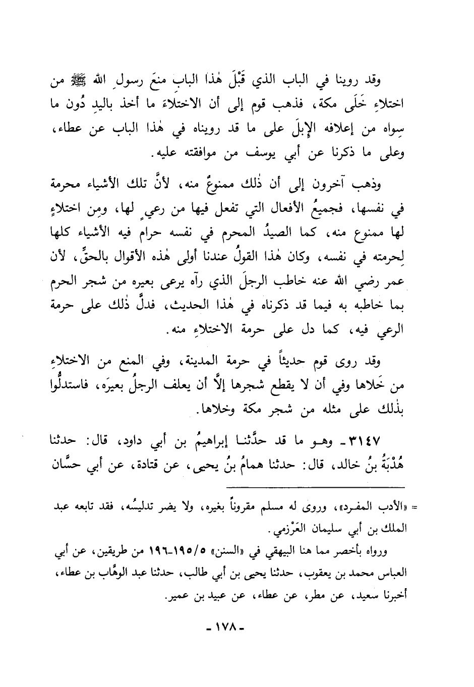 3147 - وَهُوَ مَا قَدْ حَدَّثَنَا إبْرَاهِيمُ بْنُ أَبِي دَاوُدَ قَالَ: حَدَّثَنَا هُدْبَةُ بْنُ خَالِدٍ قَالَ: حَدَّثَنَا هَمَّامُ بْنُ يَحْيَى، عَنْ قَتَادَةَ: عَنْ أَبِي حَسَّانَ، -[179]- أَنَّ عَلِيًّا عَلَيْهِ السَّلَامُ أَخْرَجَ الصَّحِيفَةَ الَّتِي سَمِعَهَا مِنَ رَسُولِ اللهِ صَلَّى اللَّهُ عَلَيْهِ وَسَلَّمَ، الَّتِي كَانَتْ فِي قِرَابِ سَيْفِهِ، فَإِذَا فِيهَا: " إِنَّ إبْرَاهِيمَ صَلَّى اللَّهُ عَلَيْهِ وَسَلَّمَ حَرَّمَ مَكَّةَ، وَإِنِّي حَرَّمْتُ الْمَدِينَةَ، لَا يُخْتَلَى خَلَاهَا، وَلَا يُنَفَّرُ صَيْدُهَا، وَلَا يُقْطَعُ شَجَرُهَا، إِلَّا أَنْ يَعْلِفَ رَجُلٌ بَعِيرَهُ ". فَاعْتَبَرْنَاهُ فَوَجَدْنَاهُ مُنْقَطِعَ الْإِسْنَادِ، وَذَلِكَ أَنَّ أَبَا حَسَّانَ لَمْ يَلْقَ عَلِيًّا رَضِيَ اللهُ عَنْهُ , وَإِنَّمَا الَّذِي يُحَدِّثُهُ مِنْ حَدِيثِ عَلِيٍّ هُوَ مِمَّا أَخَذَهُ عَنْ عَبِيدَةَ السَّلْمَانِيِّ وَمِنْ مِثْلِهِ مِنْ أَصْحَابِهِ عَنْهُ، وَلَمَّا كَانَ ذَلِكَ كَذَلِكَ كَانَ مَا رُوِّينَاهُ فِي هَذَا الْبَابِ مِمَّا يُخَالِفُهُ -[180]- عَنْ عُمَرَ رَضِيَ اللهُ عَنْهُ أَوْلَى مِنْهُ، لَا سِيَّمَا وَقَدْ كَانَ ذَلِكَ مِنْ عُمَرَ رَضِيَ اللهُ عَنْهُ بِحَضْرَةِ مَنْ سِوَاهُ مِنْ أَصْحَابِ رَسُولِ اللهِ صَلَّى اللَّهُ عَلَيْهِ وَسَلَّمَ فَلَمْ يُنْكِرُوا ذَلِكَ عَلَيْهِ، وَلَمْ يُخَالِفُوهُ فِيهِ. فَدَلَّ ذَلِكَ عَلَى مُتَابَعَتِهِمْ إيَّاهُ عَلَيْهِ، وَاللهَ نَسْأَلُهُ التَّوْفِيقَ، ثُمَّ وَجَدْنَا هَذَا الْحَدِيثَ مُتَّصِلَ الْإِسْنَادِ.