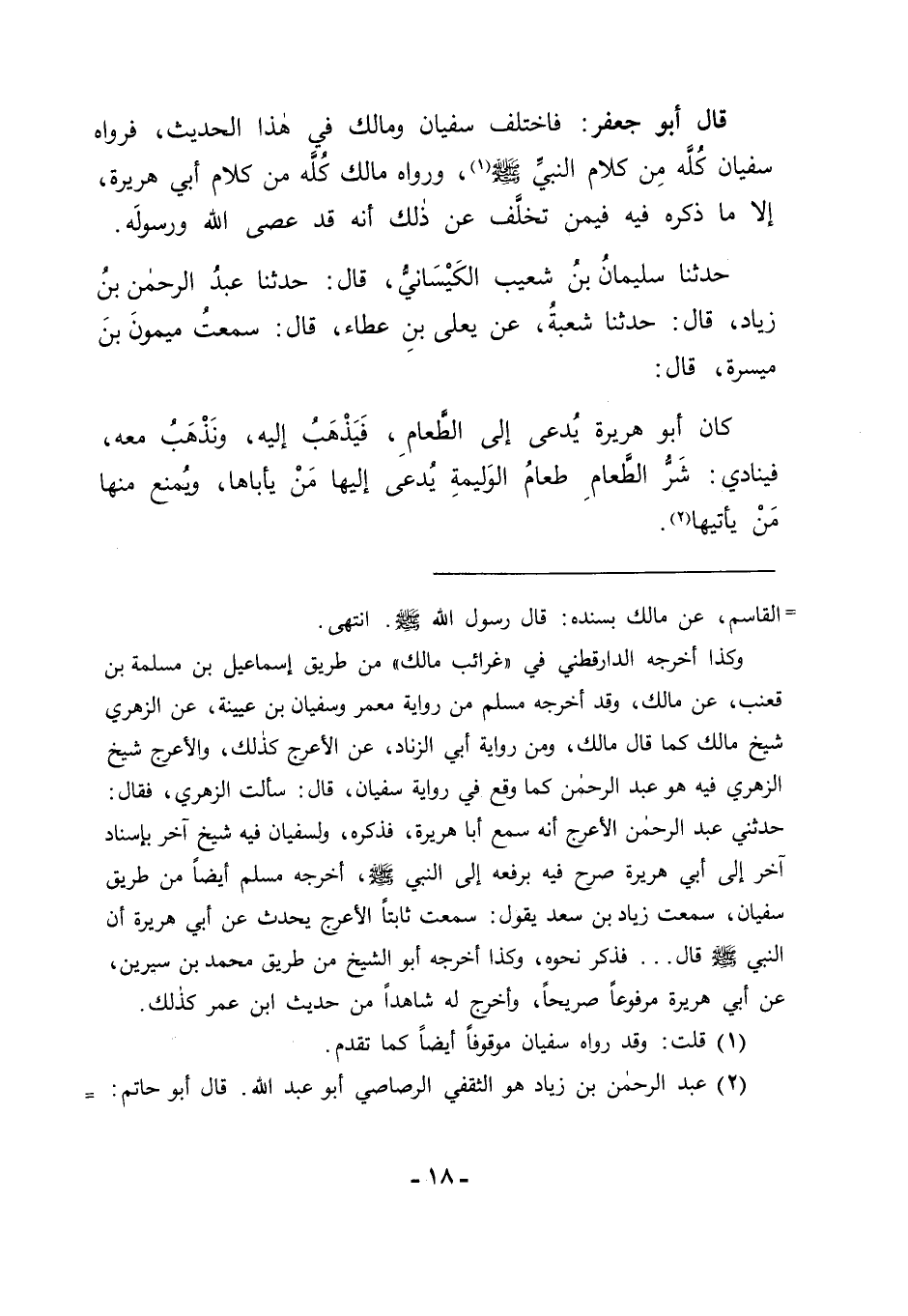 حَدَّثَنَا سُلَيْمَانُ بْنُ شُعَيْبٍ الْكَيْسَانِيُّ قَالَ: حَدَّثَنَا عَبْدُ الرَّحْمَنِ بْنُ زِيَادٍ قَالَ: حَدَّثَنَا شُعْبَةُ، عَنْ يَعْلَى بْنِ عَطَاءٍ قَالَ: سَمِعْتُ مَيْمُونَ بْنَ مَيْسَرَةَ قَالَ: كَانَ أَبُو هُرَيْرَةَ يُدْعَى إلَى الطَّعَامِ فَيَذْهَبُ إلَيْهِ وَنَذْهَبُ مَعَهُ، فَيُنَادِي: " شَرُّ الطَّعَامِ طَعَامُ الْوَلِيمَةِ، يُدْعَى إلَيْهَا مَنْ يَأْبَاهَا وَيُمْنَعُ مِنْهَا مَنْ يَأْتِيهَا ". -[19]- فَوَافَقَ مَيْمُونُ بْنُ مَيْسَرَةَ فِيمَا رُوِيَ مِنْ هَذَا الْحَدِيثِ عَنْ أَبِي هُرَيْرَةَ رَضِيَ اللهُ عَنْهُ مَالِكًا فِيمَا رَوَاهُ عَلَيْهِ عَنِ الزُّهْرِيِّ، عَنِ الْأَعْرَجِ، عَنْ أَبِي هُرَيْرَةَ، وَخَالَفَ ابْنُ عُيَيْنَةَ فِيمَا رَوَاهُ عَلَيْهِ عَنِ الزُّهْرِيِّ، عَنِ الْأَعْرَجِ، عَنْ أَبِي هُرَيْرَةَ. قَالَ أَبُو جَعْفَرٍ: فَتَأَمَّلْنَا هَذَا الْحَدِيثَ لِنَقِفَ عَلَى مَعْنَاهُ الَّذِي أُرِيدَ بِهِ إنْ شَاءَ اللهُ فَوَجَدْنَا الطَّعَامَ الْمَقْصُودَ بِمَا ذُكِرَ إلَيْهِ فِيهِ هُوَ الْوَلِيمَةُ، وَكَانَتِ الْوَلِيمَةُ صِنْفًا مِنَ الْأَطْعِمَةِ ; لِأَنَّ فِي الْأَطْعِمَةِ أَصْنَافًا سِوَاهَا نَحْنُ ذَاكِرُوهَا فِي هَذَا الْبَابِ إنْ شَاءَ اللهُ. وَهُوَ مَا سَمِعْتُ أَحْمَدَ بْنَ أَبِي عِمْرَانَ يَقُولُ: كَانَتْ الْعَرَبُ تُسَمِّي الطَّعَامَ الَّذِي يُطْعِمُهُ الرَّجُلُ إذَا وُلِدَ لَهُ مَوْلُودٌ طَعَامَ الْخُرْسِ، وَتُسَمِّي طَعَامَ الْخِتَانِ طَعَامَ الْإِعْذَارِ، يَقُولُونَ: قَدْ أَعْذَرَ عَلَى وَلَدِهِ، وَإِذَا بَنَى الرَّجُلُ دَارًا أَوِ اشْتَرَاهَا فَأَطْعَمَ قِيلَ: طَعَامُ الْوَكِيرَةِ، أَيْ مِنَ الْوَكْرِ، وَإِذَا قَدِمَ مِنْ سَفَرٍ فَأَطْعَمَ قِيلَ: طَعَامُ النَّقِيعَةِ. قَالَ: وَأَنْشَدَ أَبُو نَصْرٍ أَحْمَدُ بْنُ حَاتِمٍ صَاحِبُ الْأَصْمَعِيِّ: