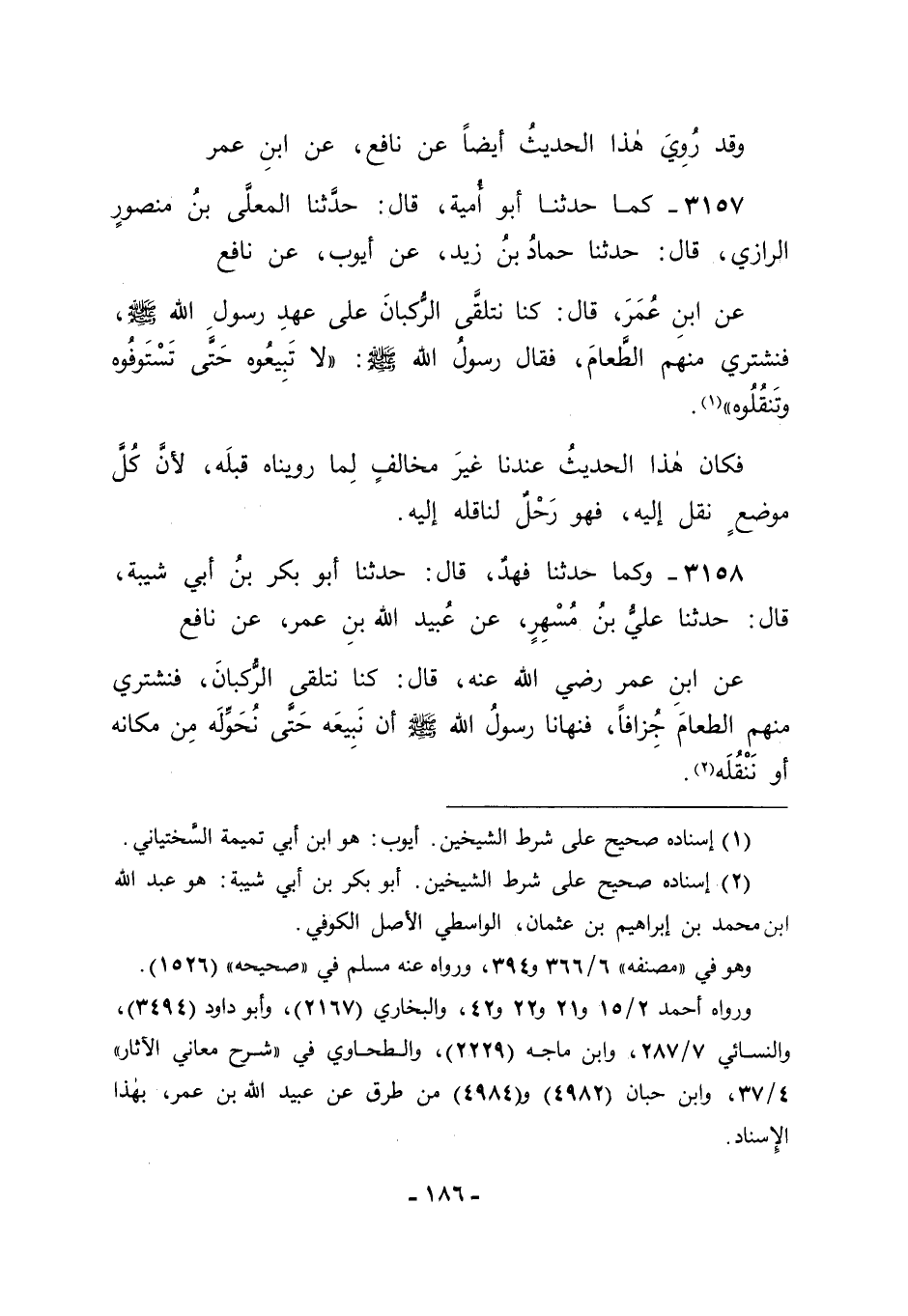 3157 - كَمَا حَدَّثَنَا أَبُو أُمَيَّةَ قَالَ: حَدَّثَنَا الْمُعَلَّى بْنُ مَنْصُورٍ الرَّازِيُّ قَالَ: حَدَّثَنَا حَمَّادُ بْنُ زَيْدٍ، عَنْ أَيُّوبَ، عَنْ نَافِعٍ، عَنِ ابْنِ عُمَرَ قَالَ: " كُنَّا نَتَلَقَّى الرُّكْبَانَ عَلَى عَهْدِ رَسُولِ اللهِ صَلَّى اللَّهُ عَلَيْهِ وَسَلَّمَ فَنَشْتَرِي مِنْهُمُ الطَّعَامَ، فَقَالَ رَسُولُ اللهِ صَلَّى اللَّهُ عَلَيْهِ وَسَلَّمَ: " لَا تَبِيعُوهُ حَتَّى تَسْتَوْفُوهُ وَتَنْقُلُوهُ ". فَكَانَ هَذَا الْحَدِيثُ عِنْدَنَا غَيْرَ مُخَالِفٍ لِمَا رُوِّينَاهُ قَبْلَهُ ; لِأَنَّ كُلَّ مَوْضِعٍ نُقِلَ إلَيْهِ فَهُوَ رَحْلٌ لِنَاقِلِهِ إلَيْهِ.