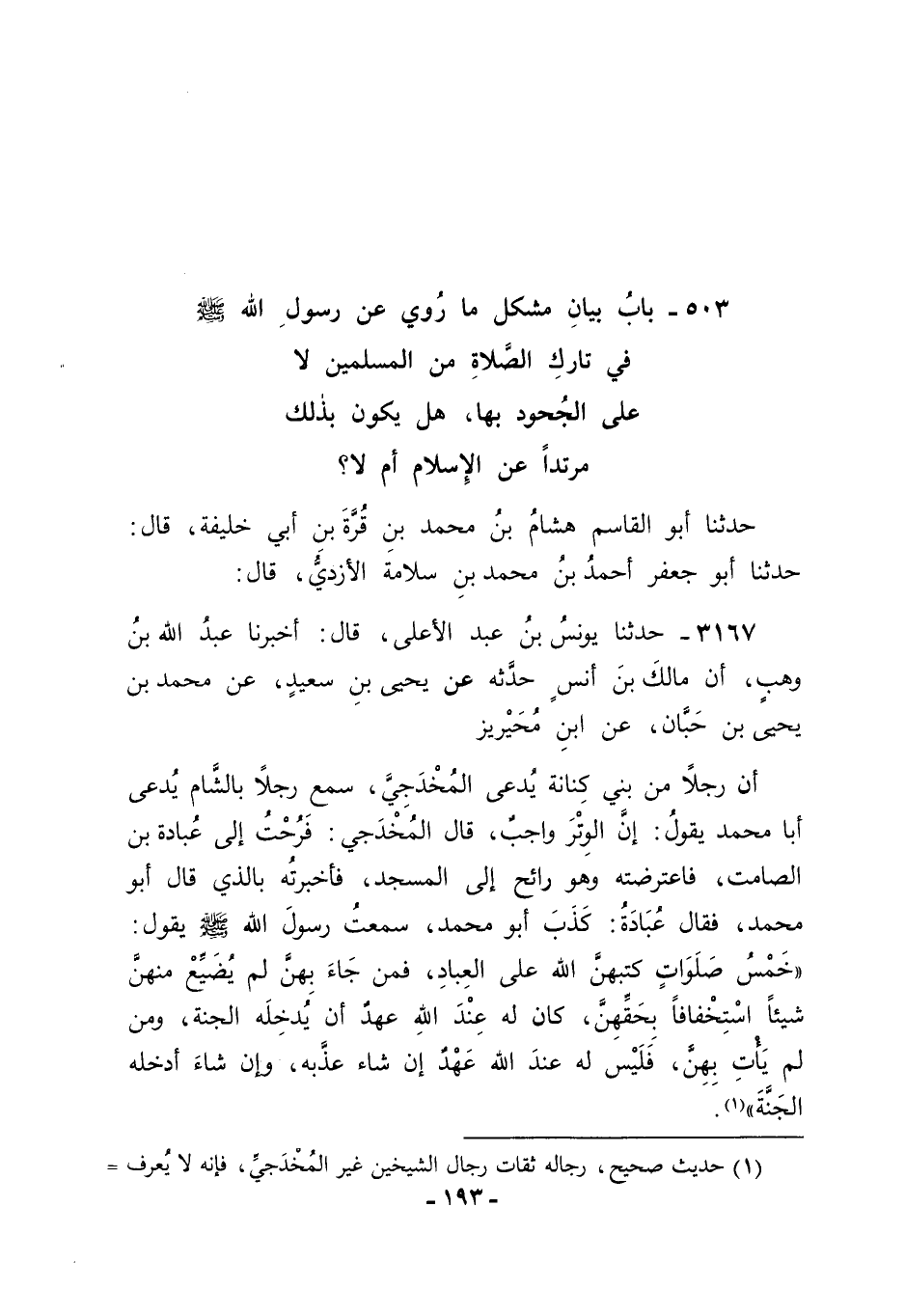 حَدَّثَنَا أَبُو الْقَاسِمِ هِشَامُ بْنُ مُحَمَّدِ بْنِ قُرَّةَ بْنِ أَبِي خَلِيفَةَ قَالَ: حَدَّثَنَا أَبُو جَعْفَرٍ أَحْمَدُ بْنُ مُحَمَّدِ بْنِ سَلَامَةَ الْأَزْدِيُّ قَالَ: 3167 - حَدَّثَنَا يُونُسُ بْنُ عَبْدِ الْأَعْلَى قَالَ: أَخْبَرَنَا عَبْدُ اللهِ بْنُ وَهْبٍ، أَنَّ مَالِكَ بْنَ أَنَسٍ، حَدَّثَهُ عَنْ يَحْيَى بْنِ سَعِيدٍ، عَنْ مُحَمَّدِ بْنِ يَحْيَى بْنِ حِبَّانَ، عَنِ ابْنِ مُحَيْرِيزٍ، أَنَّ رَجُلًا مِنْ بَنِي كِنَانَةَ يُدْعَى الْمُخْدَجِيَّ، سَمِعَ رَجُلًا بِالشَّامِ يُدْعَى أَبَا مُحَمَّدٍ يَقُولُ: إنَّ الْوِتْرَ وَاجِبٌ. قَالَ الْمُخْدَجِيُّ: فَرُحْتُ إلَى عُبَادَةَ بْنِ الصَّامِتِ فَاعْتَرَضْتُهُ وَهُوَ رَائِحٌ إلَى الْمَسْجِدِ، فَأَخْبَرْتُهُ بِالَّذِي قَالَ أَبُو مُحَمَّدٍ، فَقَالَ عُبَادَةُ: " كَذَبَ أَبُو مُحَمَّدٍ، سَمِعْتُ رَسُولَ اللهِ صَلَّى اللَّهُ عَلَيْهِ وَسَلَّمَ يَقُولُ: " خَمْسُ صَلَوَاتٍ كَتَبَهُنَّ اللهُ عَلَى الْعِبَادِ، فَمَنْ جَاءَ بِهِنَّ لَمْ يُضَيِّعْ مِنْهُنَّ شَيْئًا اسْتِخْفَافًا بِحَقِّهِنَّ كَانَ لَهُ عِنْدَ اللهِ عَهْدٌ أَنْ يُدْخِلَهُ الْجَنَّةَ، وَمَنْ لَمْ يَأْتِ بِهِنَّ فَلَيْسَ لَهُ عِنْدَ اللهِ عَهْدٌ، إنْ شَاءَ عَذَّبَهُ، وَإِنْ شَاءَ أَدْخَلَهُ الْجَنَّةَ ". -[195]-